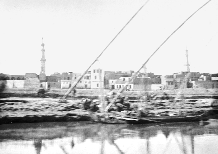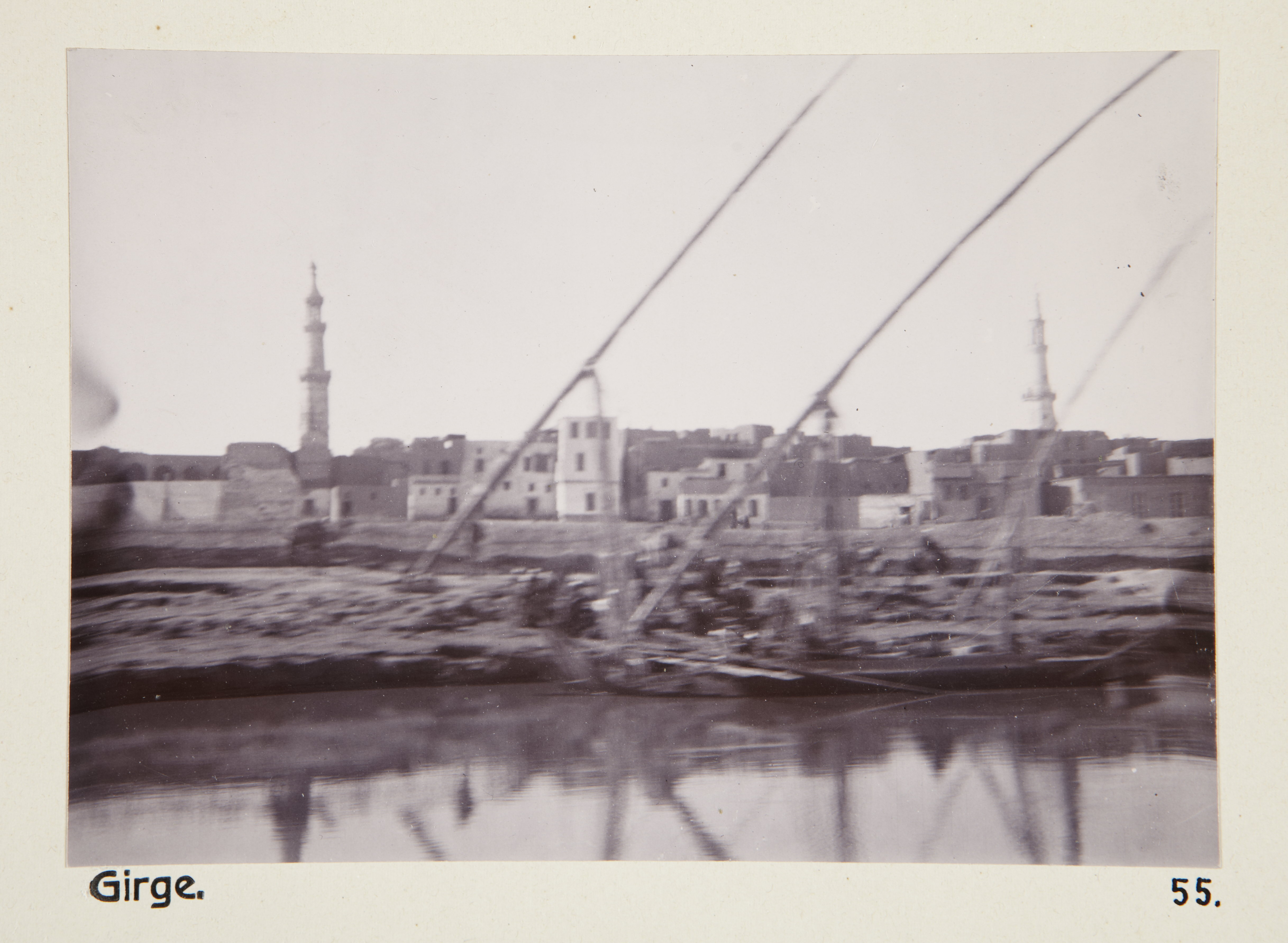 Jirja, Egypten. Text på fotografiet: Girge. Fotografierna LXVI:M.01.- 201. kommer från resan till Egypten och Sudan som Wilhelmina och Walther von Hallwyl gjorde vintern 1900-1901. De lämnade Sverige den 5 november 1900 och fortsatte från Egypten till Palestina den 28 mars 1901. Med på resan var döttrarna Ellen med maken Henric de Maré och Irma med maken Wilhelm von Geijer. Wilhelminas sällskapsdam, fröken Ida Uhse reste också med. Under en del av resan anslöt sig ledamoten av Internationella domstolen i Kairo, assessorn Otto Conrad Waldemar Cedercrantz med makan Anna Elisabeth. Vid resan uppför Nilen hade Walther von Hallwyl hyrt ångfartyget Columbia med besättning. Båtresan startade i Kairo 27 december 1900, gick ända till Wadi Halfa varifrån man reste vidare med tåg till Khartum och tillbaka till Wadi Halfa. Båten vände åter i riktning mot Kairo, men det verkar som att sällskapet tog tåg sista biten, från Luxor. Henric och Ellen de Maré samt fru Cedercrantz lämnade båten redan då de passerade Luxor första gången. Resten av sällskapet återvände till Kairo den 1 mars. Fotografierna LXVI:M.01.-120. togs av resenärerna själva, de största av Ellen de Maré, de mellersta av Wilhelmina von Hallwyl och de minsta av Wilhelm von Geijer. Resten köptes av professionella fotografer i Kairo, de flesta från Studio Photogr. Artistique G. Lekegian & Cie. Alla uppgifter kommer från Ida Uhses reseanteckningar.
