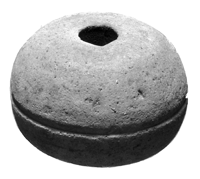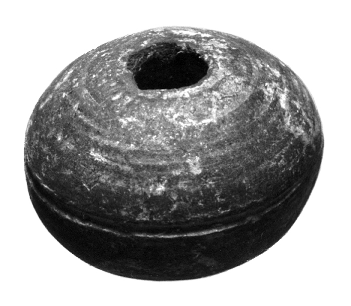 SLÄNDTRISSOR, oglaserade, fyra stycken Av gråsvart (två stycken), grått och rödbrunt lergods lergods. Hoptryckt kulformiga. Vid mitten en runtom gående horisontal ristad linje. Hålen för spindeln svagt konisk. Diameter: 2,5 och 2,9 cm, tjocklek: 1,7 och 2 cm