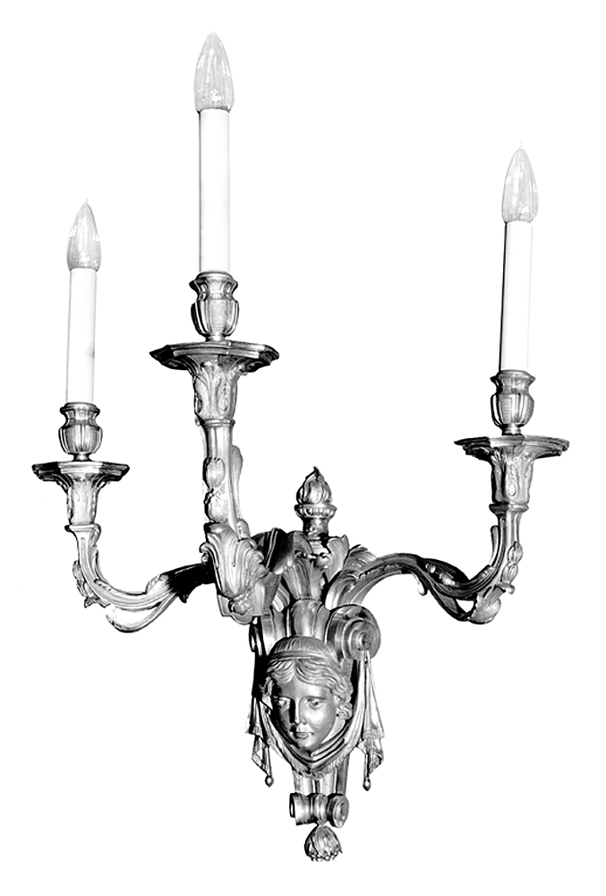 LAMPETTER, 2 st Av brons, förgylld i matt och blankt. Trearmade. Gjutna och ciselerade. Vardera bestående av ett avlångt väggstycke i vars mitt ett stort karyatidhuvud med lockigt hår samt omgivet av ett smalt draperi med hängande sidoflikar, ovanför detsamma ett stort volutornament; väggstyckets nedre ände volutformigt avslutad samt med en blad- och bärknopp, övre änden avslutad i en knopp i form av en eldslåga på kälformig hals, varpå en fyrbladig blomma. S-formade ljusarmar med droppskål och ljuspipa; vardera armens ytterdel rakt uppstående, den mellersta något högre; bladornament. Droppskålar starkt utsvängda, på kort fyrsidigt skaft samt med åttasidigt brätte. Lampetterna monterade för elektriskt ljus. Kopior efter antagligen franskt original från 1700-talets slut på Stockholms slott. Tillverkade efter beställning av Walther och Wilhelmina von Hallwyl hos Aktiebolaget Förenade Konstgjuterierna, Stockholm, 1898. Förgyllningen utförd hos juvelerarfirman J E Torsk, Stockholm, 1898. Komponerade på professor I. G. Clasons ritkontor efter lampetter D.a.15.