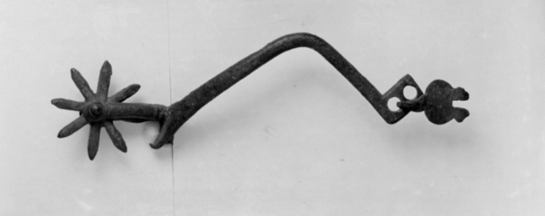 Sporre av stål. V-formade skänklar som baktill bildar en trubbig spets. Skänklarnas främre ändar är böjda i vinkel nedåt med rektangulära ytterändar med två runda hål vardera, i ett av hålen är fäst en plan stålbit, rest av spänne. Sporrhals, 38 mm lång, med stjärnformig klinga av stål med 8 taggar. Tillbehör: Papper kring ena skänkeln numrerad "inv. 2318 Öland".