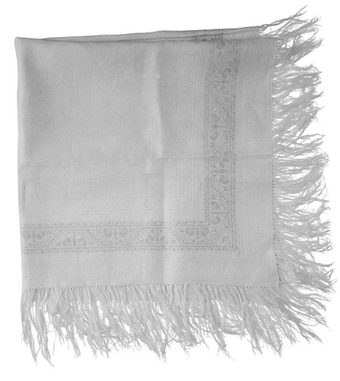 Prydnadsduk Av vitt frottéliknande linne med korssömsbroderi och frans.