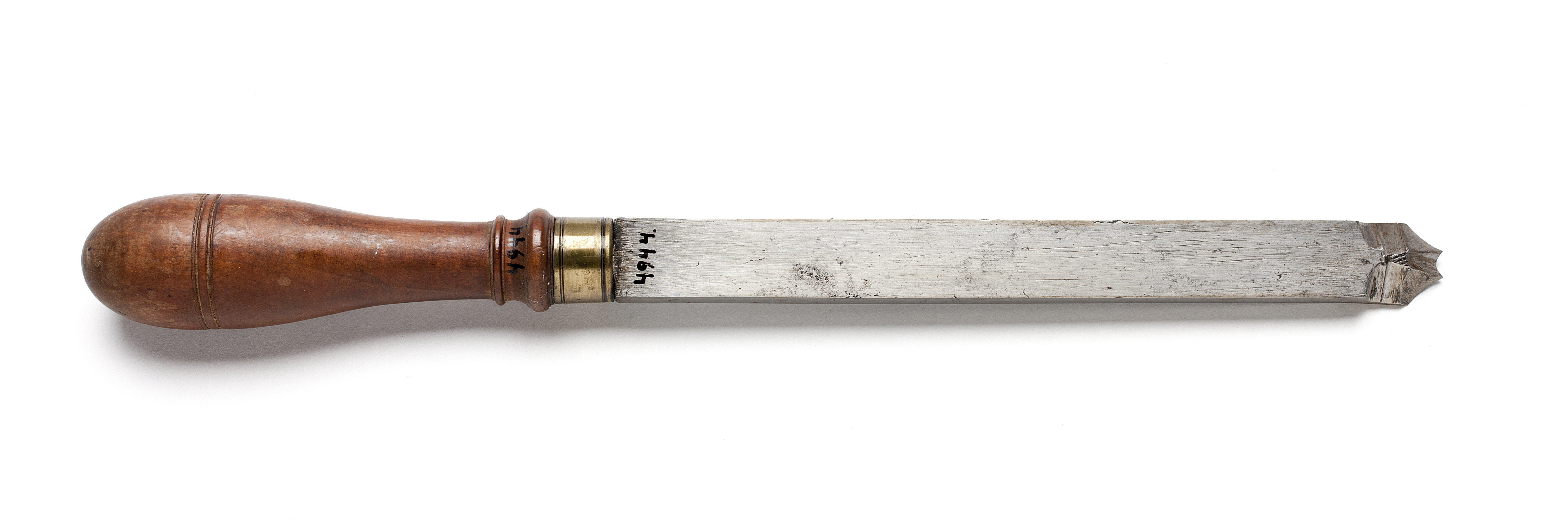 Klinga med rektangulär, i änden triangulär genomskärning. Spetsig egg med liten konkavitet i yttersta spetsen. Svarvat skaft av päronträ med två vulster nedtill ("skoklostertyp"). Mässingsring. Stämpel i skaftets ände vid fästet: tre punkter.