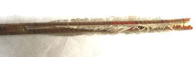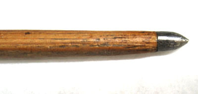 Spets i stål, L 8 mm. Konisk, något rundad med cirkulärt tvärsnitt. Skaft av ljust furuliknande trä med tydlig ådring. Baktill rester av vita styrfjädrar. Yttre delen lindad med svart tråd och målad i fyra fält, guld-brun-röd-brun. Ytterst tillskuret strängläge med två armar (skadade), målat i guld.
