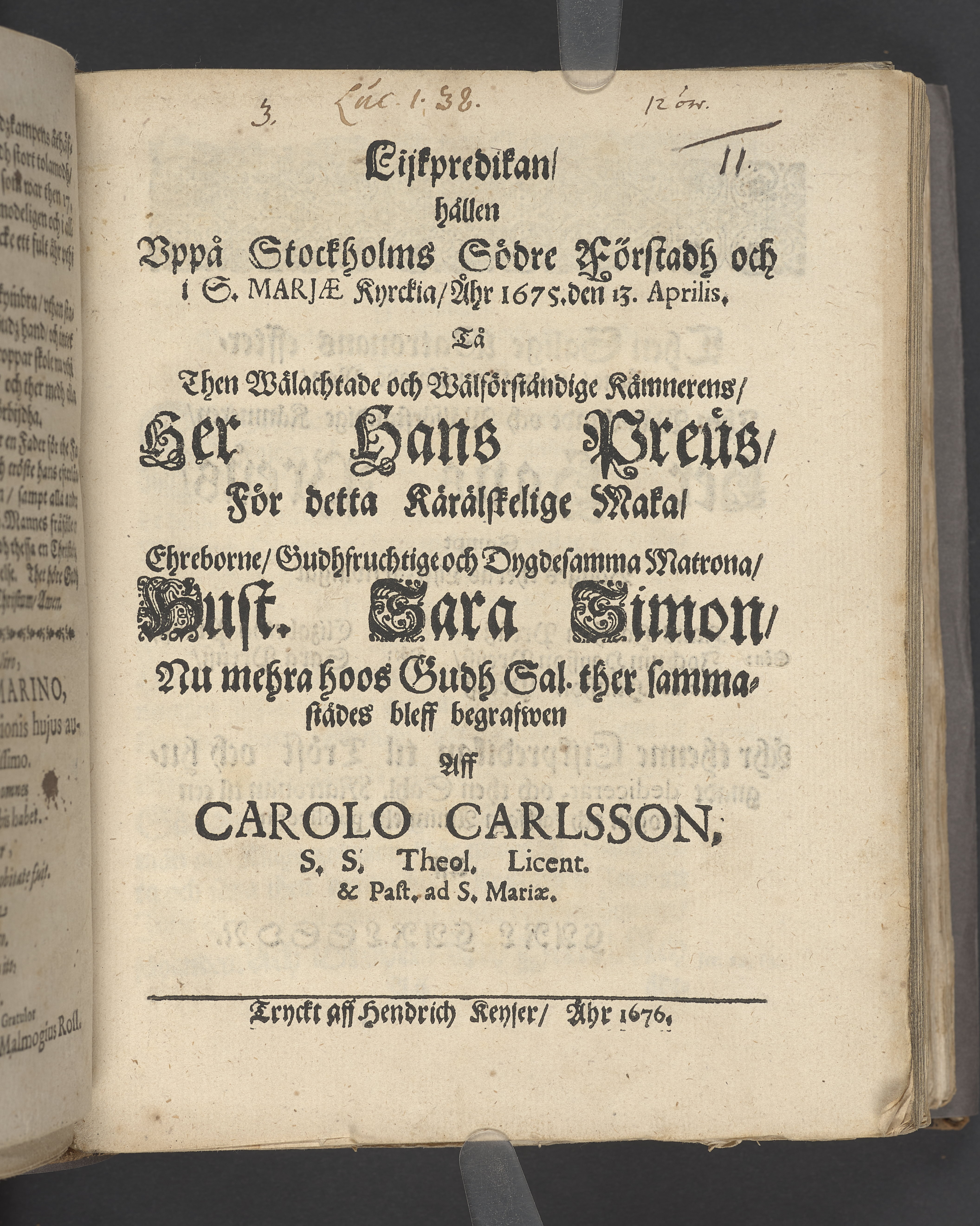 Lijkpredikan, hållen vppå Stockholms södre förstadh och i S. Mariæ kyrckia, åhr 1675. den 13 aprilis, tå ... Her Hans Preus, för detta kärälskelige maka ... hust. Sara Simon ... bleff begrafwen aff Carolo Carlsson ... Tryckt aff Henrich Keyser, åhr 1676.