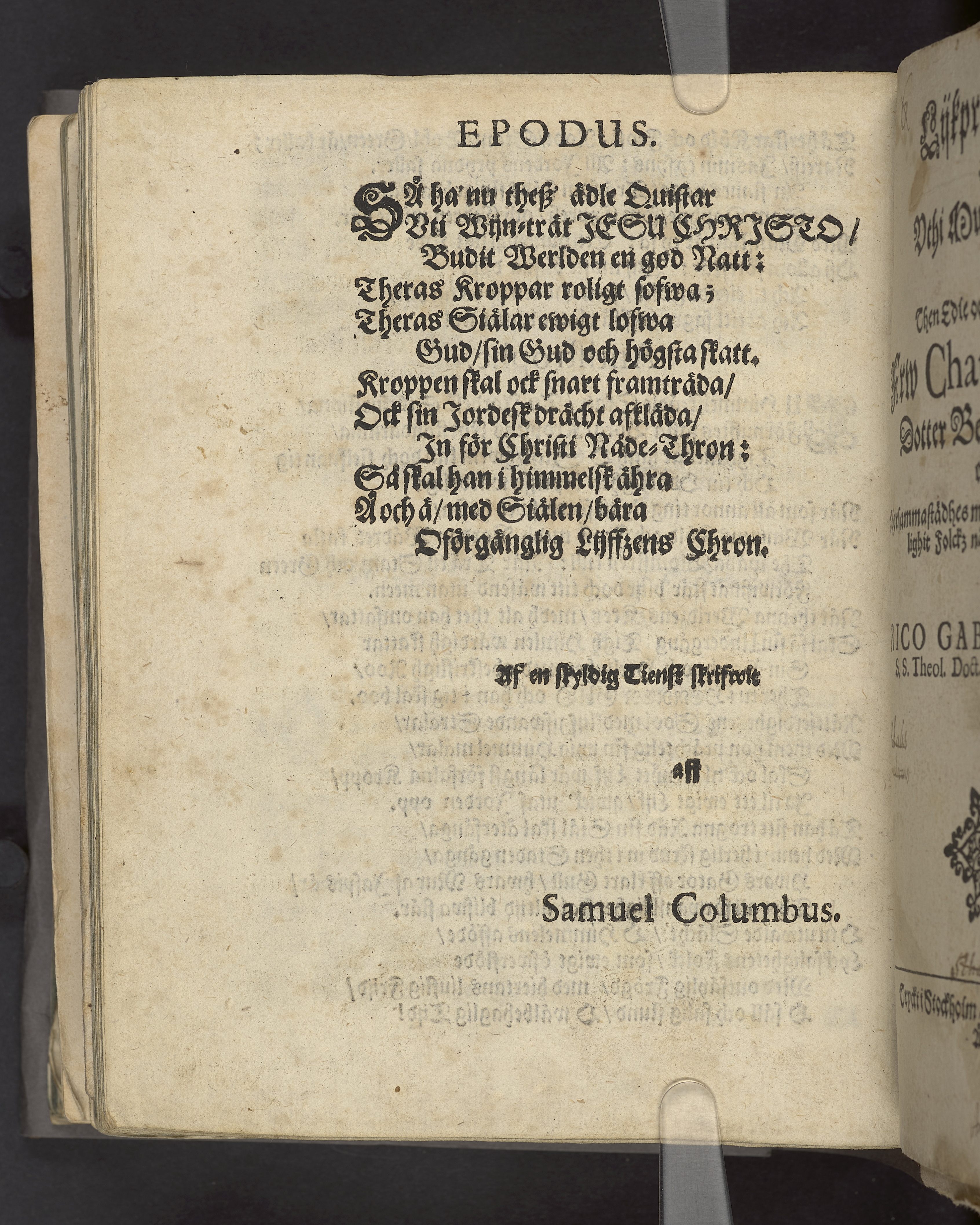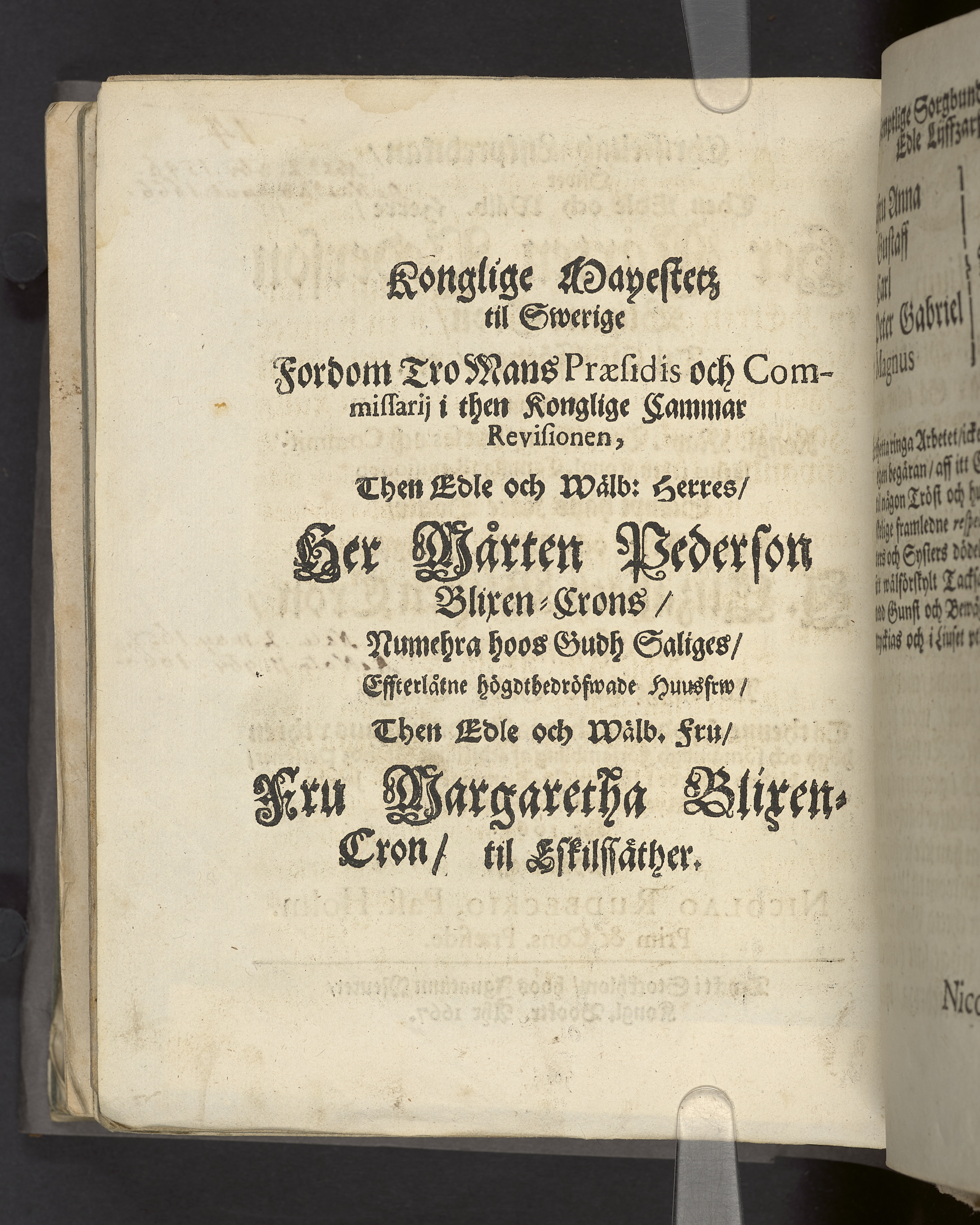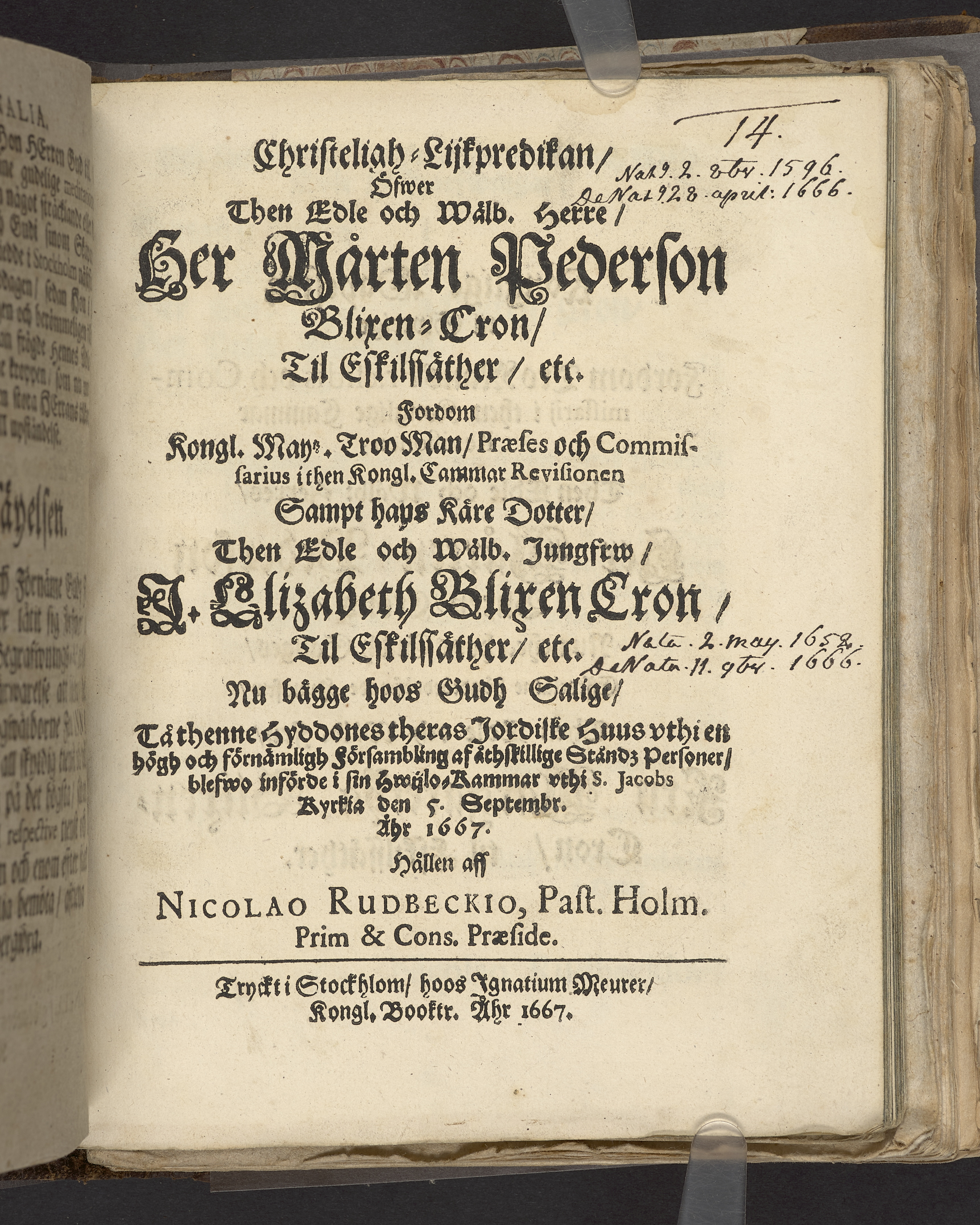 Christeligh-lijkpredikan, öfwer then edle och wälb. herre, Her Mårten Pederson Blixen-Cron, til Eskilssäter, etc ... sampt hans käre dotter, then edle och wälb. jungfrw, J. Elizabeth Blixen Cron, til Eskilssäther etc ... vthi S. Jacobs kyrkia den 5. septembr. åhr 1667. Hållen aff Nicolao Rudbeckio ... Tryckt i Stockhlom [!], hoos Ignatium Meurer, kongl. booktr. åhr 1667.