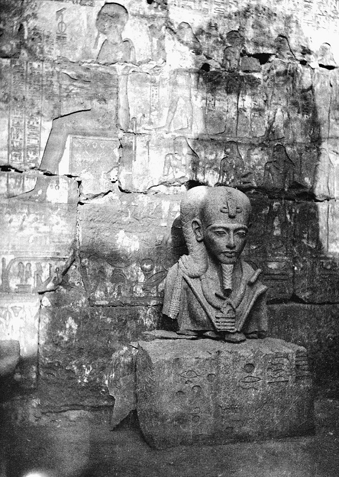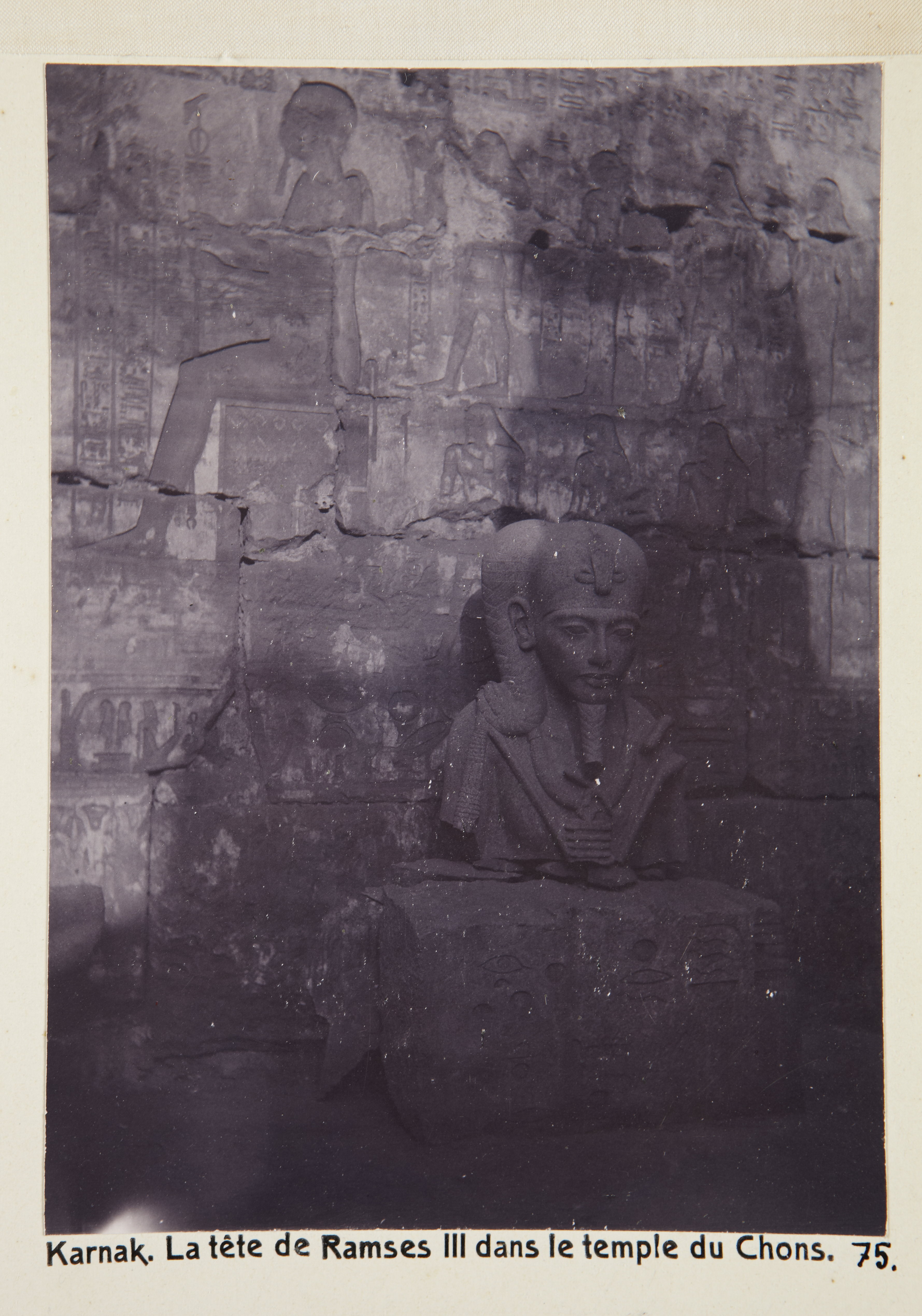 Ramses III:s huvud i Chons-templet. Karnak, Egypten. Text på fotografiet: Karnak. La tête de Ramsès III dans le temple du Chons. Fotografierna LXVI:M.01.- 201. kommer från resan till Egypten och Sudan som Wilhelmina och Walther von Hallwyl gjorde vintern 1900-1901. De lämnade Sverige den 5 november 1900 och fortsatte från Egypten till Palestina den 28 mars 1901. Med på resan var döttrarna Ellen med maken Henric de Maré och Irma med maken Wilhelm von Geijer. Wilhelminas sällskapsdam, fröken Ida Uhse reste också med. Under en del av resan anslöt sig ledamoten av Internationella domstolen i Kairo, assessorn Otto Conrad Waldemar Cedercrantz med makan Anna Elisabeth. Vid resan uppför Nilen hade Walther von Hallwyl hyrt ångfartyget Columbia med besättning. Båtresan startade i Kairo 27 december 1900, gick ända till Wadi Halfa varifrån man reste vidare med tåg till Khartum och tillbaka till Wadi Halfa. Båten vände åter i riktning mot Kairo, men det verkar som att sällskapet tog tåg sista biten, från Luxor. Henric och Ellen de Maré samt fru Cedercrantz lämnade båten redan då de passerade Luxor första gången. Resten av sällskapet återvände till Kairo den 1 mars. Fotografierna LXVI:M.01.-120. togs av resenärerna själva, de största av Ellen de Maré, de mellersta av Wilhelmina von Hallwyl och de minsta av Wilhelm von Geijer. Resten köptes av professionella fotografer i Kairo, de flesta från Studio Photogr. Artistique G. Lekegian & Cie. Alla uppgifter kommer från Ida Uhses reseanteckningar.
