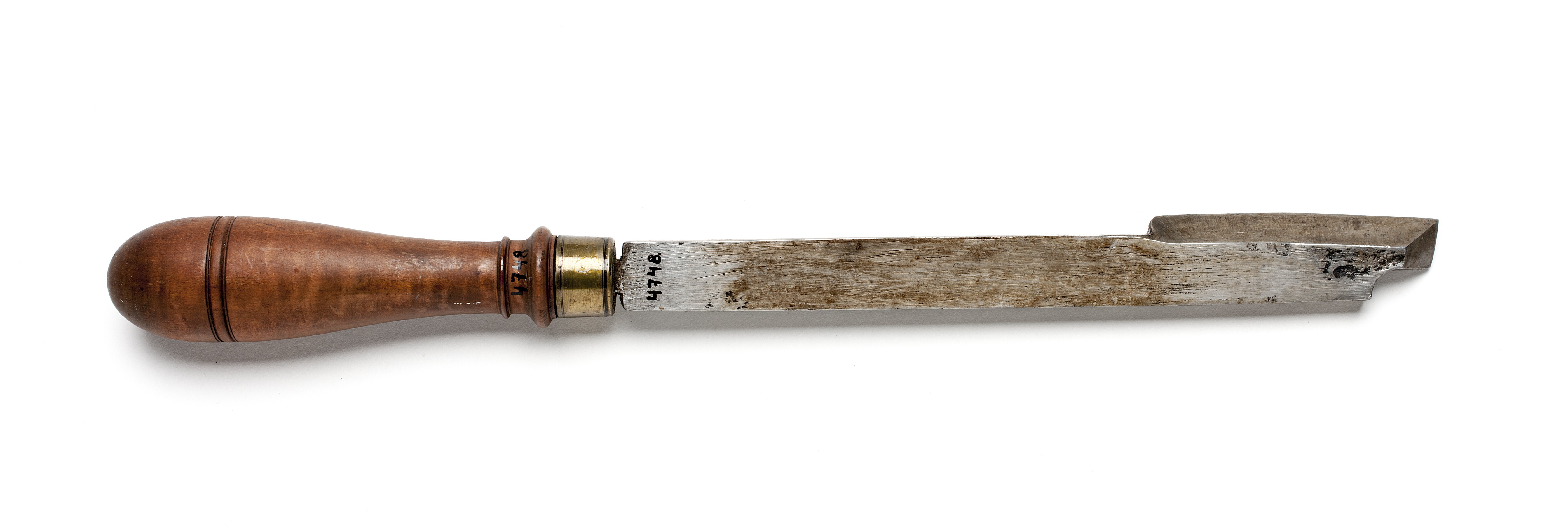Klinga med rektangulär genomskärning. Sned främre egg, sidoegg åt höger. Svarvat skaft av päronträ med två vulster nedtill ("skoklostertyp"). Mässingsring.