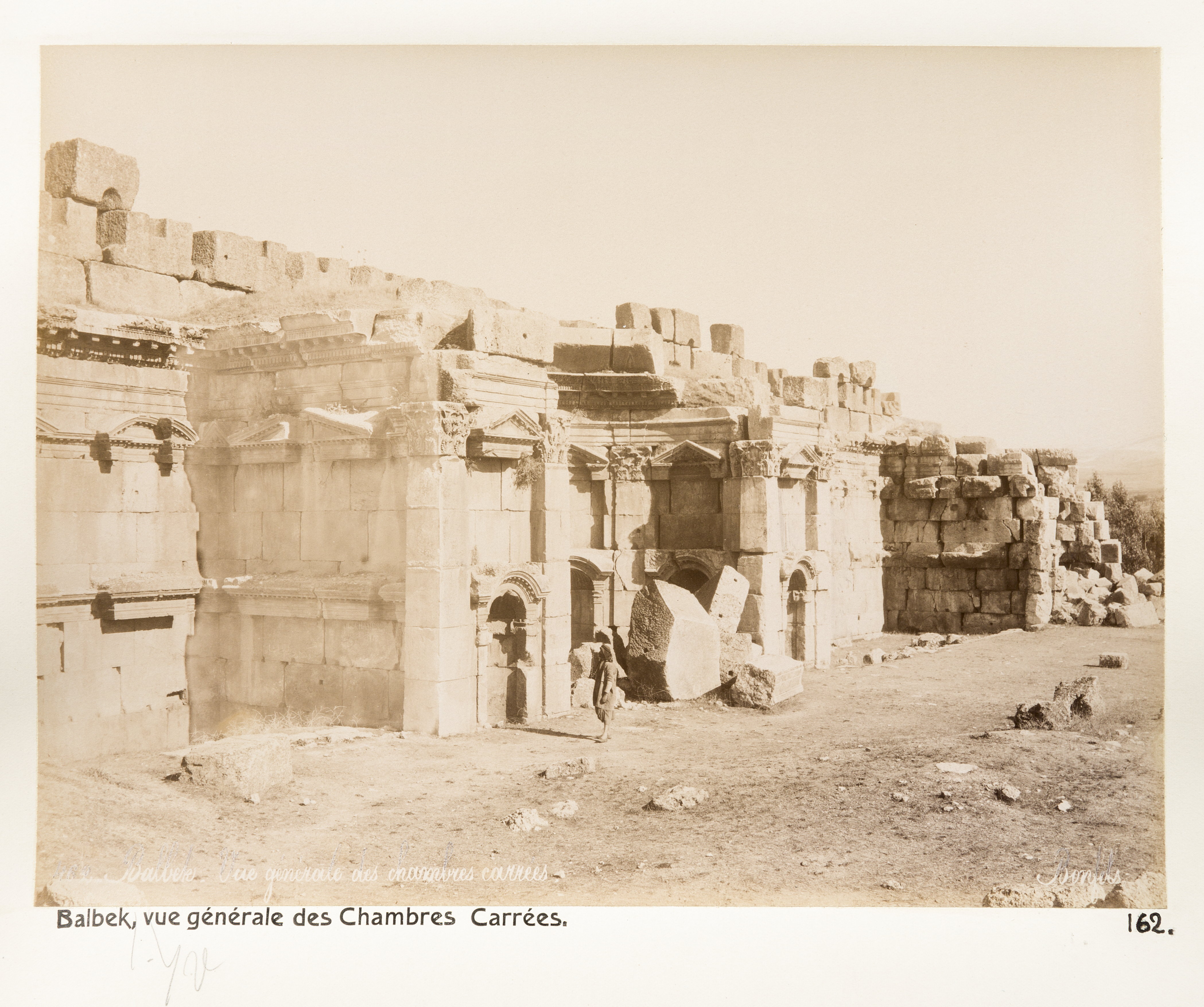 Vy över "Chambres Carrées" i Baalbek. Text på originalet: "Balbek, vue générale de Chambres Carrées." Fotografierna LXVI:N.01.-180. kommer från resan till Palestina och Syrien som Wilhelmina och Walther von Hallwyl gjorde den 30 mars-27 april 1901. De lämnade Sverige den 5 november 1900 för Egypten, där de stannade till den 28 mars 1901, då de fortsatte till Palestina. Med på resan var Wilhelminas sällskapsdam, fröken Ida Uhse. Den 27 april fortsatte de till Turkiet och Mindre Asien. De mindre fotografierna (utom de från Samos) LXVI:N.90.-100. är tagna av Wilhelmina själv, under en resa till häst från Jerusalem till Damaskus 8-20 april 1901. Övriga fotografier är inköpta av Wilhelmina i Jerusalem, Damaskus och Beirut. Alla uppgifter kommer från Ida Uhses reseanteckningar.
