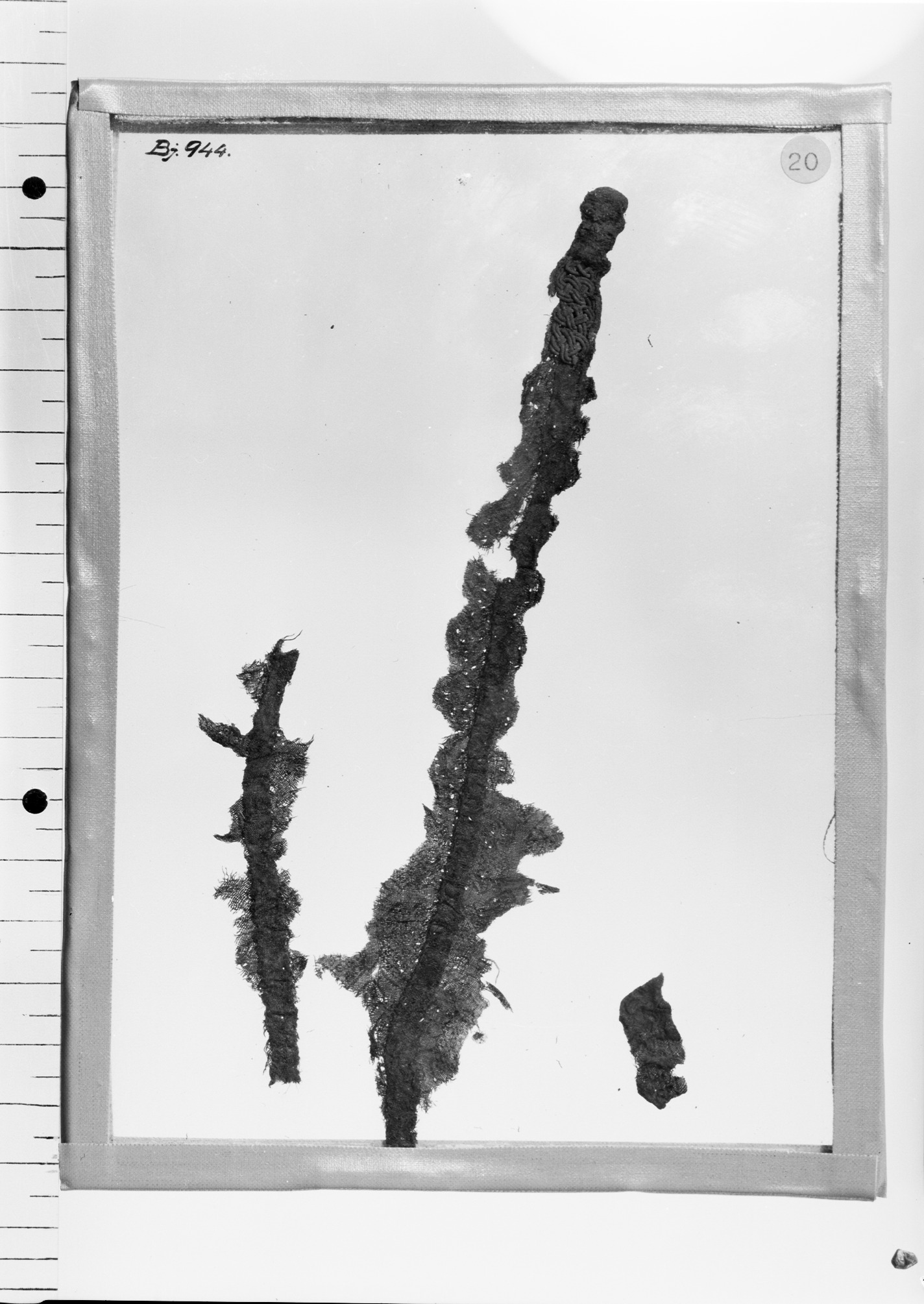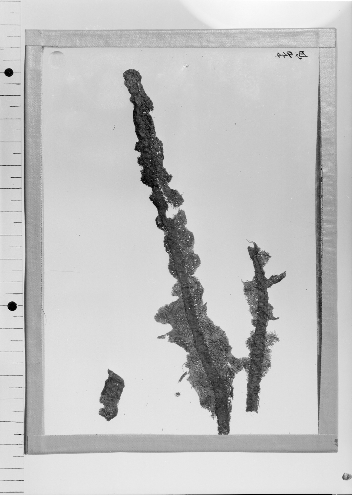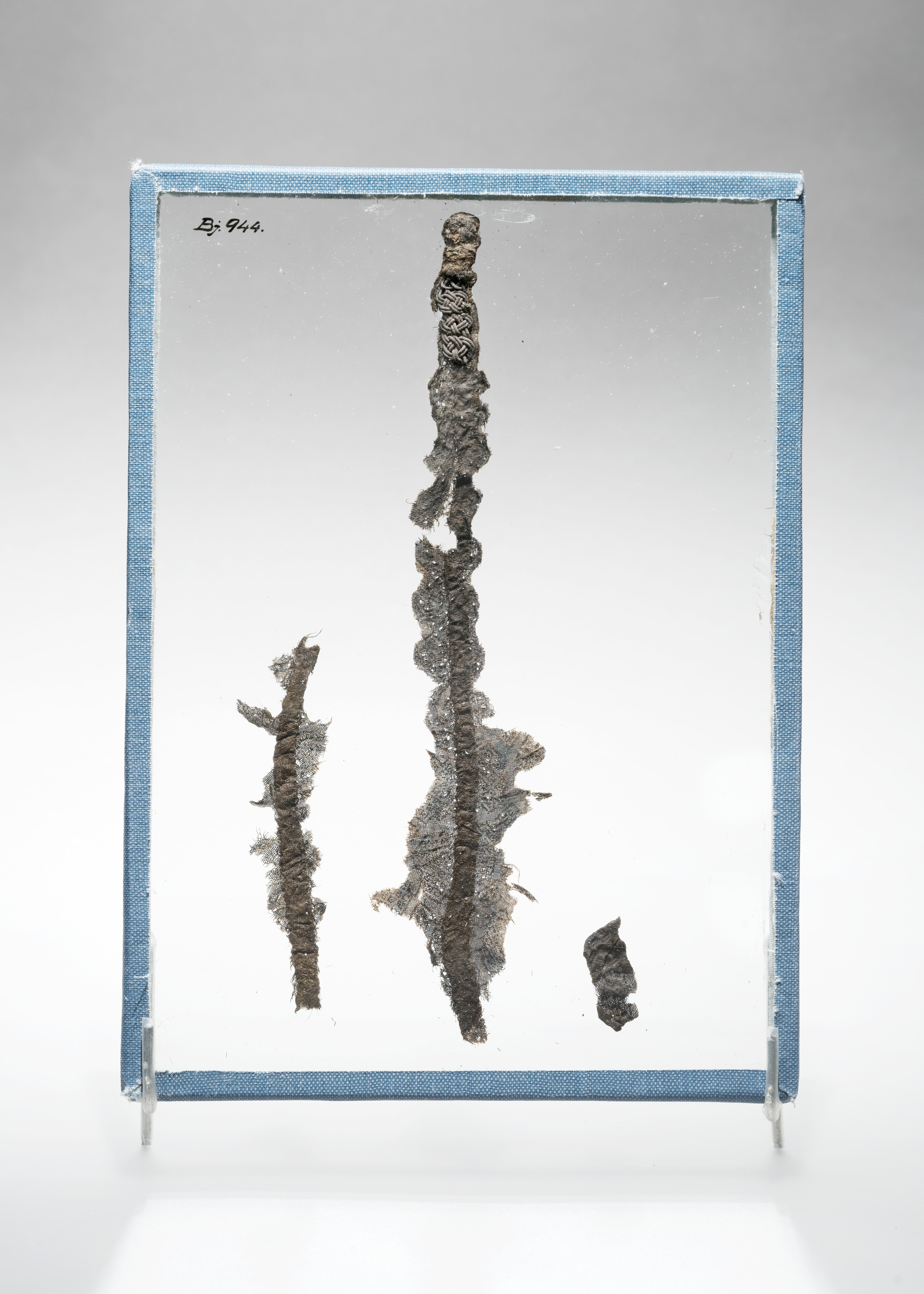 Hasplat råsilke tuskaftsväv med varpflottering, så kallad Han damast, geometriskt mönster omväxlande små kvadrater och trappformade avgränsande fyrkanter, ena trådsystemet blåfärgat, samt sidentyget målad eller tryckt med guld, från Kina tidig Tang dynasti (ca. 618-700 AD). Fastsydd över söm posamentfläta av spiralsilvertråd. Taf. 13:4