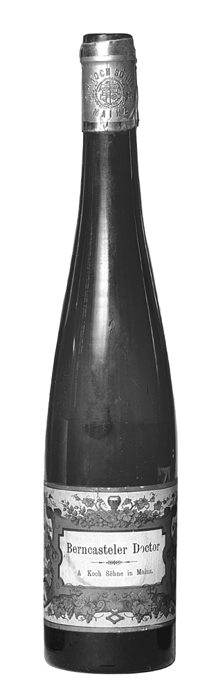 BERNCASTELER DOCTOR, fem helbuteljer Av blågrönt glas. Kägelformiga, med stärkring kring mynningen; bottnen skålig. Etikett med vitt mittfält, på detta i svart text med exportfirmans namn (A. Koch Söhne in Mainz), mittfältet inom ett konturerat ramverk i brunt, omgivet av vinrankor med löv och klängen i grönt samt druvklasar i brunt, upptill i mitten en remmare och en lyra i brunt, allt mot ljusgrön botten. Kapsylfragment av förtent bly, grönfärgat, på detsamma exportfirmans namn och varumärke i relief, upptill och nedtill en guldbård. Höjd: 35,8 cm.; diameter: 7,6 cm.