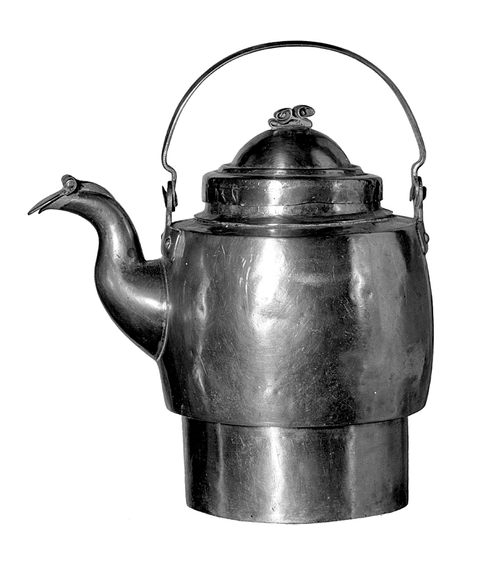 KAFFEPANNA Av koppar, inuti förtent. Rund, bukig, med tvärt indragen skuldra, pip, handtag (grepe) och trycklock. Nedre delen cylindrisk, tvärt indragen från den övre samt bildande en flänsliknande avsats; botten plan; kring mynningen en rakt uppstående sarg för locket, fastlödd vid skuldran; stommen hopsatt baktill medelst en vertikalt gående slaglodslödning med tungor, botten insatt medelst en lödning som den sistnämnda; pipen rund, S-formad och avsmalnande uppåt, med snett avskuren mynning, täckt av ett fällock; handtag av platt skena, bågformigt, utsidan med fasade kanter, ändarna tvärt inböjda, med rundat utvidgade ytterändar, handtaget rörligt på nitar, fästa vid två rakt uppstående öron, utgående vartdera från en nedanför skuldran liggande rektangulär flik, fäst med två nitar. Lock högt kupigt, med utanpågående, rakt nedvikt sarg; på hjässan i mitten en med en nit fäst plåtremsa med ändarna hoprullade och uppböjda mot varandra som handtag. Höjd, med lock: 20,7 cm., utan lock: 16,8 cm.; diameter: 14,5 cm. Lock, höjd: 5 cm.; diameter: 9,4 cm. Svensk tillverkning, Stockholm; J. & C. G. Bolinders Mekaniska Verkstads AB.
