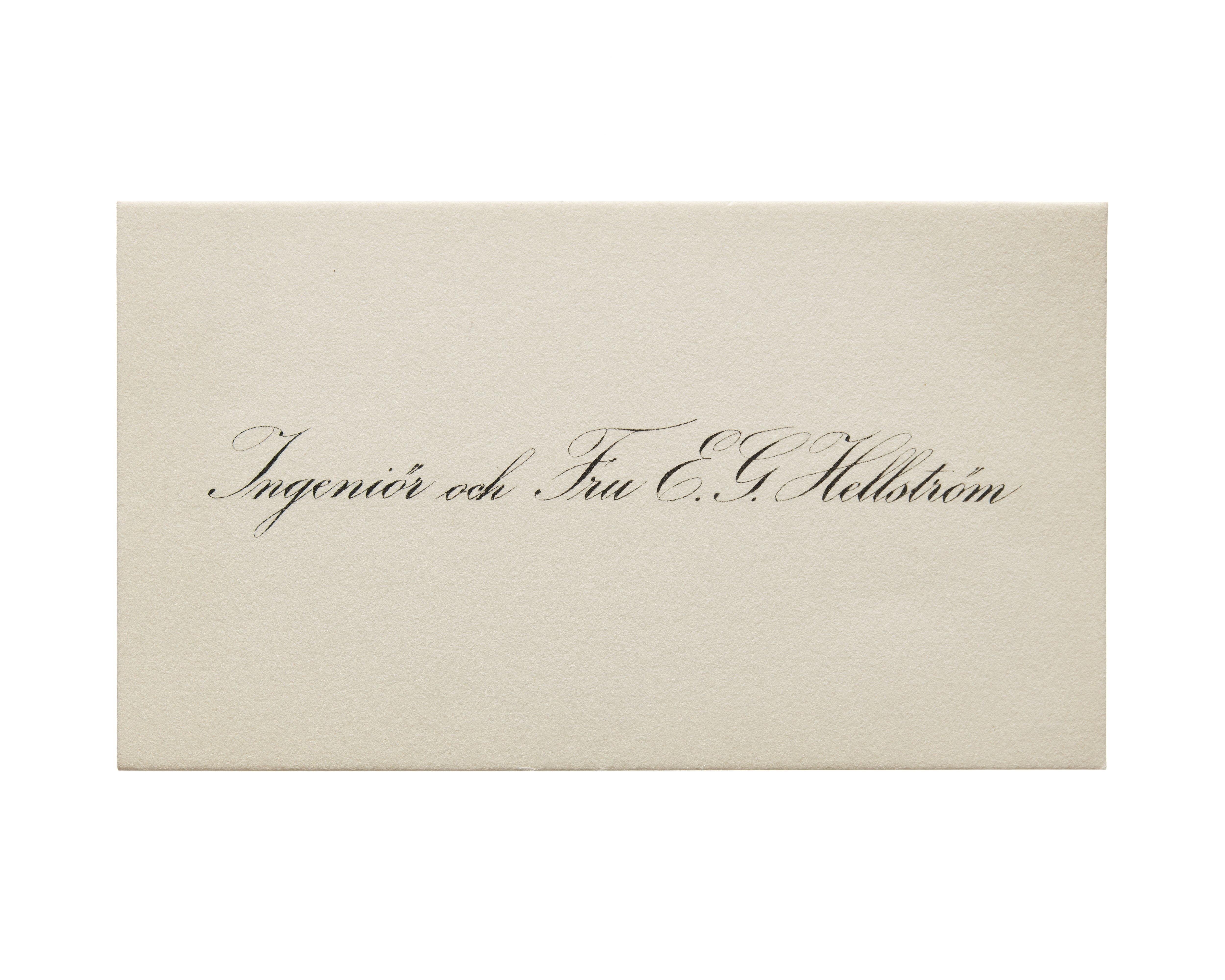 Fem visitkort från Ingeniör Ernst Hellström och Fru Hellström. Första kortet daterat 1921. Handskrift "Med djupaste deltagande". Andra kortet daterat 1921. Tredje kortet daterat 1923. Fjärde kortet daterat 1924. Femte kortet daterat 1925.