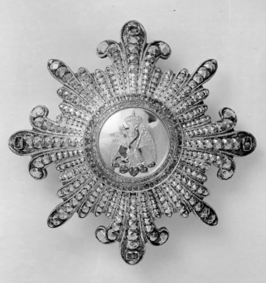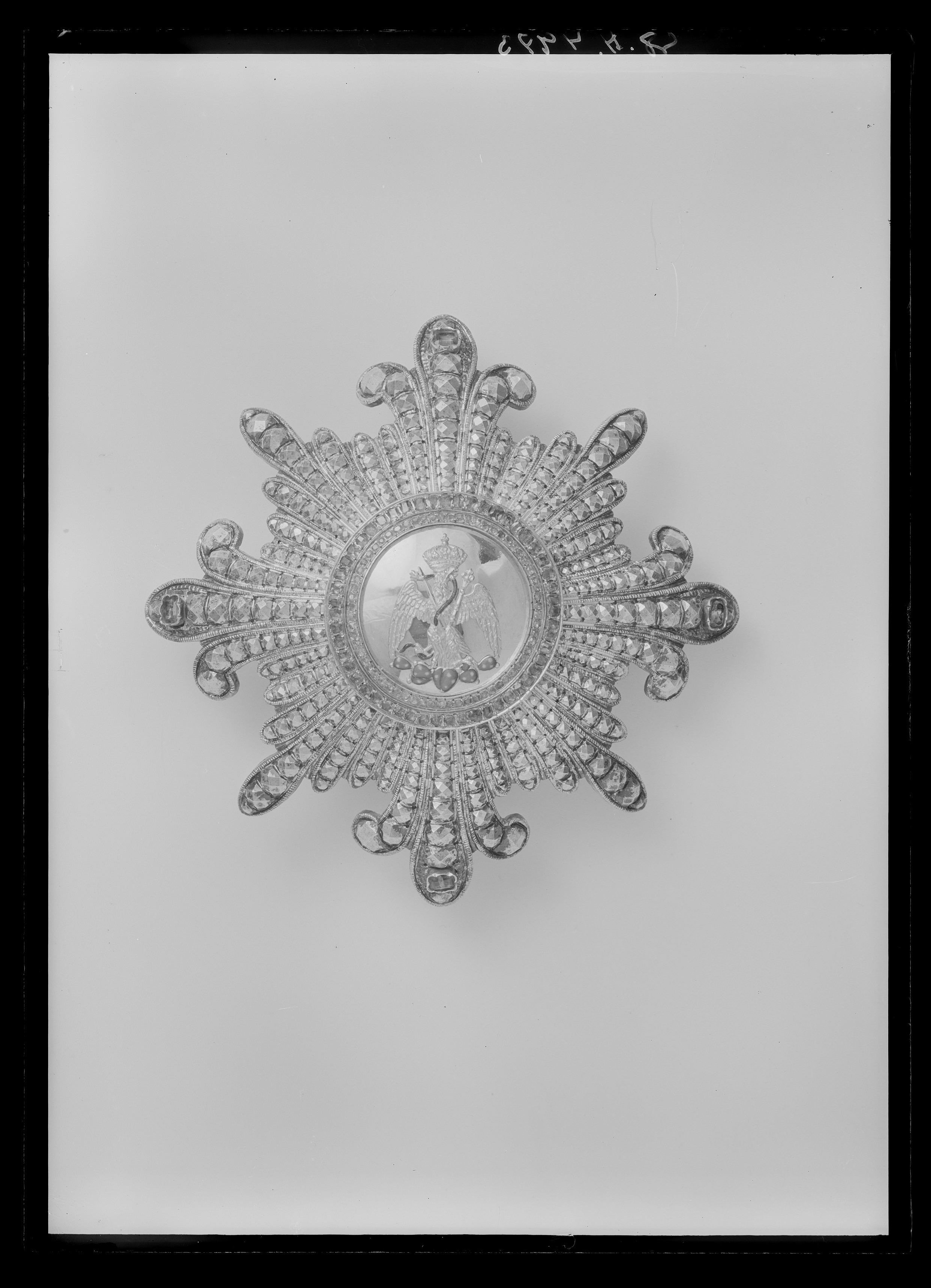 Åttauddig, flinkerad strålstjärna av silver, åtta strålar utåt, bakåtböjda och bildar med mellanliggande strålar franska liljor, på mittstrålen en grön sten i avdeckt fattning av guld. Medaljong av guld (?), svagt välvd, därpå fäst en krönt örn av guld, sittande på en grönemaljerad nopalbuske, i kors framför örnen ett svärd och en spira, runt örnen slingrar en brun-grönemaljerad orm, som örnen biter över med näbben. Runt medaljongen två ringar, den inre besatt med 64 röda stenar, den yttre med 52 gröna stenar. På medaljongens frånsida en liggande oval silverplatta med relieftext: "N.o 46 // KRETLY // PALAIS ROYAL // PARIS". Vertikalt placerad säkerhetsnål samt två hakar av silver.