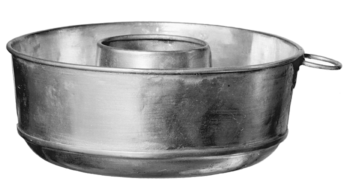 KAKFORM Av bleckplåt. Nästan cylindrisk, med vulstig bottenring och grovt, svagt koniskt mittrör, sargen medelst två tvärgående falsar hopsatt av två stycken; kring brädden en utstående stav, nedanför denna vid ena tvärfalsen en rundstavig ring, rörlig i en med två nitar fäst omvikt plåtflik; botten fastfalsad vid sargen, mittröret med längdgående fals samt kring övre kanten en inåt utstående stav. Höjd: 6,7 cm.; diameter: 17 cm.