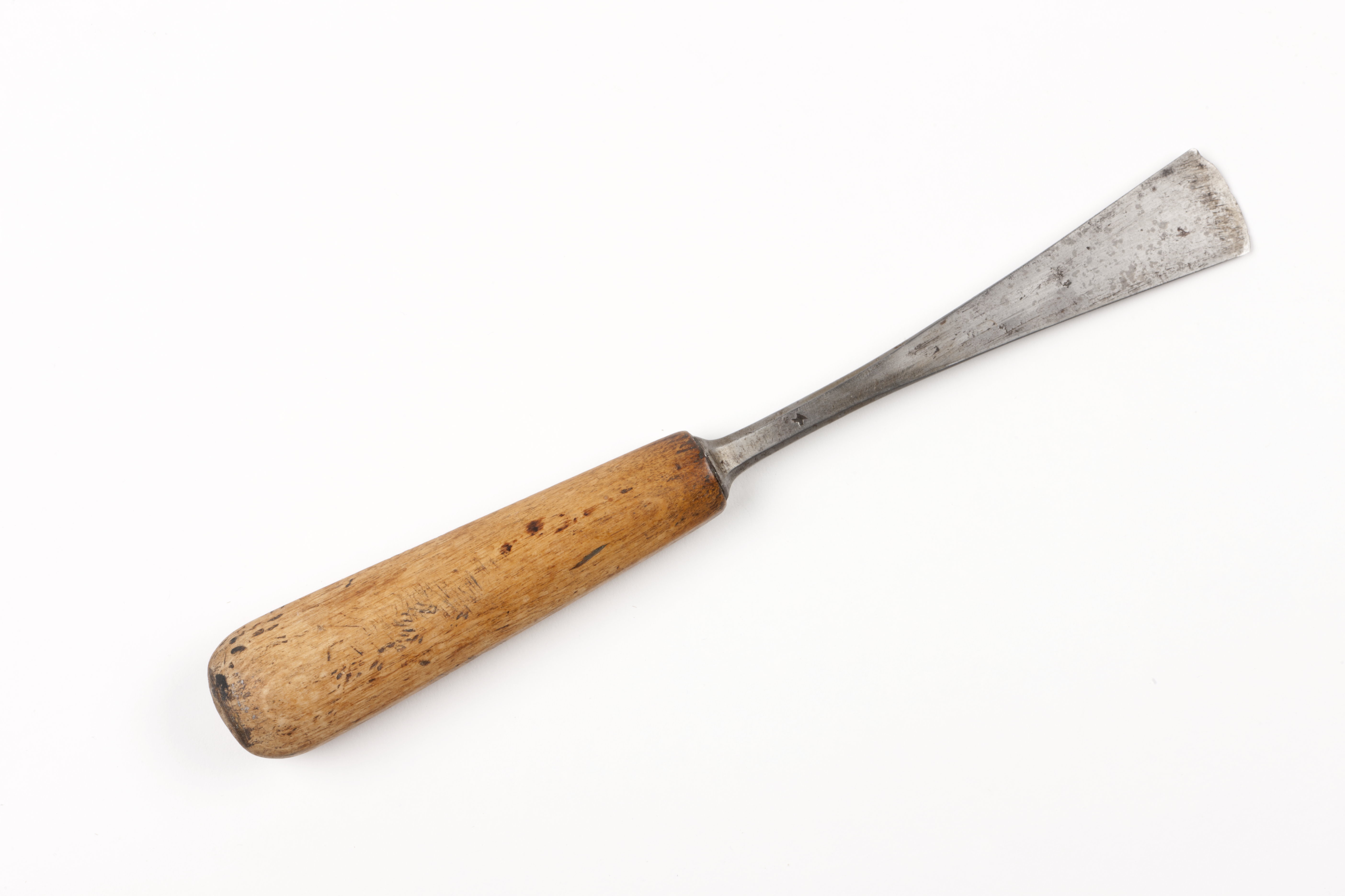 Klinga med rektangulär genomskärning, avfasade kanter. Märkt på stålet: "4". I änden rundad undersida, svagt hålig ovansida. Rundad egg, vidgad bas. Skuret skaft av lövträ, ovalt med plana kortsidor.