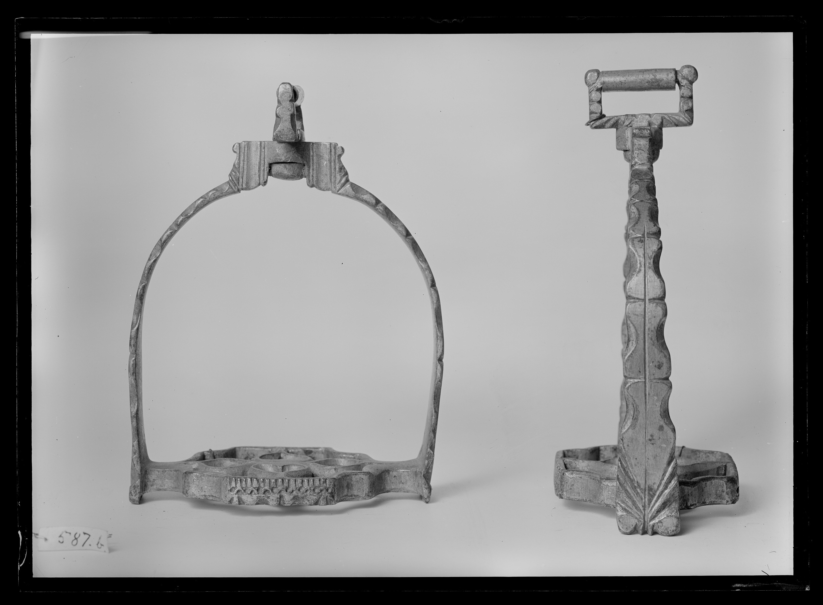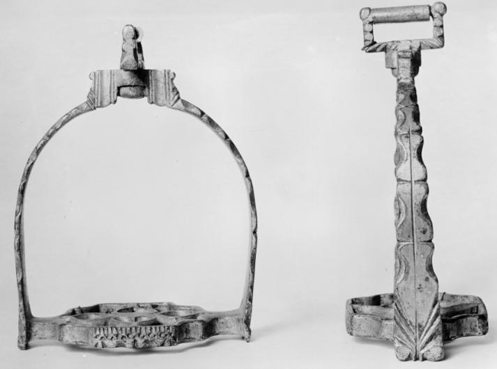 U-formad bygel. Skänklarna med balusterformade avsatser. Nedtill v-formade infilningar. Upptill, där skänklarna möts, ett förhöjt, bredare parti med vertikal streckdekor. Tvärställd, rektangulär, fast remögla med profilerad kant och löphylsa. Trampstöd sexsidigt. Sidorna närmast skänklarna uppdelade i två inbuktningar. Gallerverk av två motsatta hjärtan och två motställda öglor. Två raka sidor med dekor av vertikala streck och vågband.