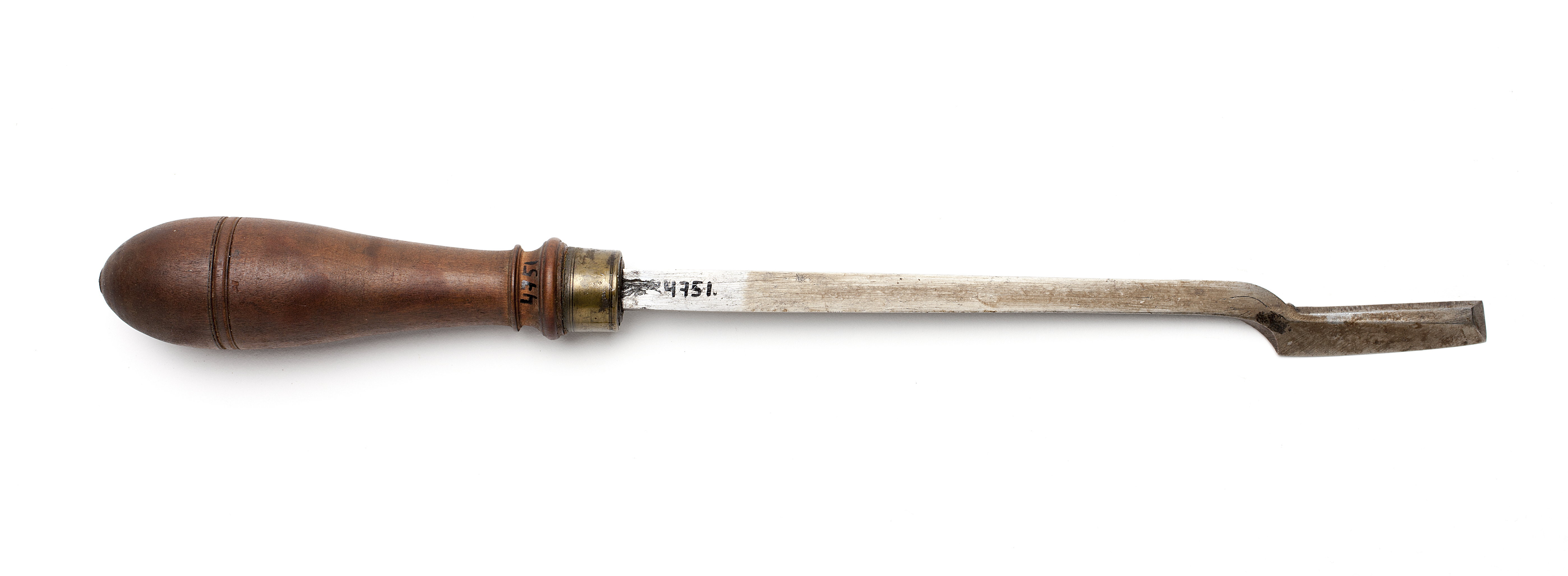 Klinga med rektangulär genomskärning, via lätt böjning övergående i trapetsoidisk genomskärning. Rak främre egg och sidoegg. Svarvat skaft av päronträ med två vulster nedtill. Mässingsring.