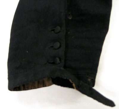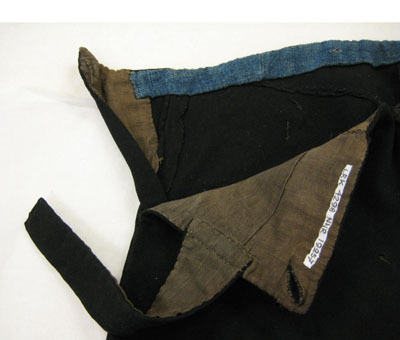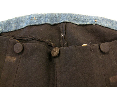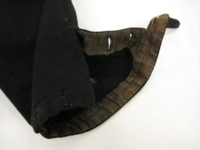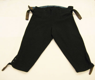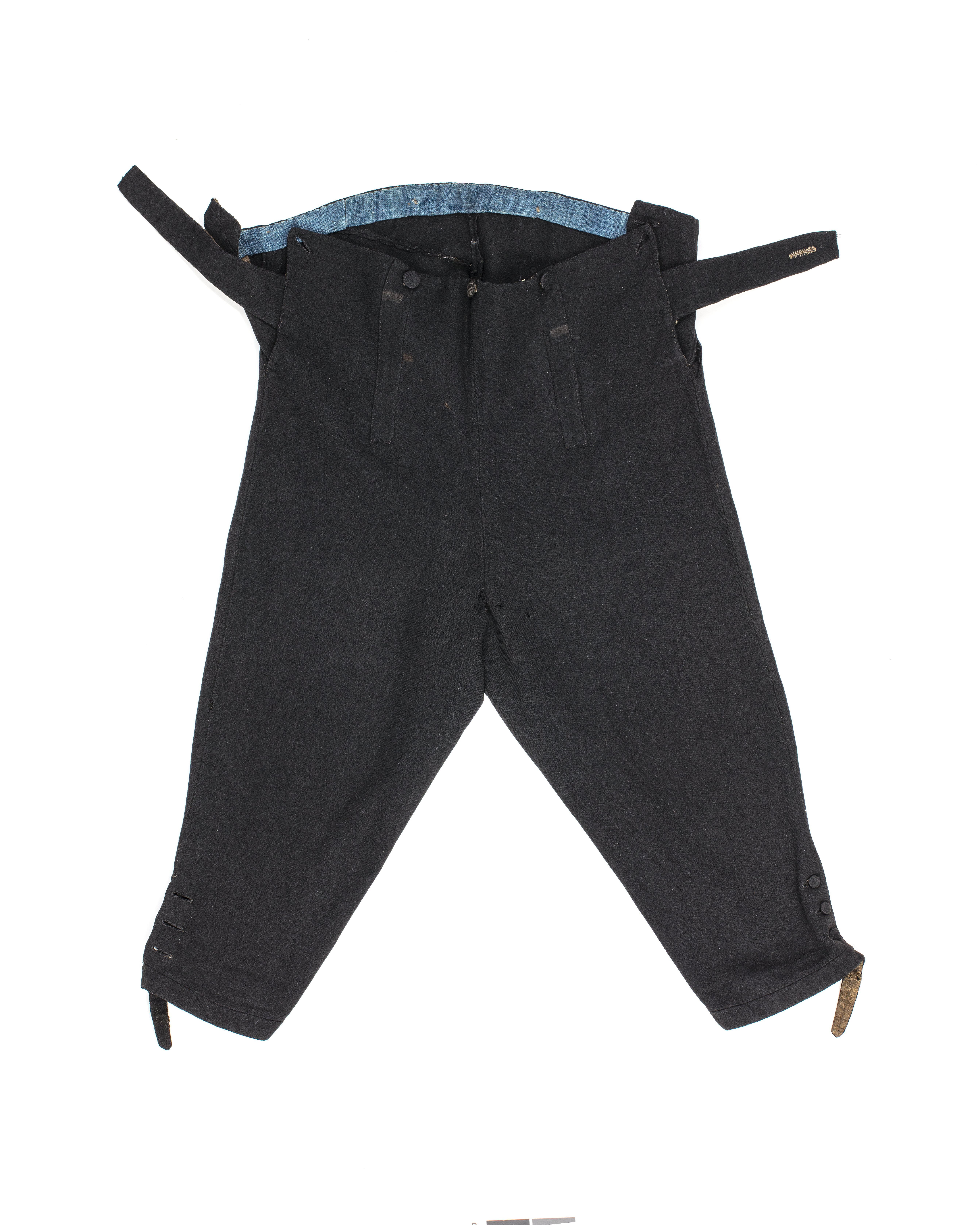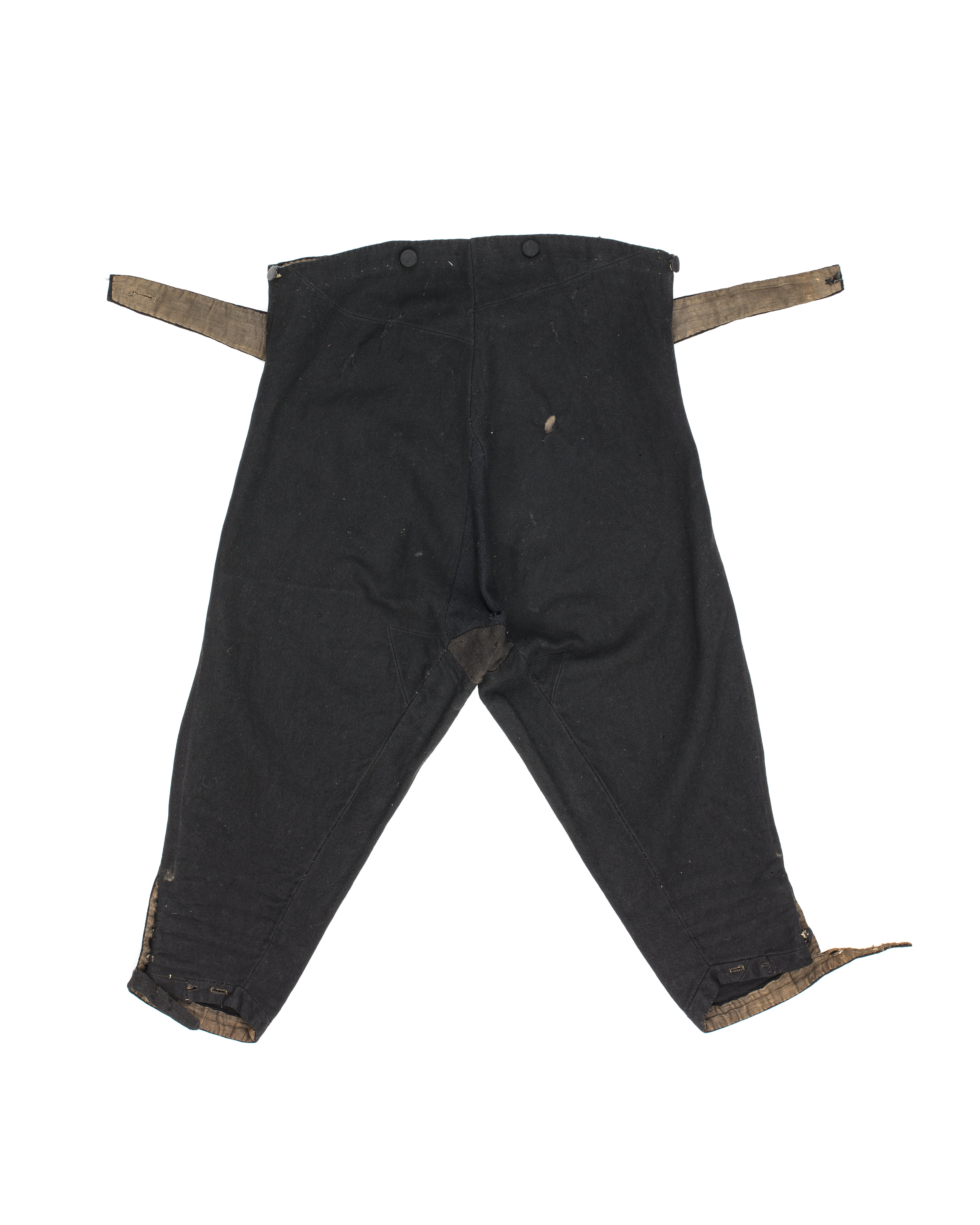 Knäbyxor sydd av svart kläde, lucka fram med sprund vid sidan, 340 mm lång, med knappslå som är 200 mm lång och 50 mm bred. På höger knappslå är en hake fastsydd och på vänster är ett sytt knapphål som är 23 mm bred. Invändigt bak på midjebandet är en förstärkning av blått linnetyg vävt av tuskaft. På framsidans midjeband är tre knappar där av två stycken beklädda med tyg och en beklädd med svart spets med ett mönster av en stjärna. En knapp på varje sida på midjebandet är fastsydd. Baktill vid svanken är två stycken ojämna kilar insydda. Själva byxbaken har insydda kilar av avvikande tyg antagligen linne samt en kil av stickat tyg. På varje byxben är ett sprund som är 100 mm långt med tre knappar beklädda med tyg samt tre sydda knapphål. Byxbenens bak har två sydda knapphål. Byxbenets nedre kant är 300 mm i omkrets och 20 mm bred och invändigt beklädd med brunt tyg av linne.