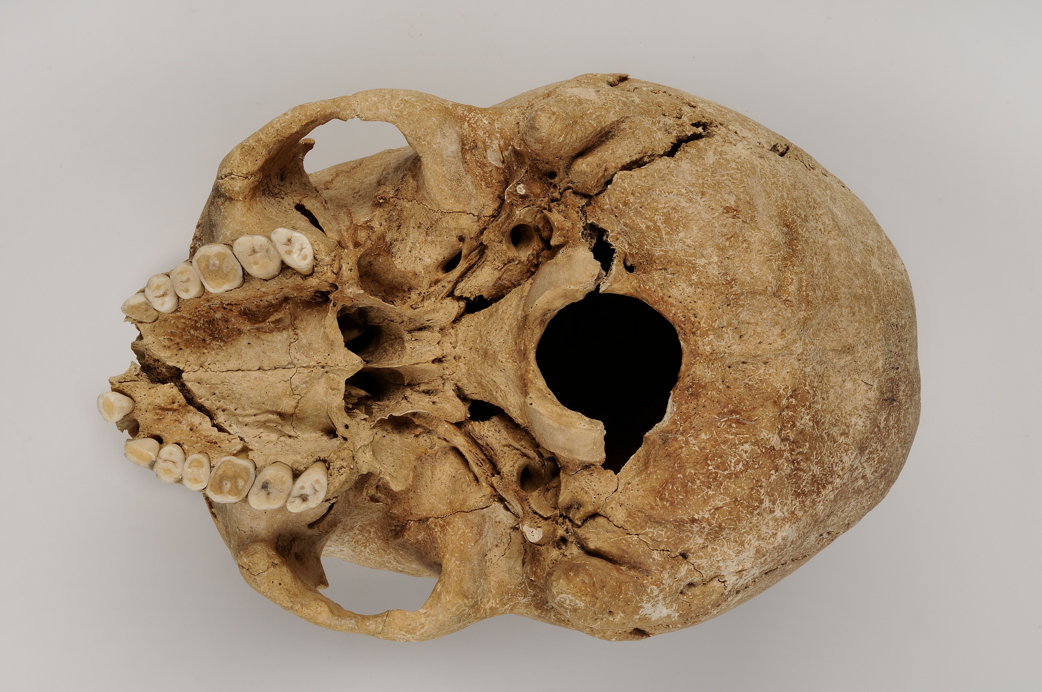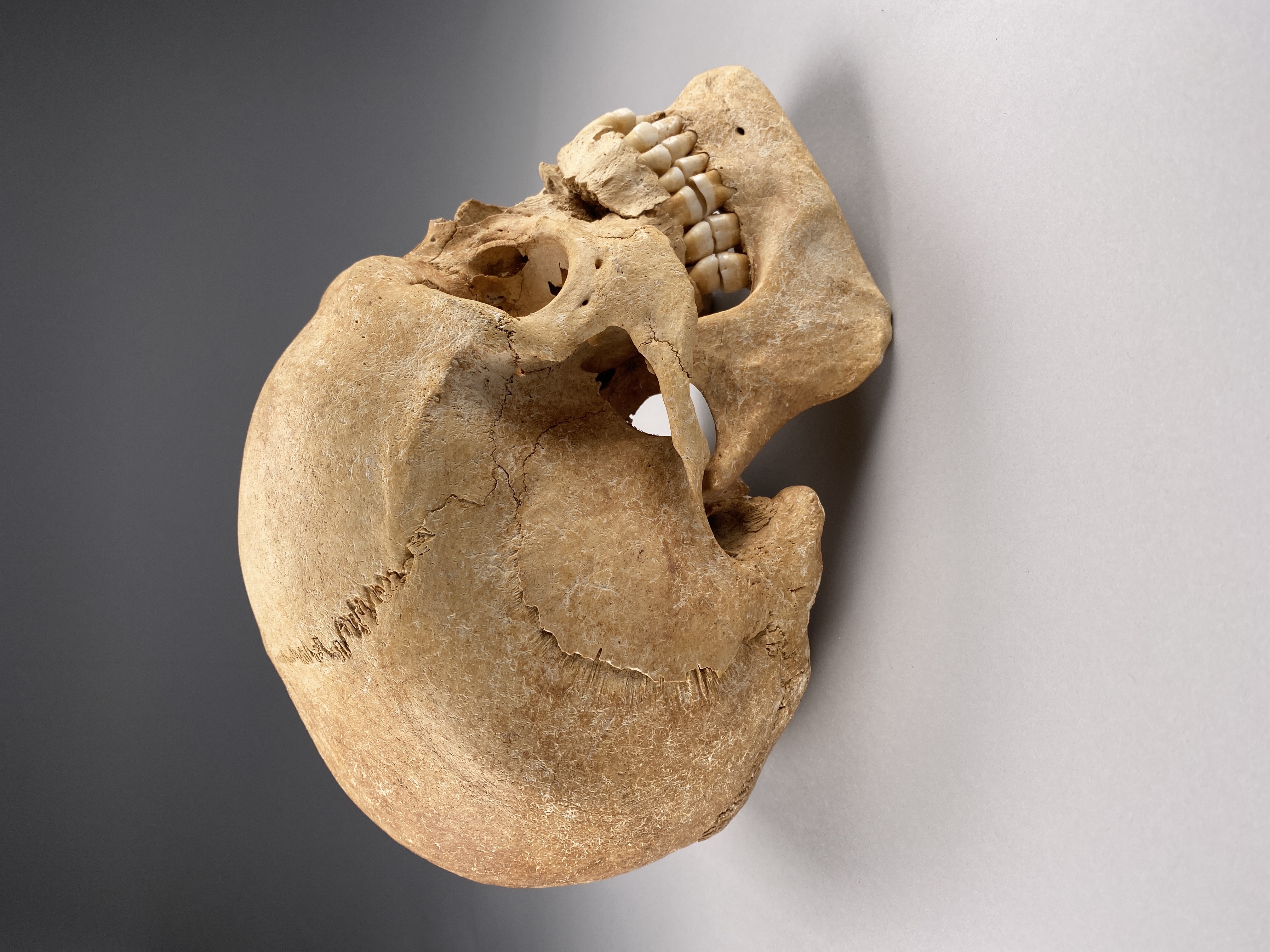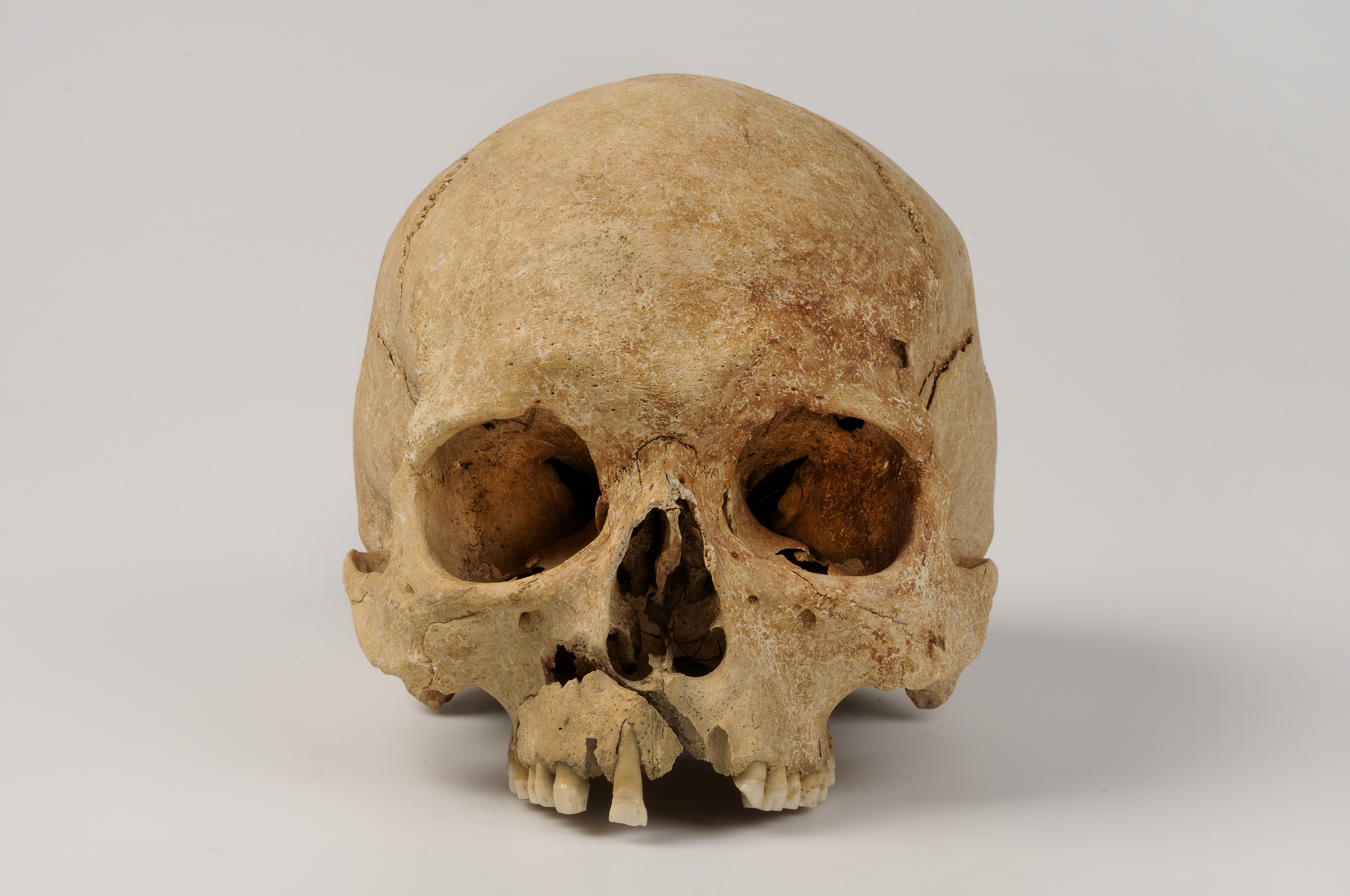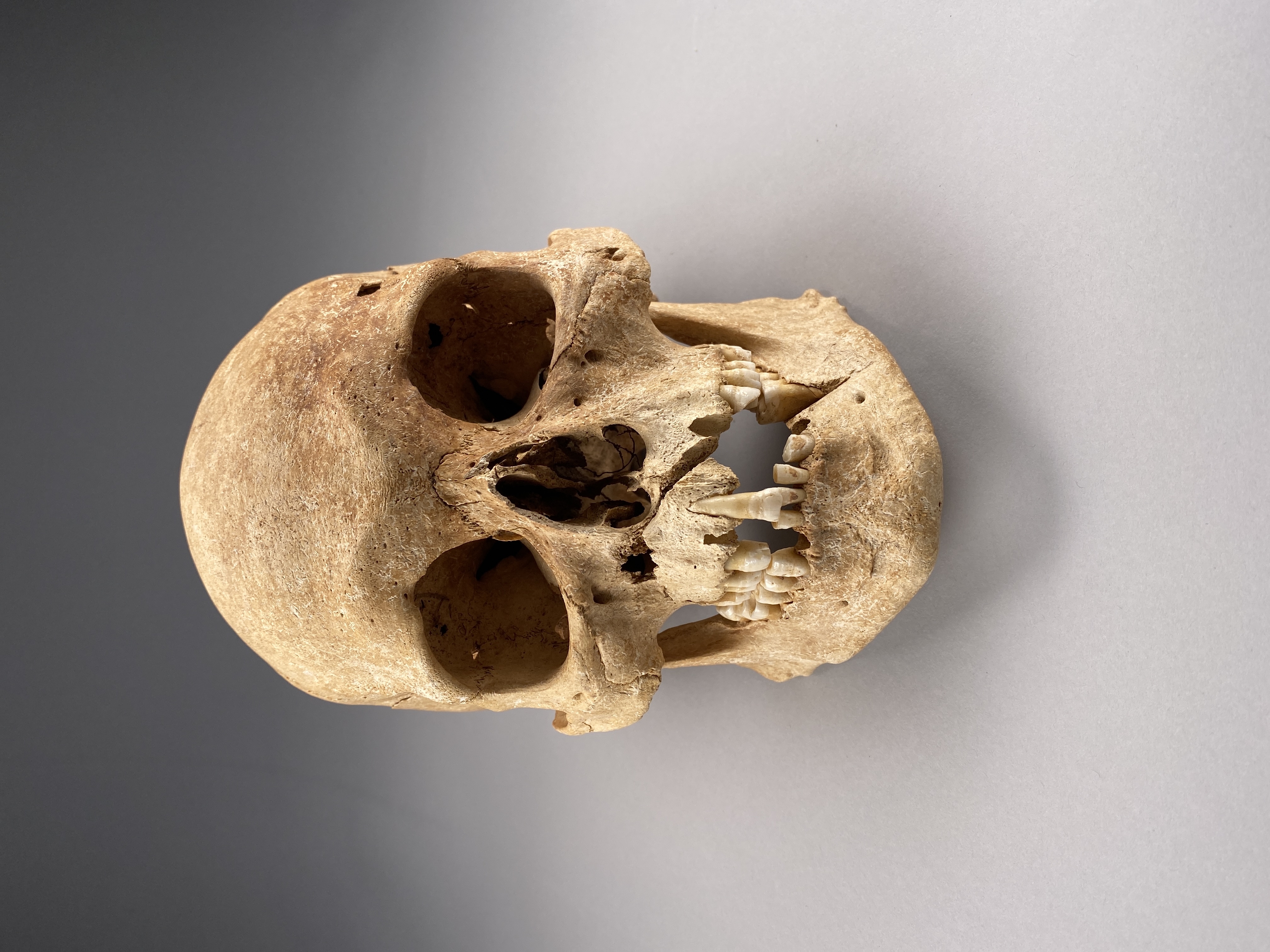 Kranium med spår efter hugg genom överkäke och underkäke