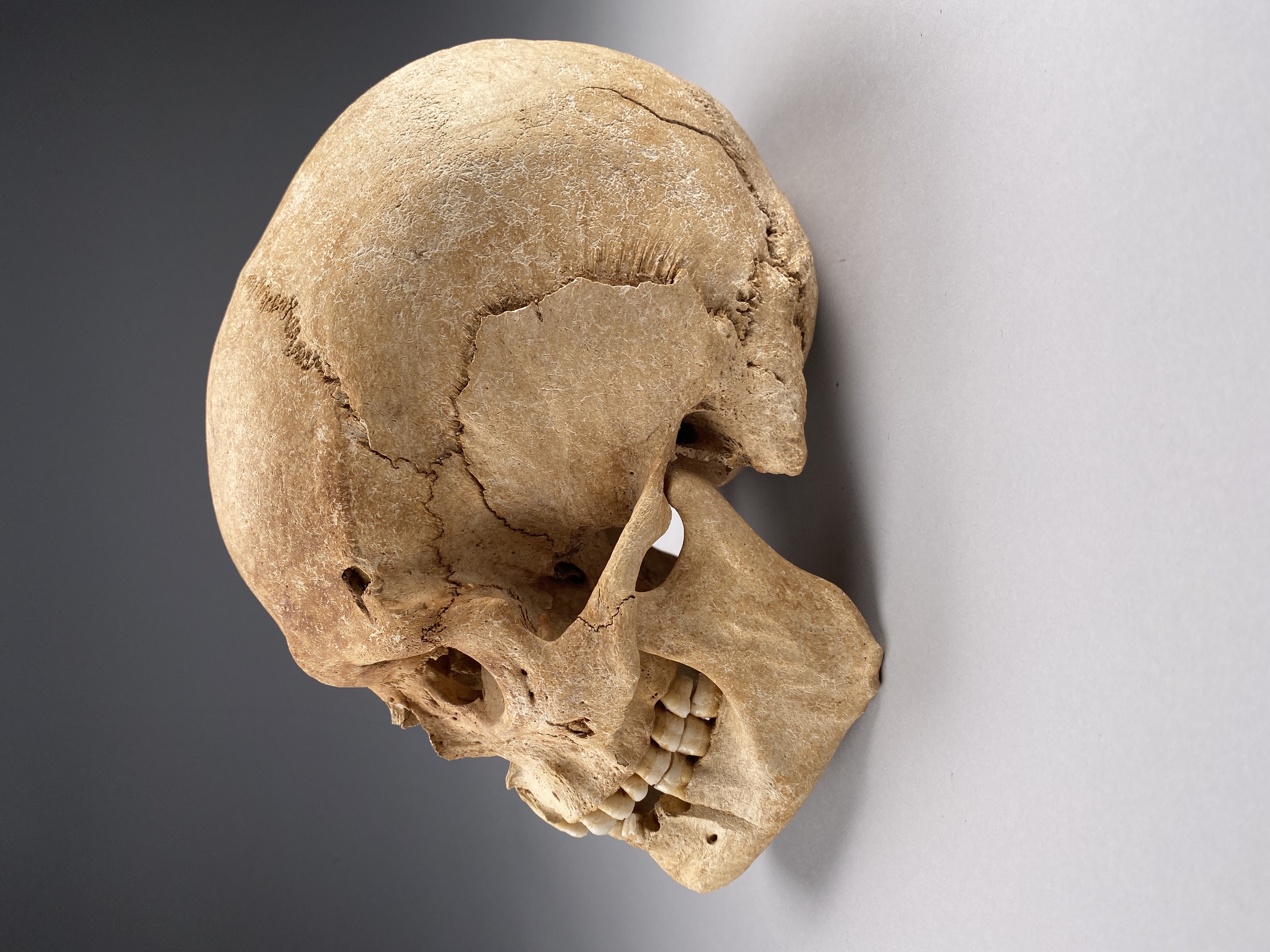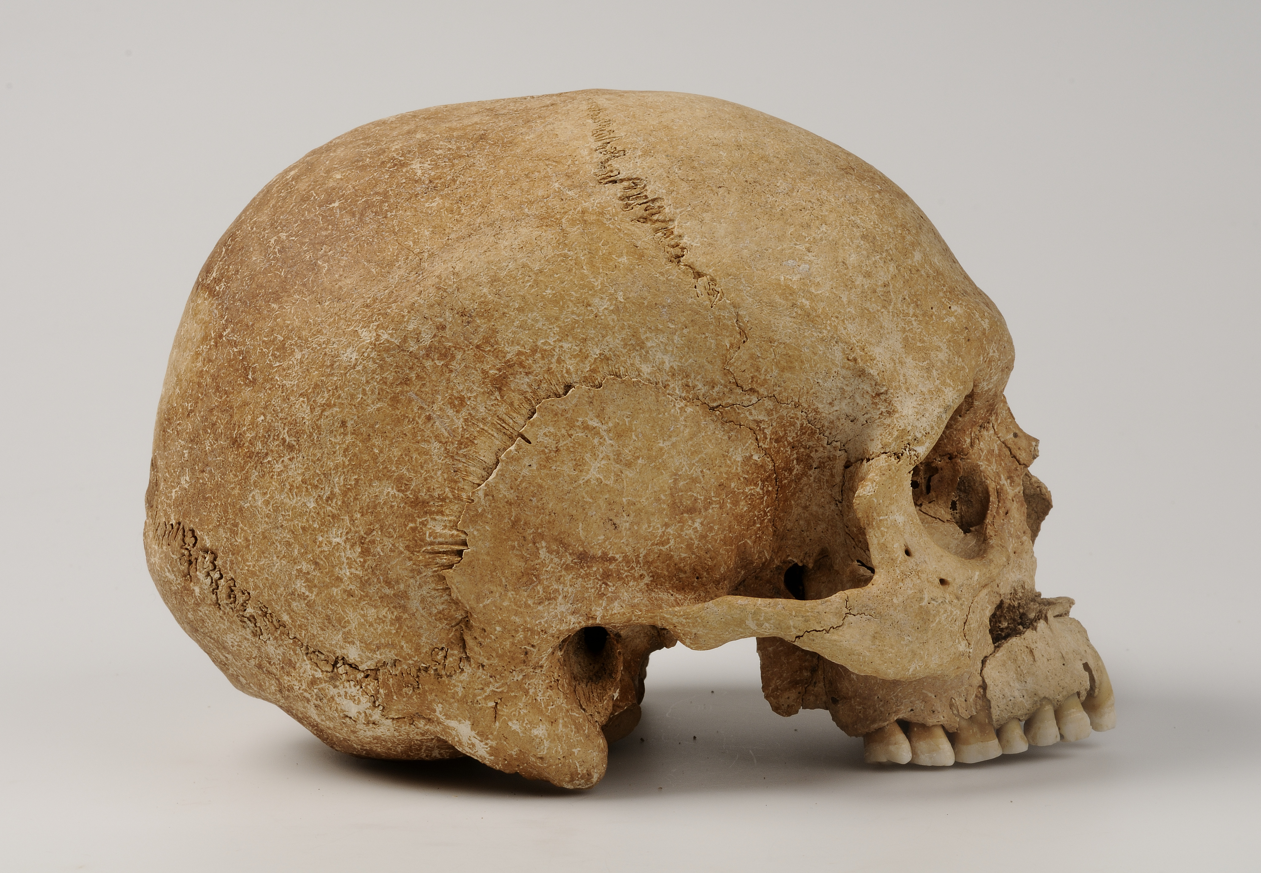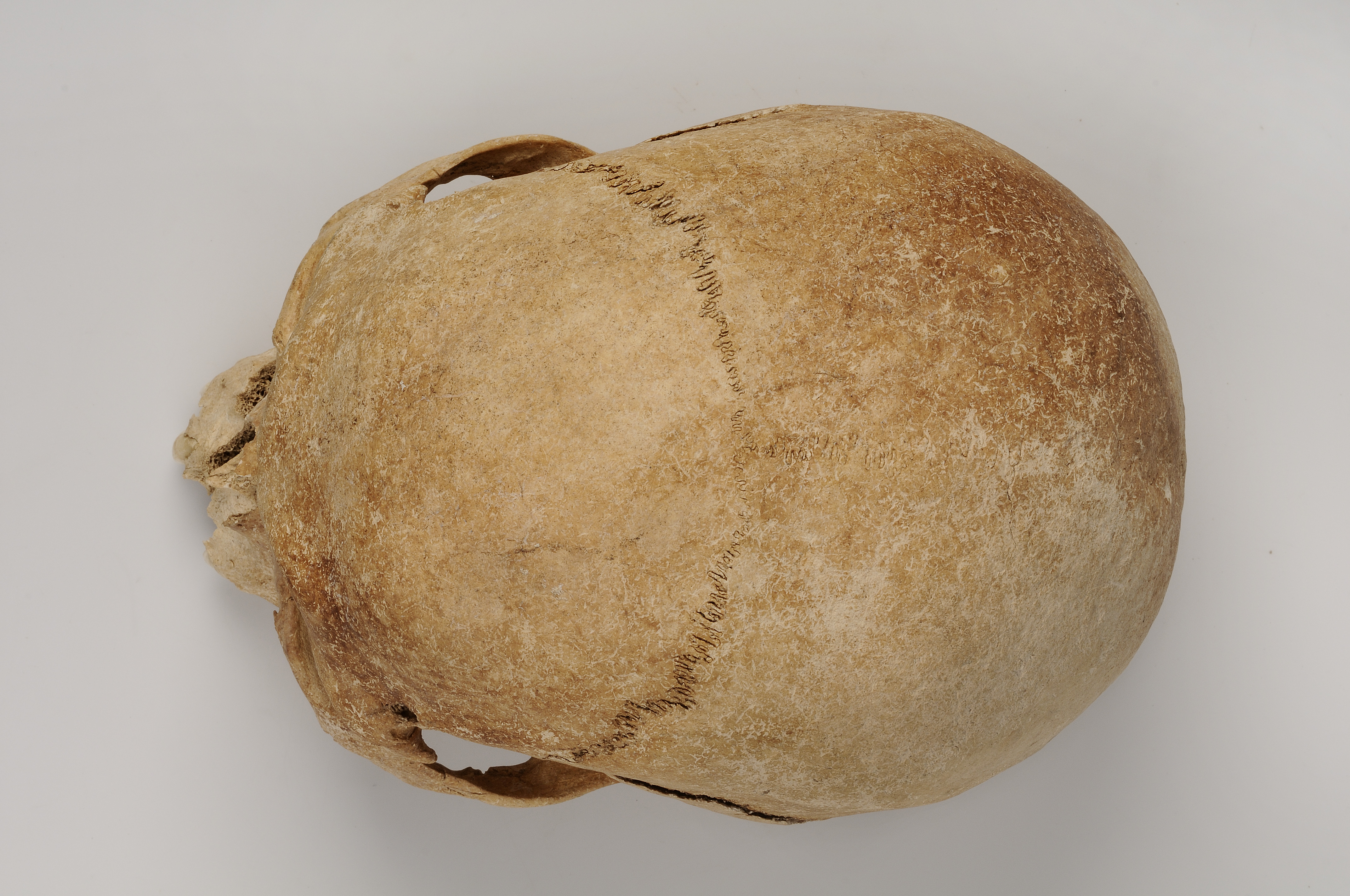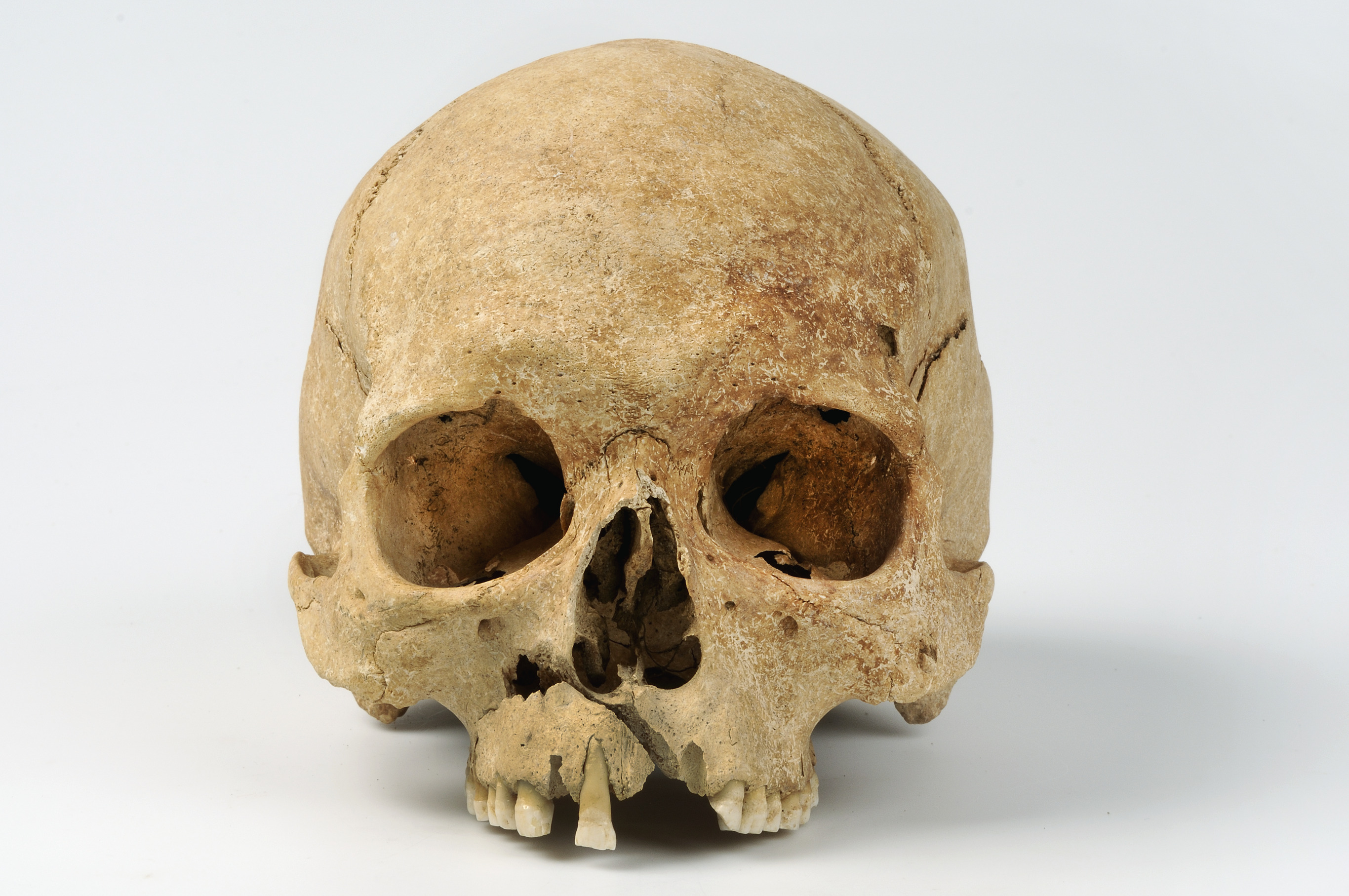 Kranium med spår efter hugg genom överkäke och underkäke