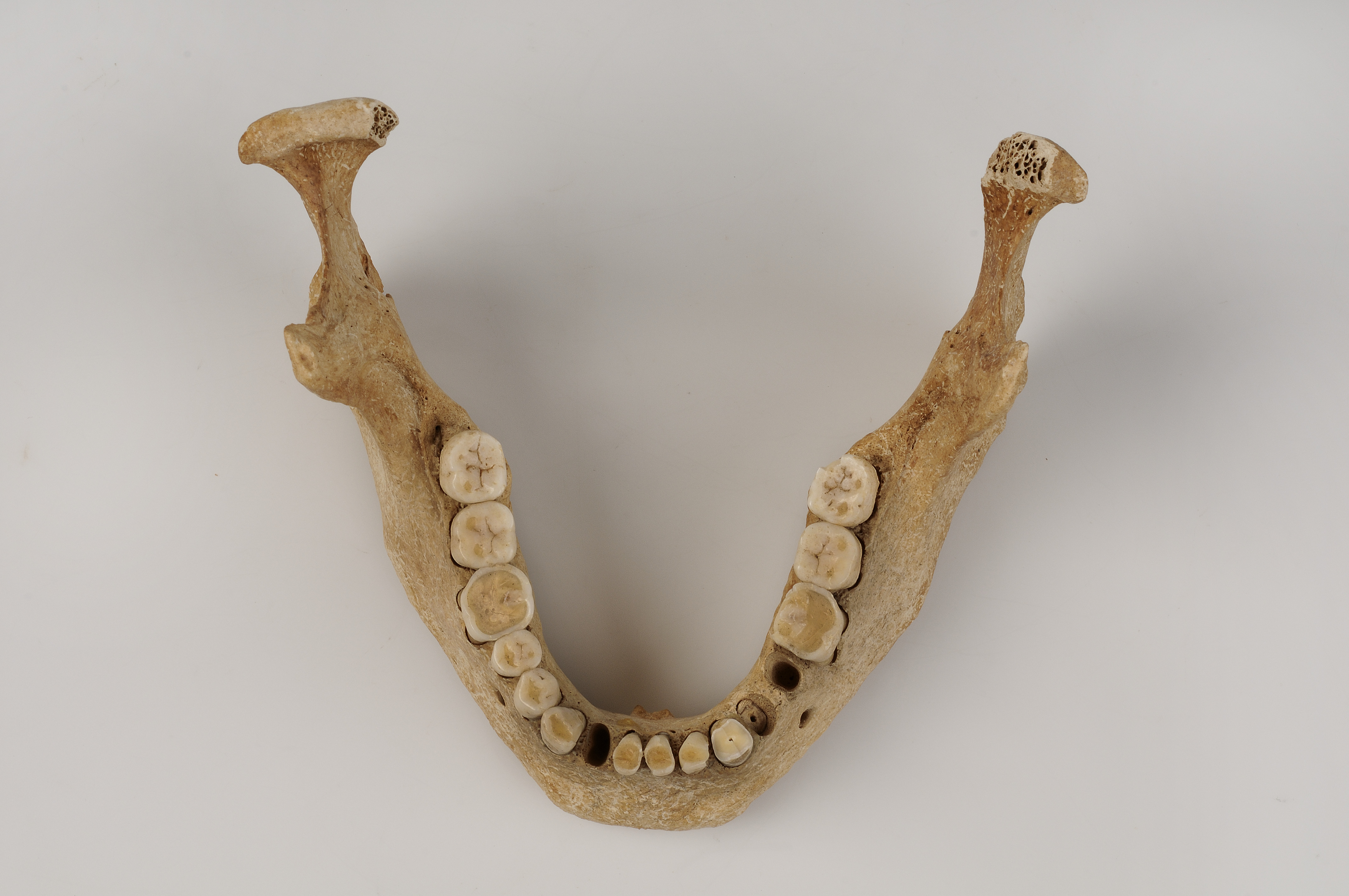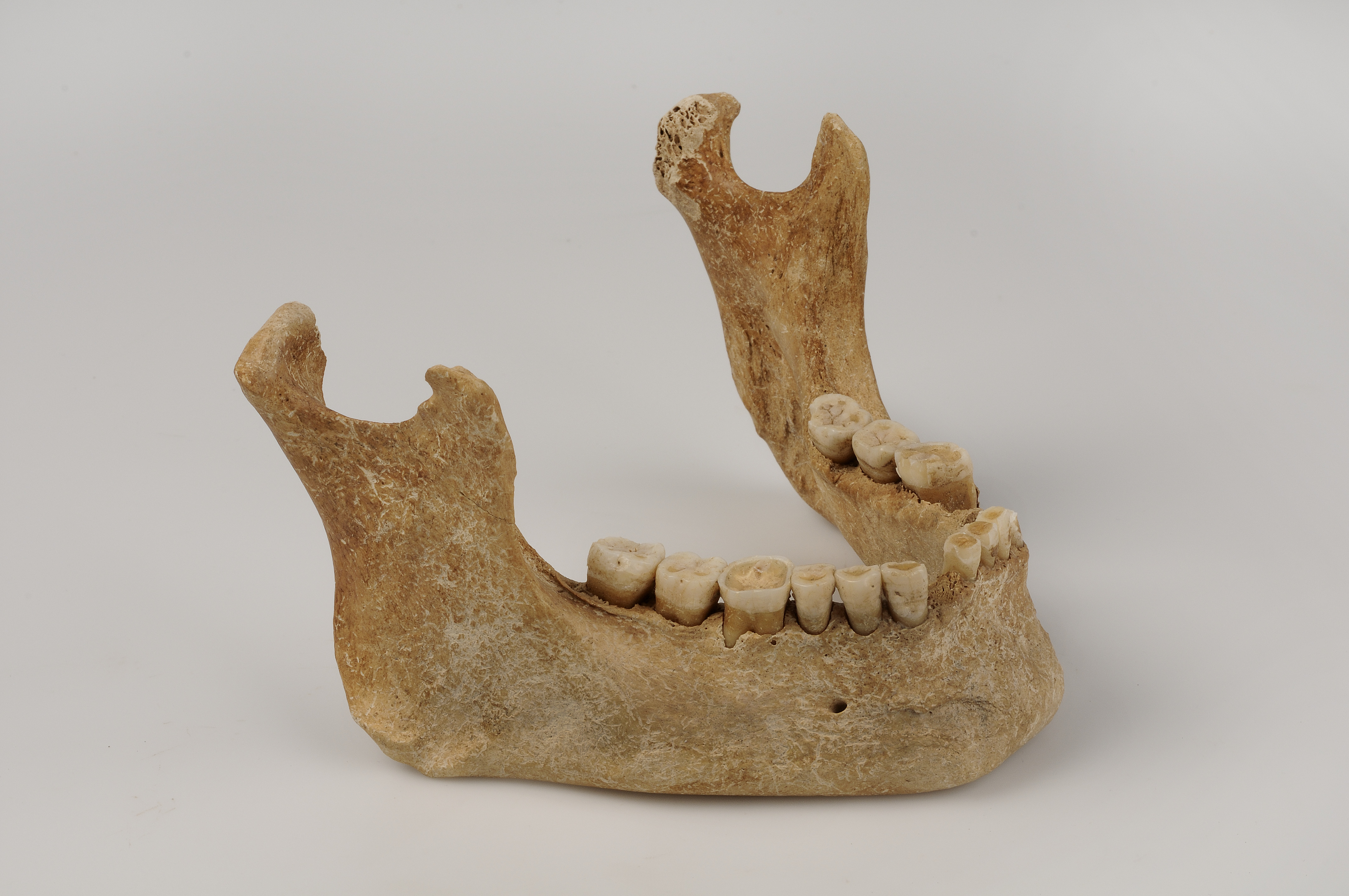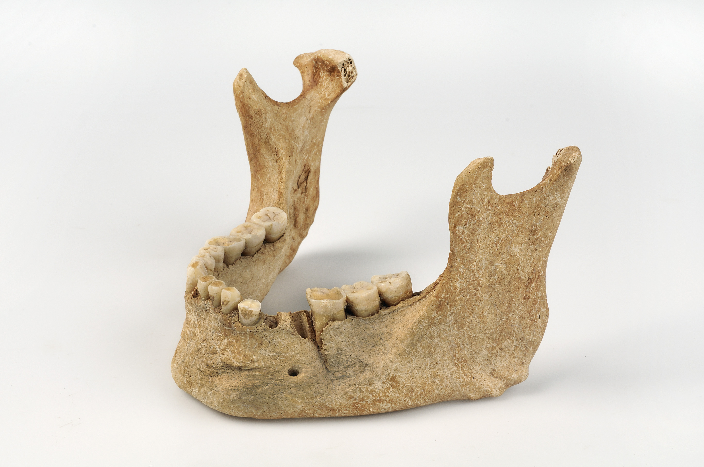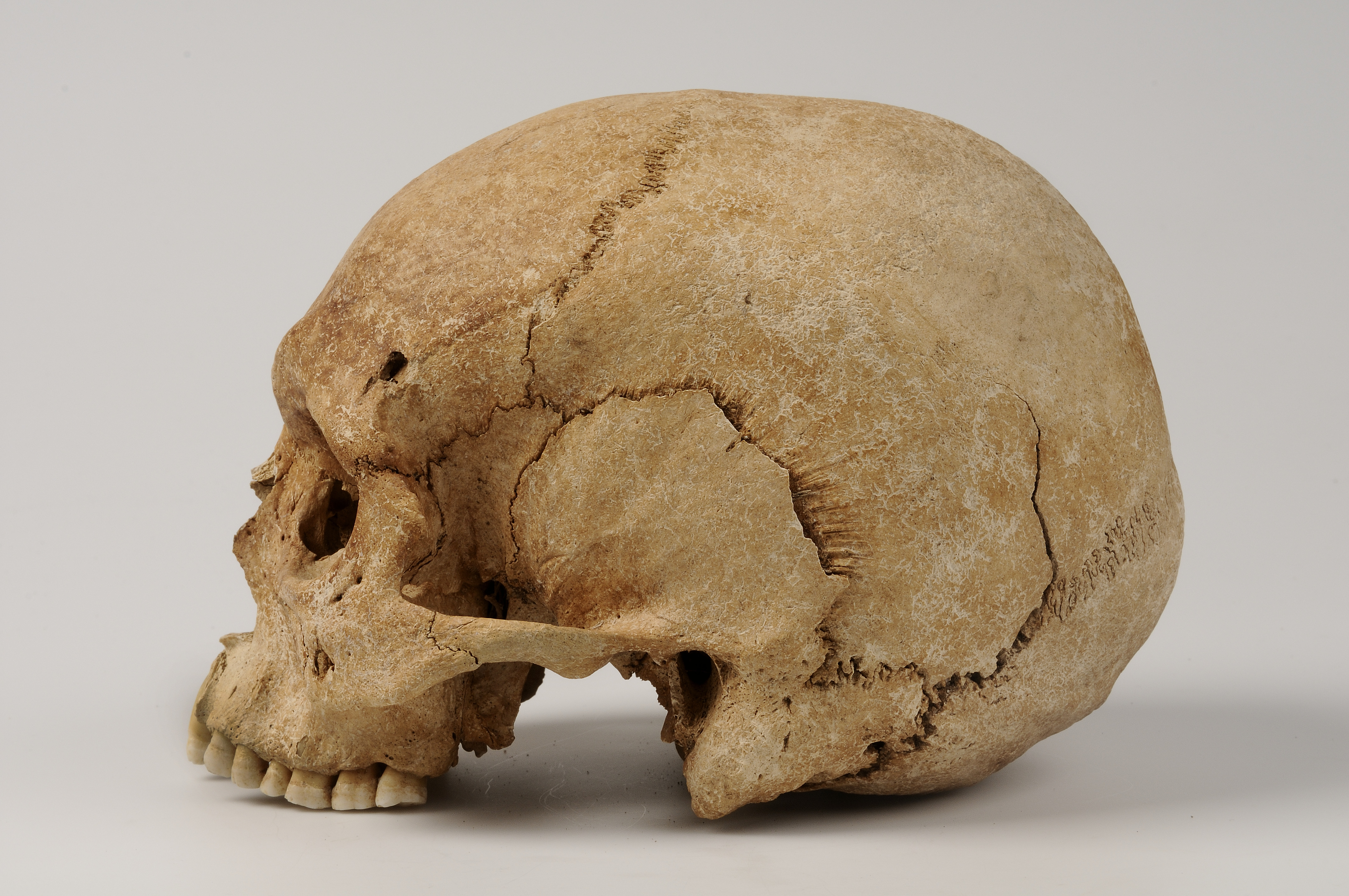 Kranium med spår efter hugg genom överkäke och underkäke