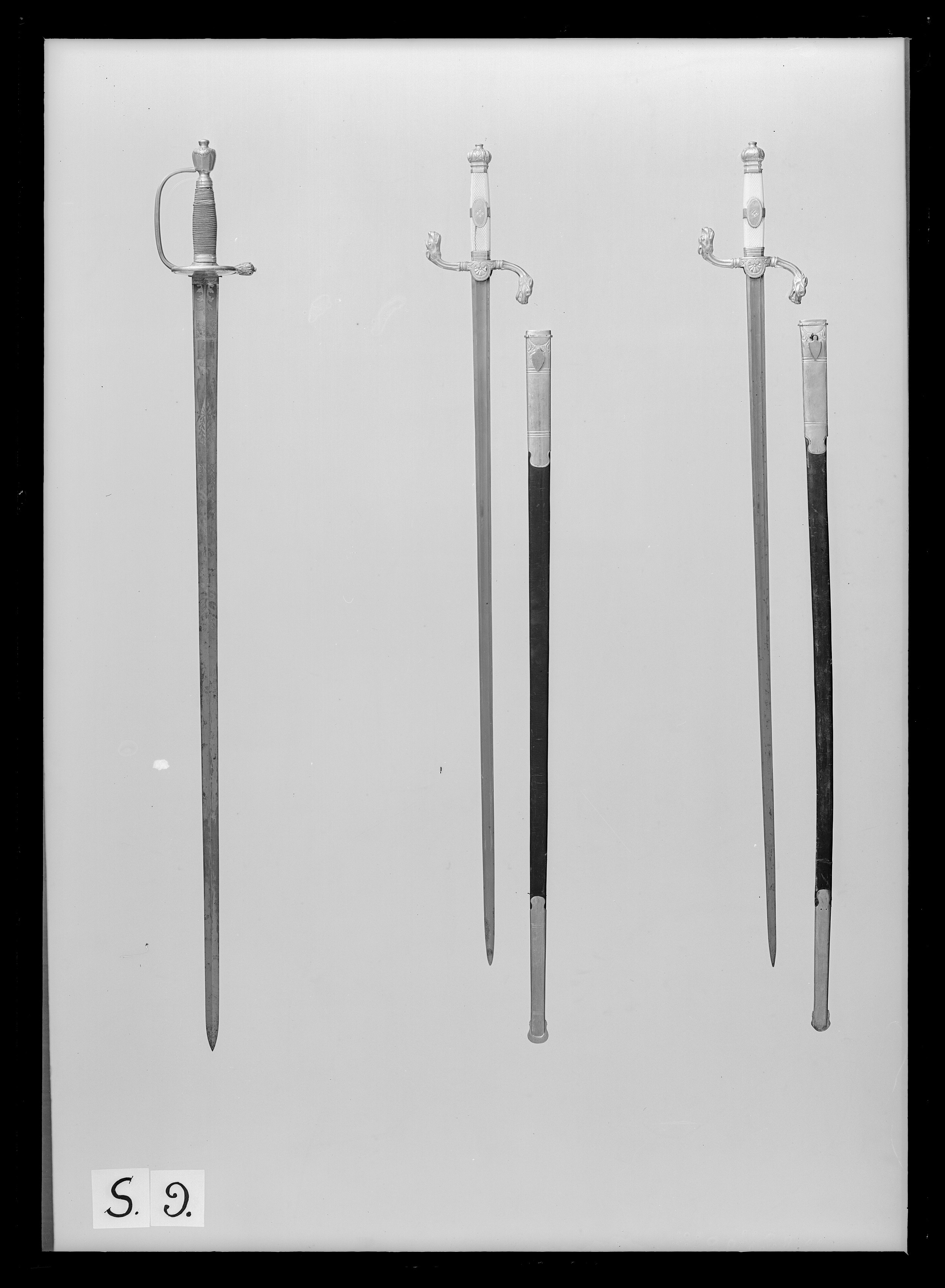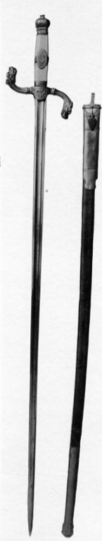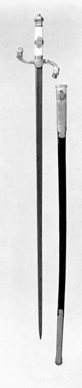Fäste av förgylld mässing. Rektangulär knapp med profilerad hals, knappens ovansida är rundad. Rund, plan nitknapp. S-formiga, kannelerade parerstänger, ytterändarna i form av odjurshuvuden (drakhuvuden). Rundad styrskena med palmett. Kavel av elfenben, rektangulär med räfflade smalsidor och rutmönstrade bredsidor. På kavelns mitt ett ovalt mässingsfält med blomdekor på mitten. Nedre plant beslag av mässing med graverade ändar. Klinga rak, eneggad med plan rygg och skålning utefter nästan hela klinglängden fram till det tvåeggade spetspartiet, l: 145 mm. Intill ryggen en smal skåra.