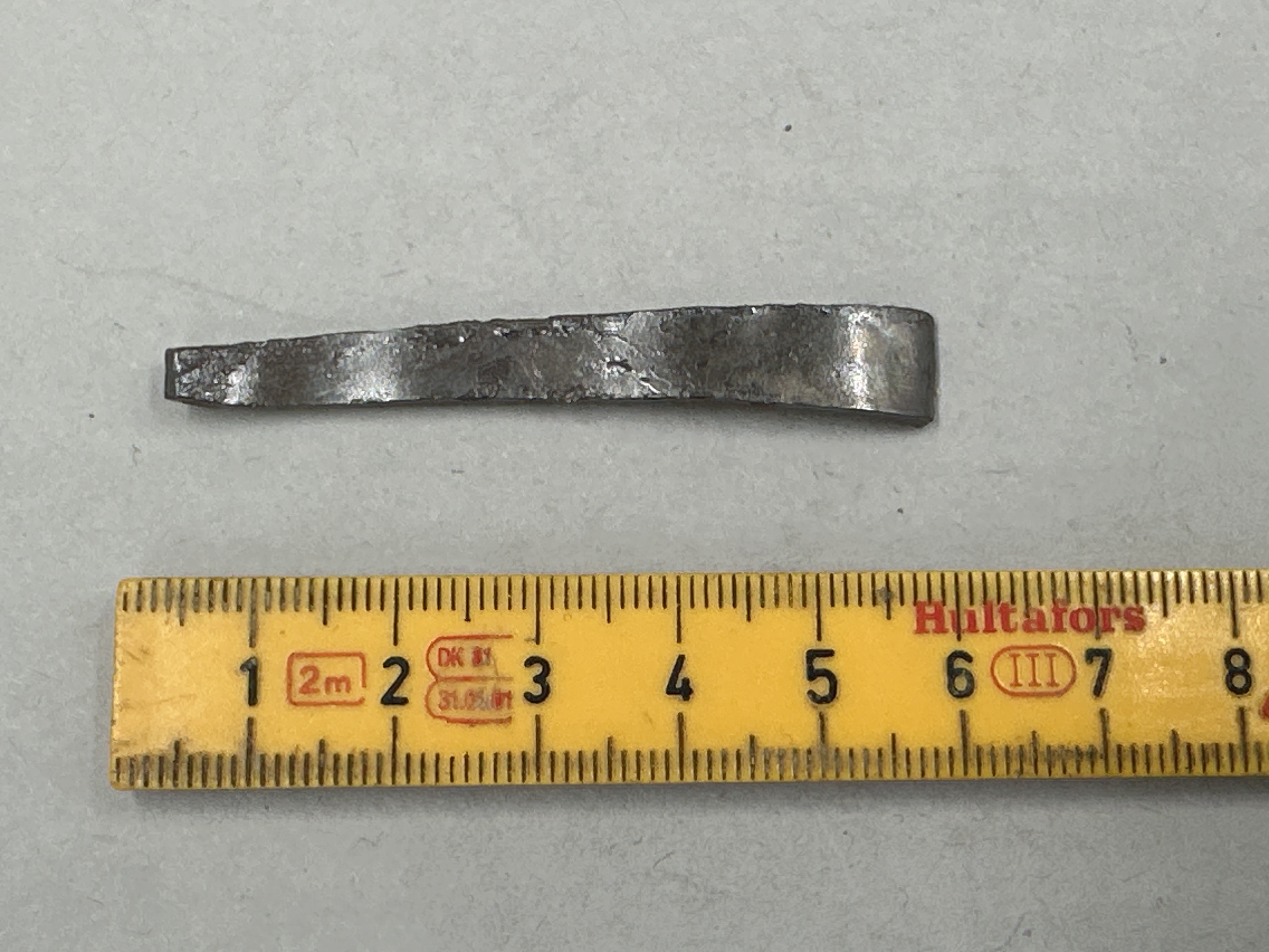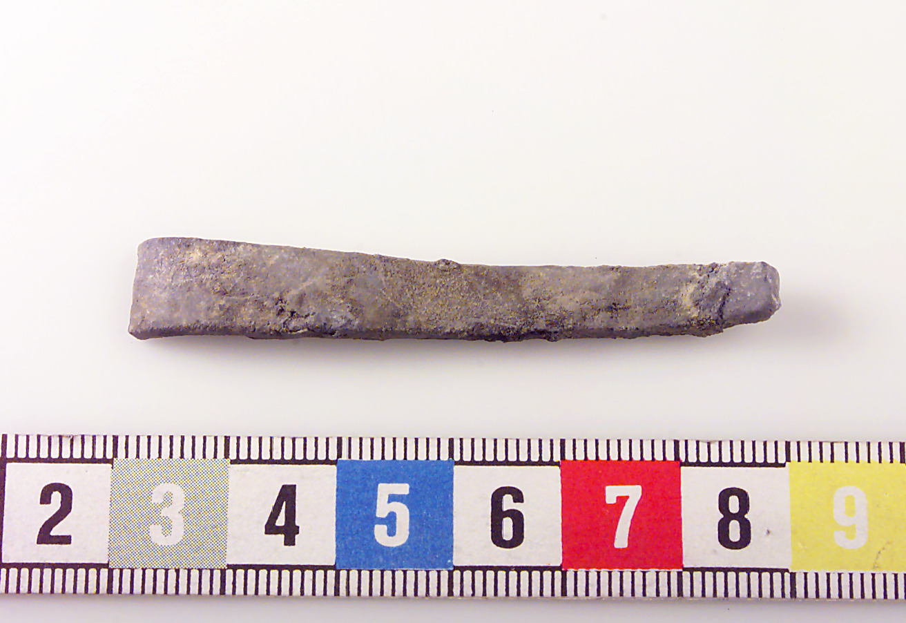 Bandformad med avsmalnande ände. Slät. Skadat ytskikt.