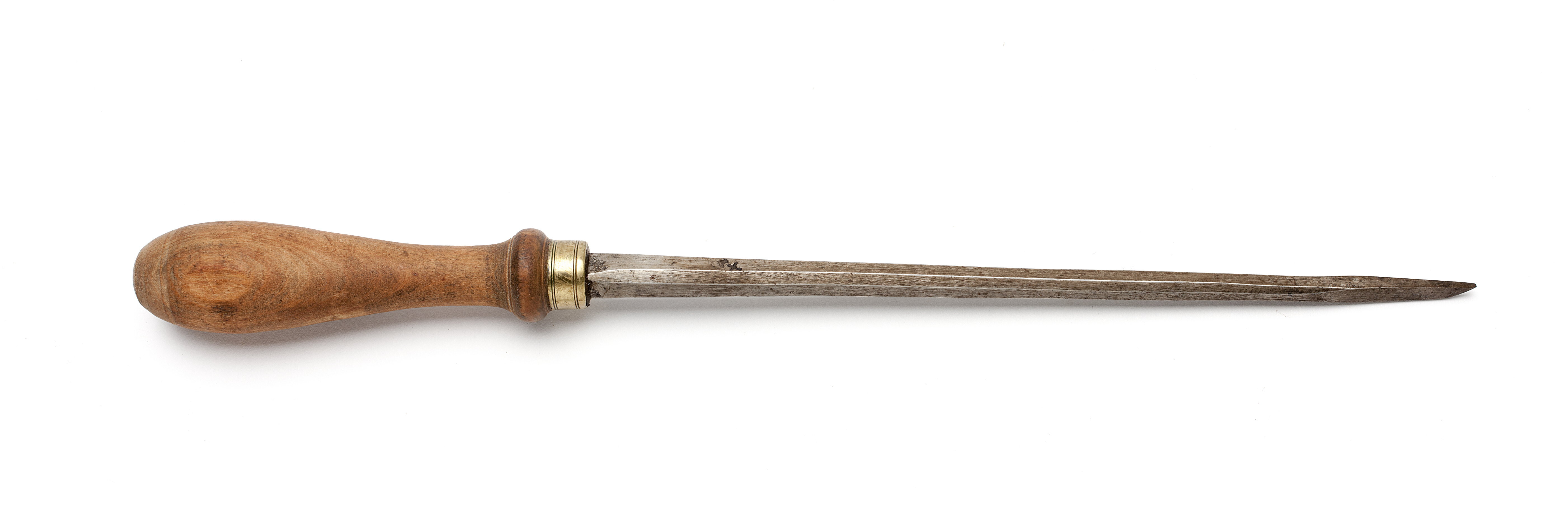 Klinga med åttkantig genomskärning, stål med fyrkantig. Stämplat på klingan: hjärta under kors. Svarvat skaft av päronträ, med en vulst nedtill. Mässingsring. 1930 kallat stickjärn.