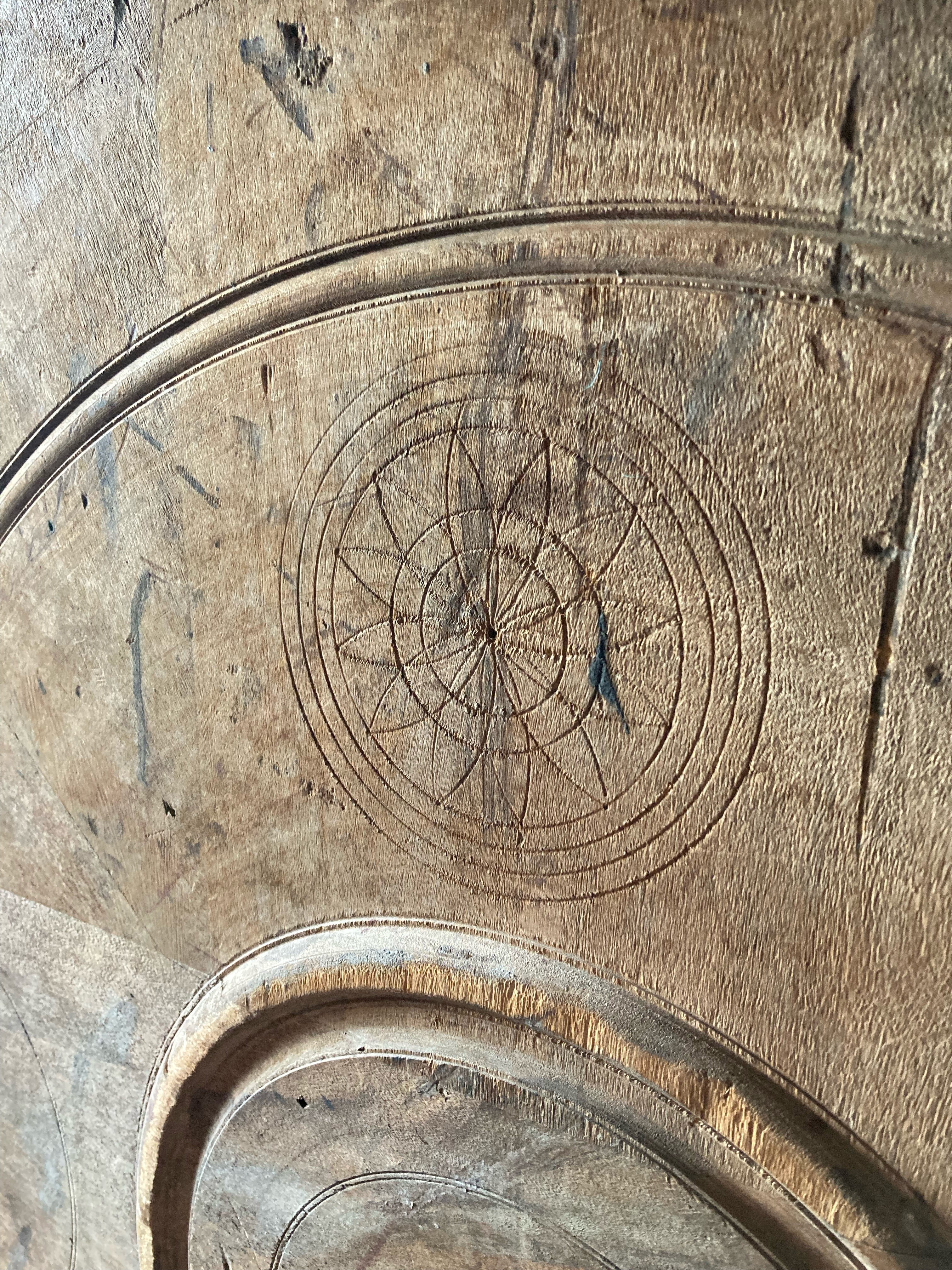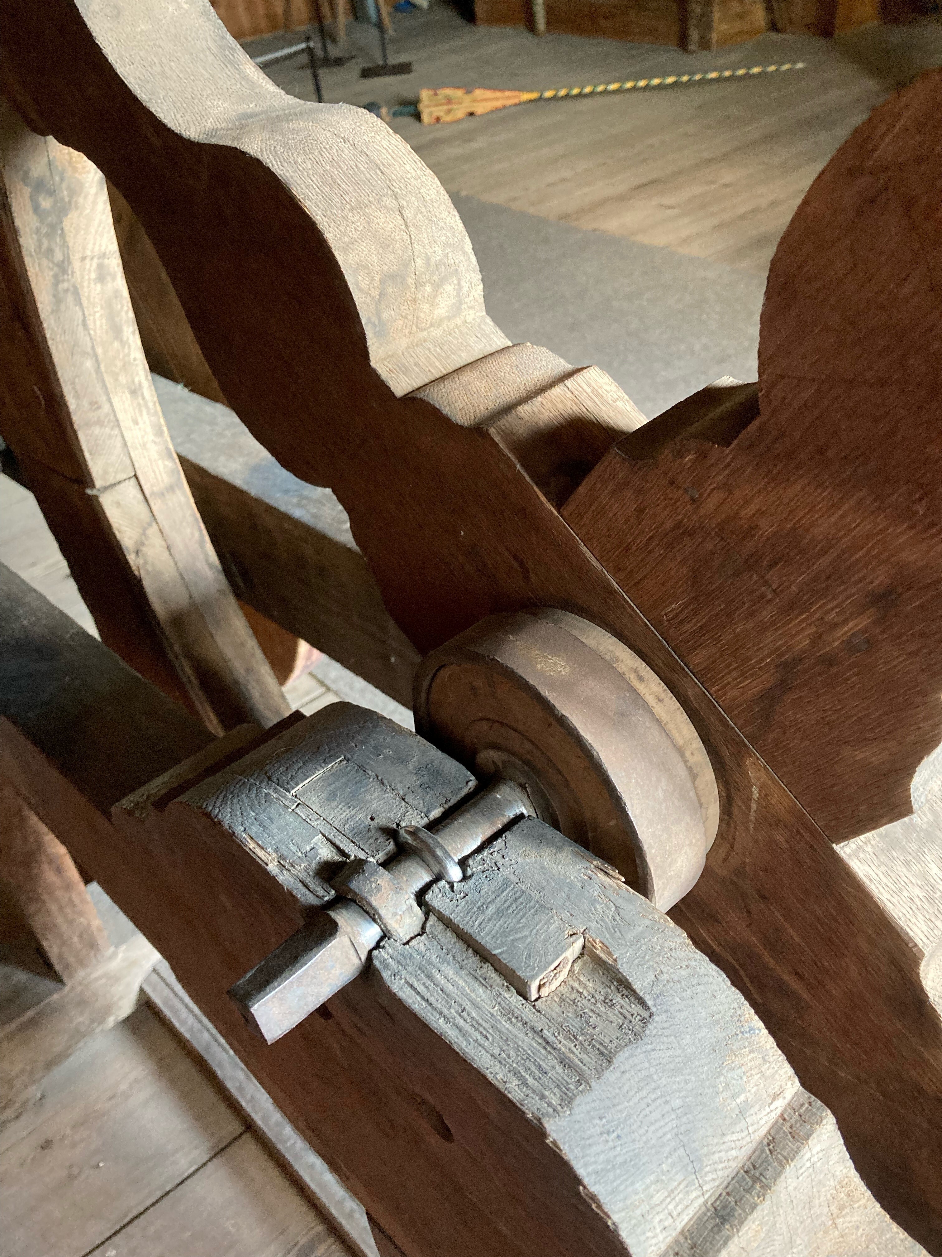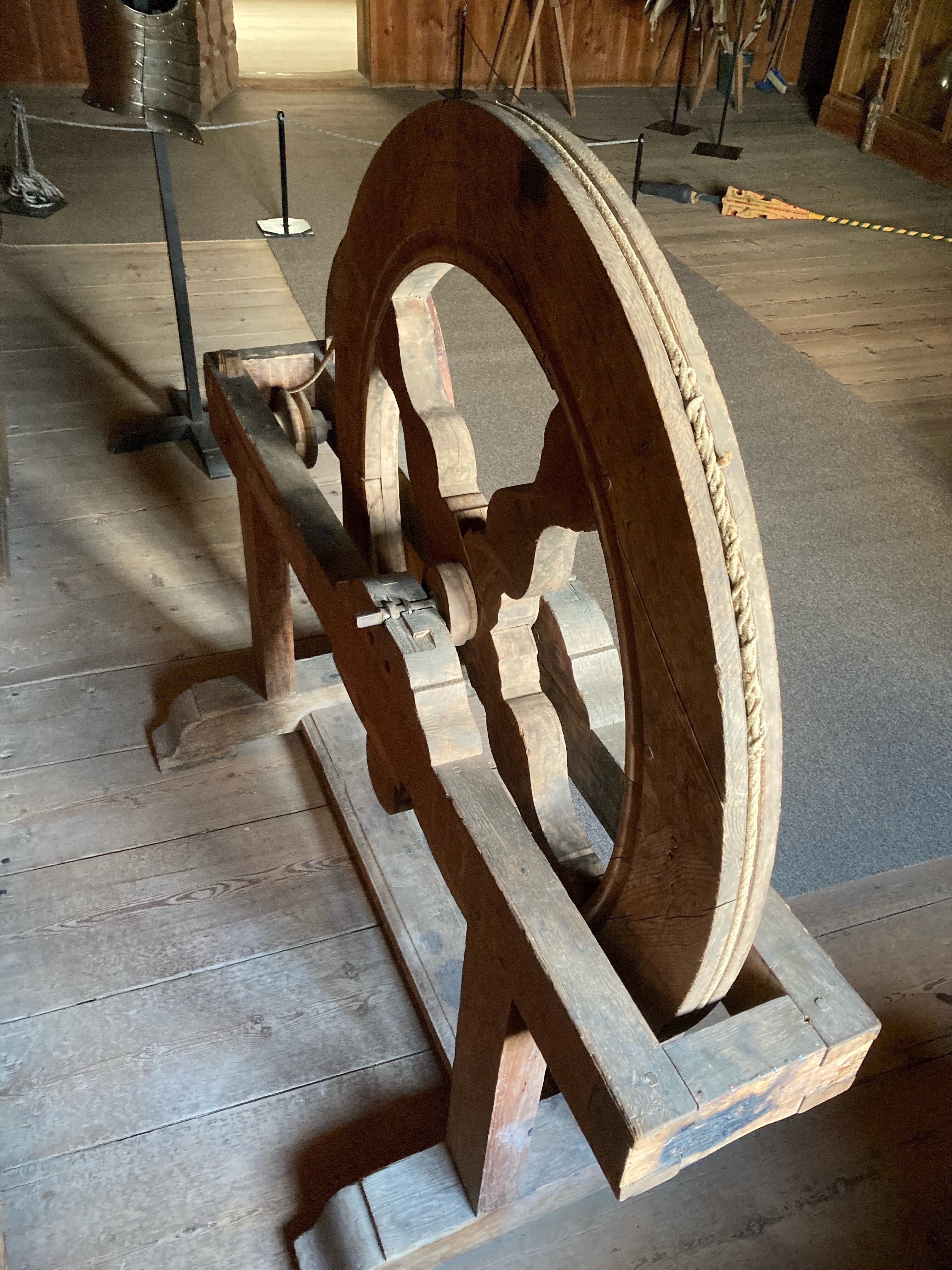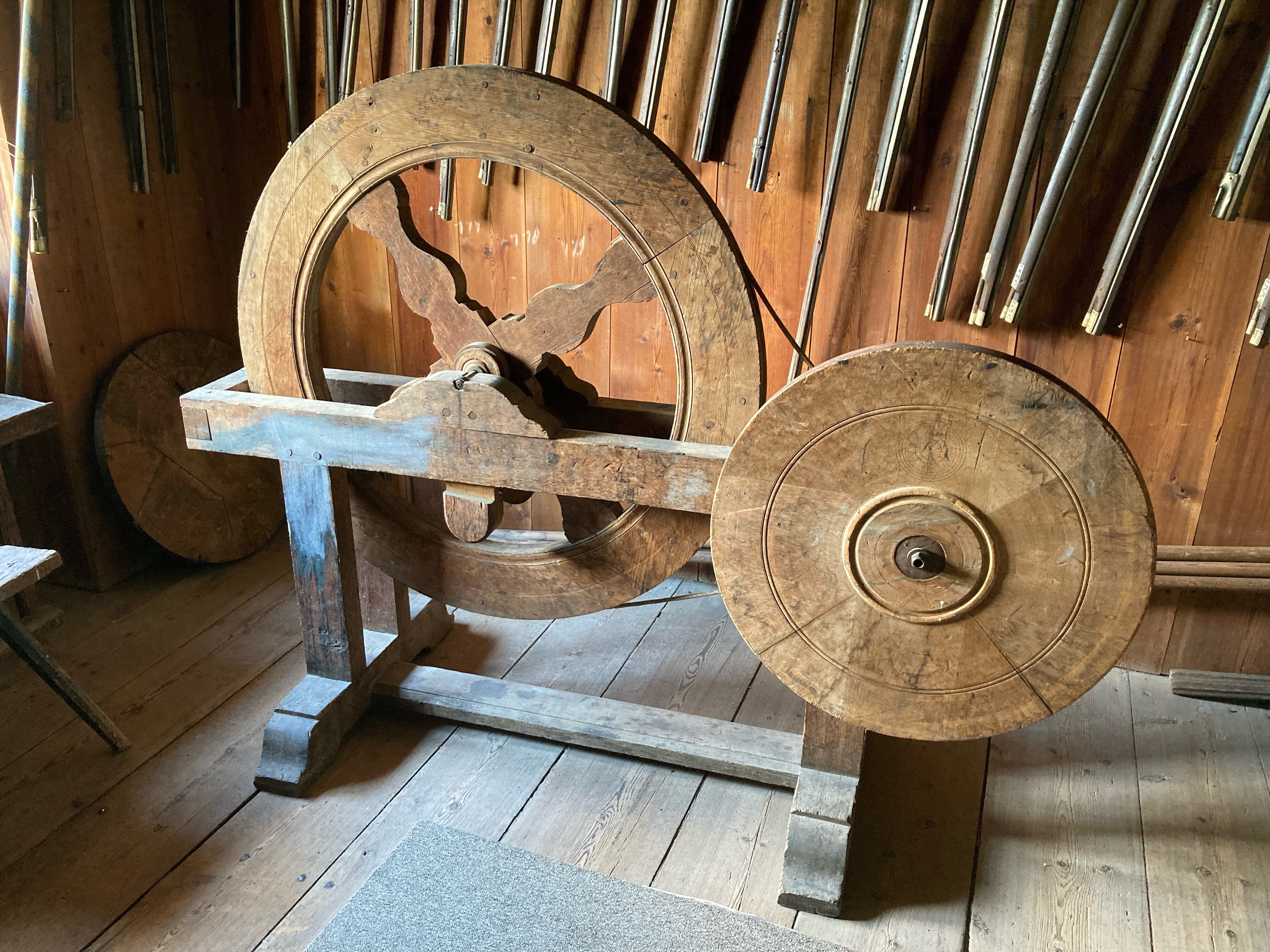 Tillverkad år 1671 av slottssnickaren Johan Svensson. Drivhjul av ek. Diam. 120 mm. Fyra balusterformiga, plana ekrar. Polerskiva av ek, tvärträ. Diam. 760 mm. På utsidan graverad kompassros. Polerskiva av poppel (?). (6475:2) Sitter ej fast vid bänken. Är avsedd att användas vid övergång från grövre till finare behandling. Diam. 750 mm.