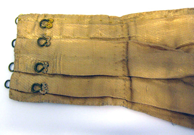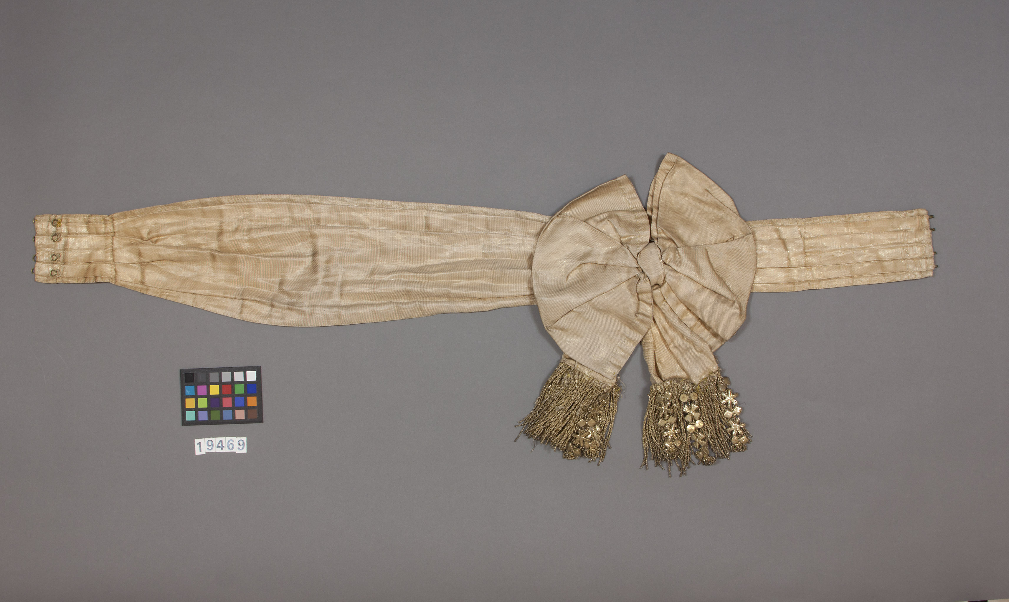 Skärp av gulrött sidenrips med inslag av guldtråd. Skärpet består av ett stycke, lagt i breda skarpa veck, i ena änden vidgande. I ena änden är påsytt ett stycke på vilket sitter åtta förgyllda mässingshyskor. I motstående ände sitter fyra förgyllda mässingshakar. Mitt på skärpet sitter påsytt en stor rosett av samma tyg osm skärpdelen. Rosettens två nedhängande bandändar kantas av en lång, tät guldfrans av drejad förgylld tråd och av krepiner av förgylld tråd. Skärpet är på undersidan fodrat med ljust gulröd sidentaft.