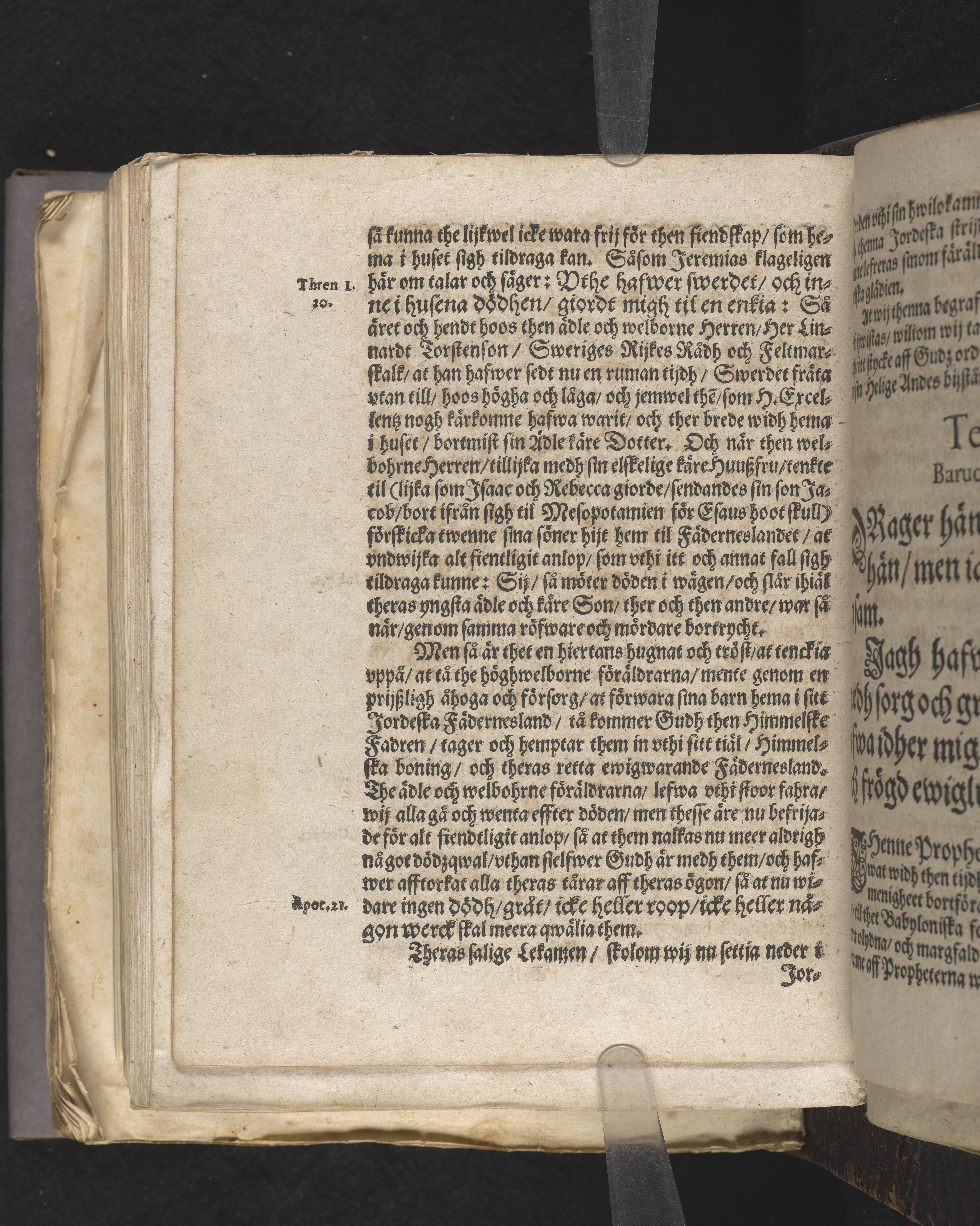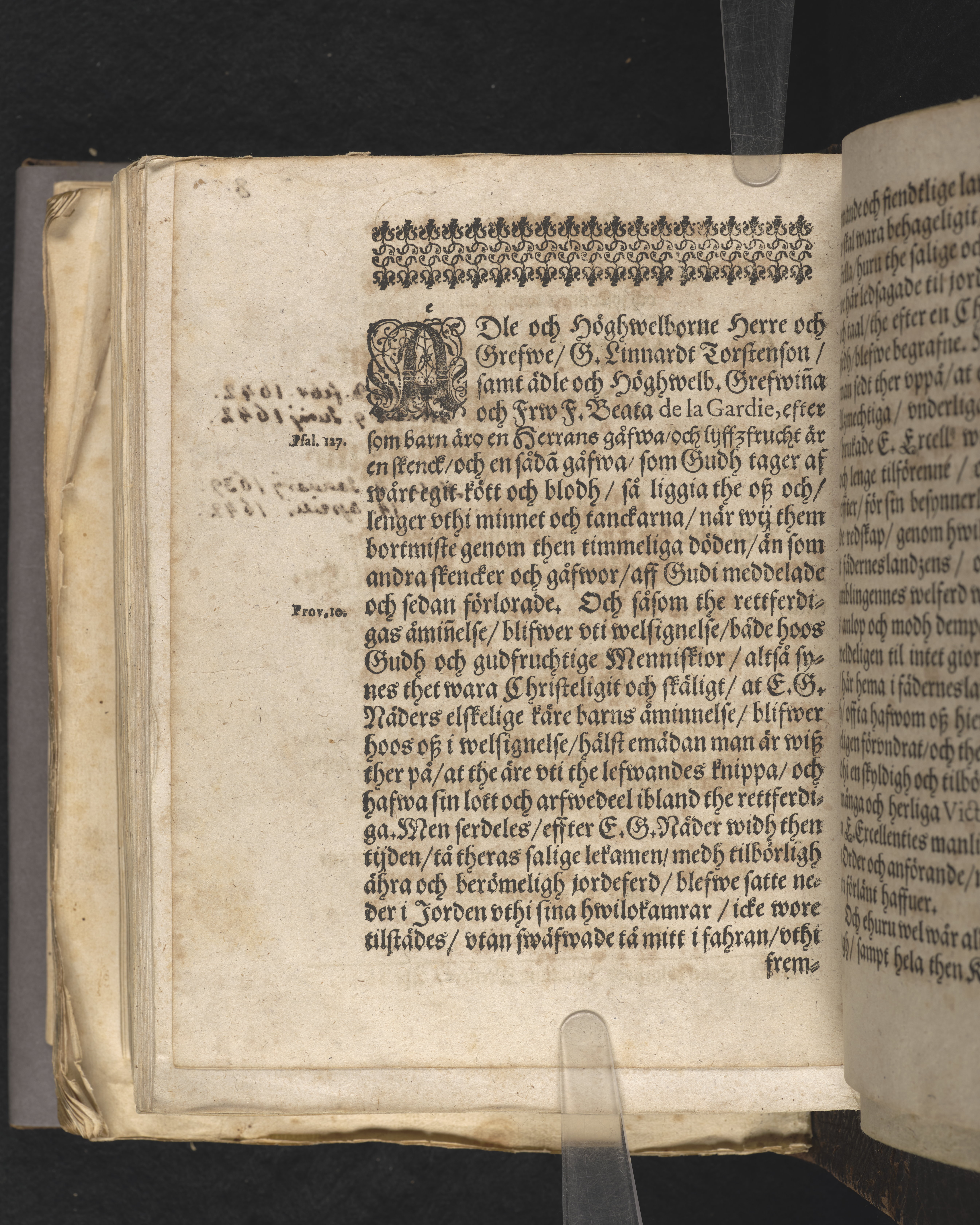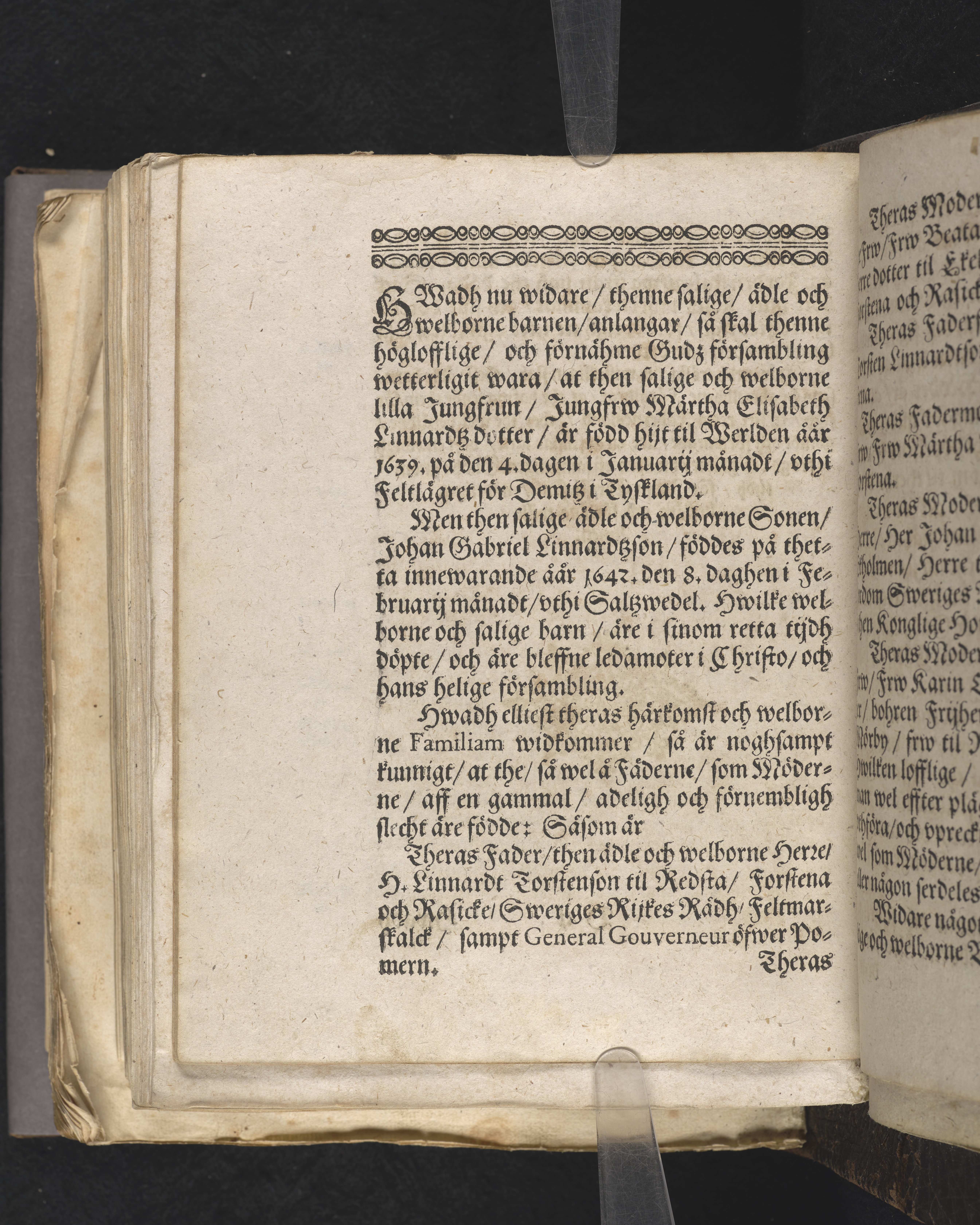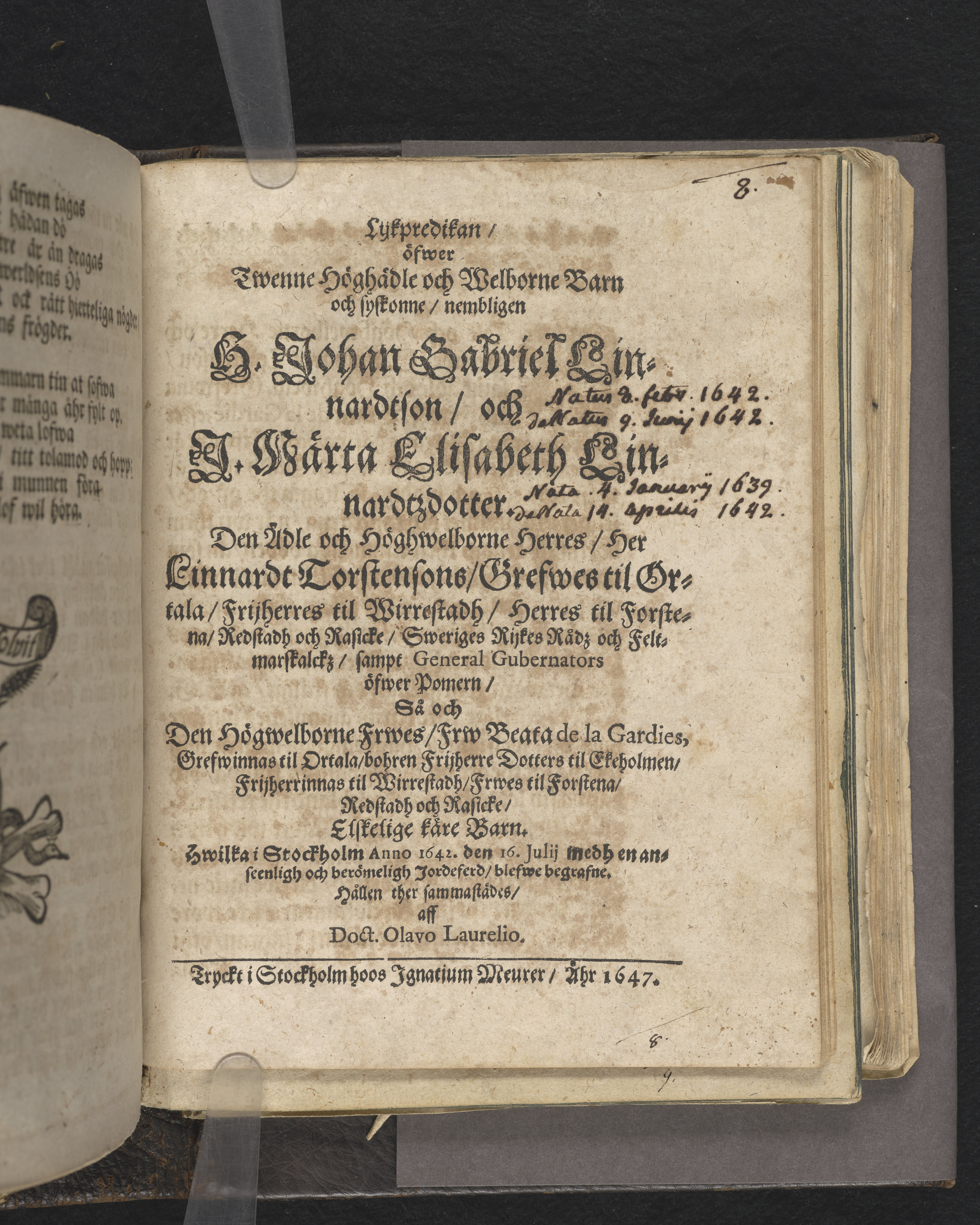 Lijkpredikan öwer twenne höghädle och welborne barn och syskonne, nembligen H. Johan Gabriel Linnardtson, och Märta Elisabeth Linnardtsdotter ...Her Linnardt Torstensons... och fru Beata de la Gardies... barn, hwilka i Stockholm anno 1642, den 16 julij ... blefwe begrafne. Hållen ther sammastädes aff Doct. Olavo Laurelio. Tryckt i Stockholm hoos Ignatium Meurer, åhr 1647.