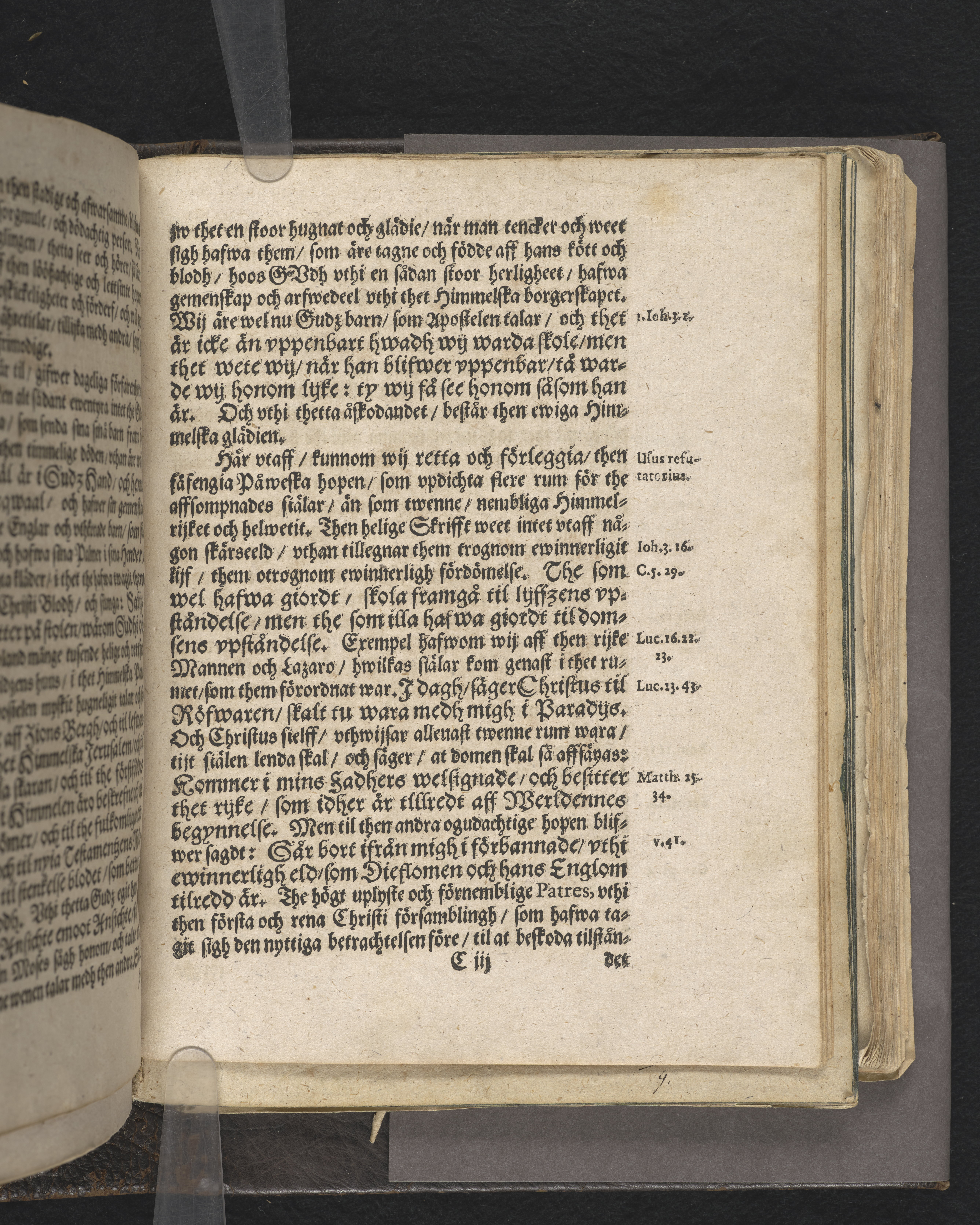 Band av svart kalvskinn dekorerat med blindtryck. Fast rygg. Inlagan består av enskilda skrifter som tillsammans häftats på tre bind, fast rygg. Variationer i papperskvalitet och storlek.11 skrifter samlade i en volym.