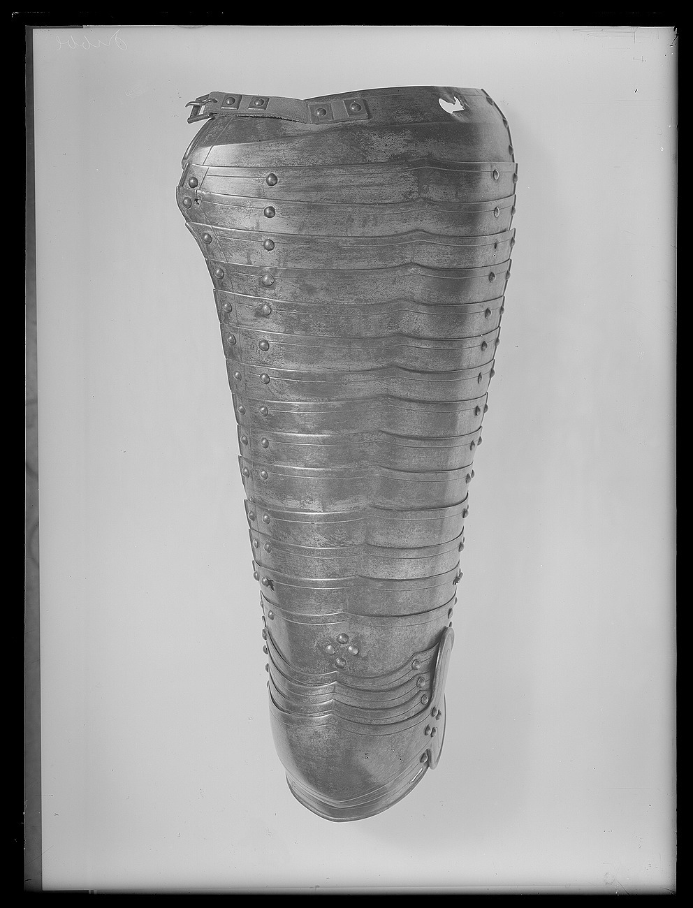 Nedre del av åtta delar. Fäst i den övre med utstående nit och vridbar näbbförsedd tapp. Skenorna närmast bucklan utdragna i tre låga spetsar. I nedersta skenan två nyckelhål-hål för benskenan. Bucklan har mot utsidan oval vinge med invikt mitt. Nitar i dubbla rader, på nedre delen enkel rad. Fyra nitar i grupp sattta strax ovanför bucklan och vid vingens början.