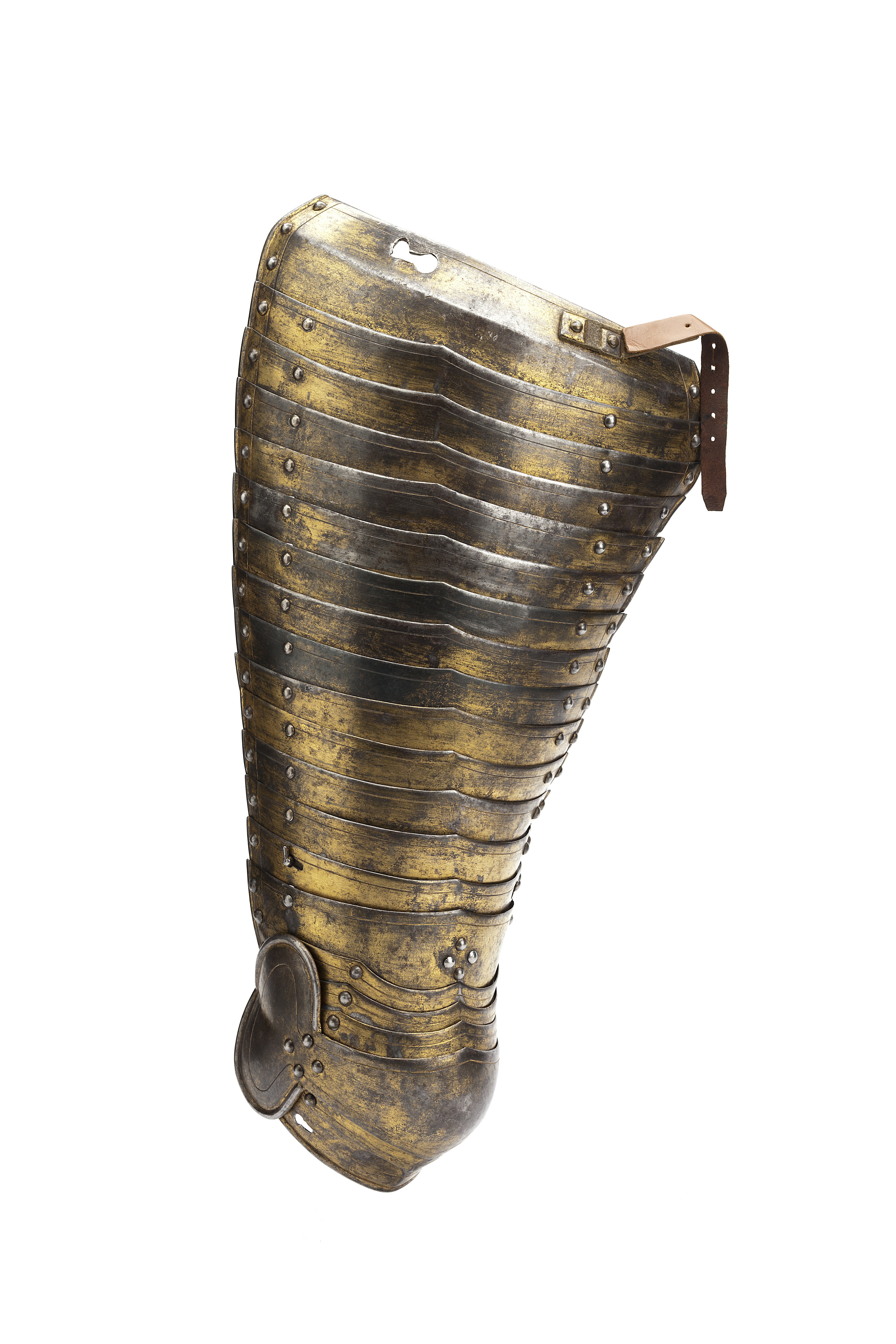 Lång tassett, höger. Del av Hertig Karl Filips tornérrustning. Anskaffad av Louis de Geer och möjligen slagen i dennes faktori i Norrköping. Förgylld av Charles Dartné i Haag och levererad till Stockholm 1624.