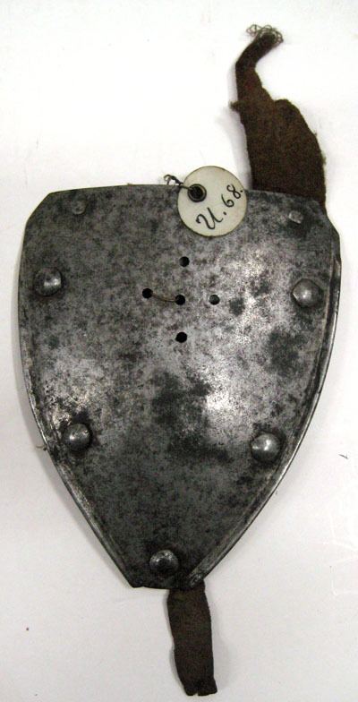 Triangulär sköldformig plåt, svagt välvd med i mitten fem korsformigt satta hål. Kanterna omvikta inåt. Längs kanterna sammanlagt sju nitar varav fem kullriga och de två övre (under hjälmkanten) slipade jämnsmed ytan. På insidan sämskade läderband.