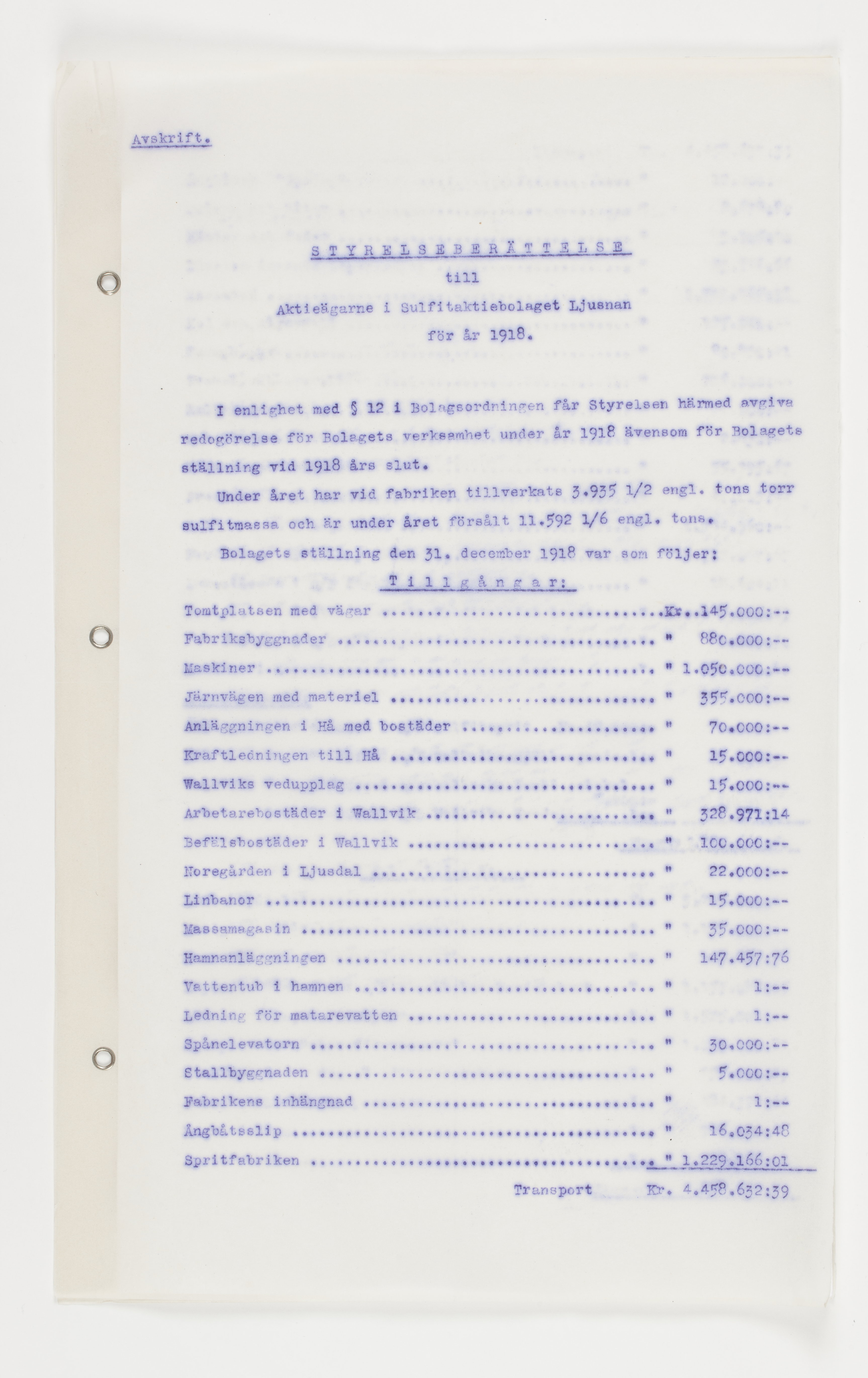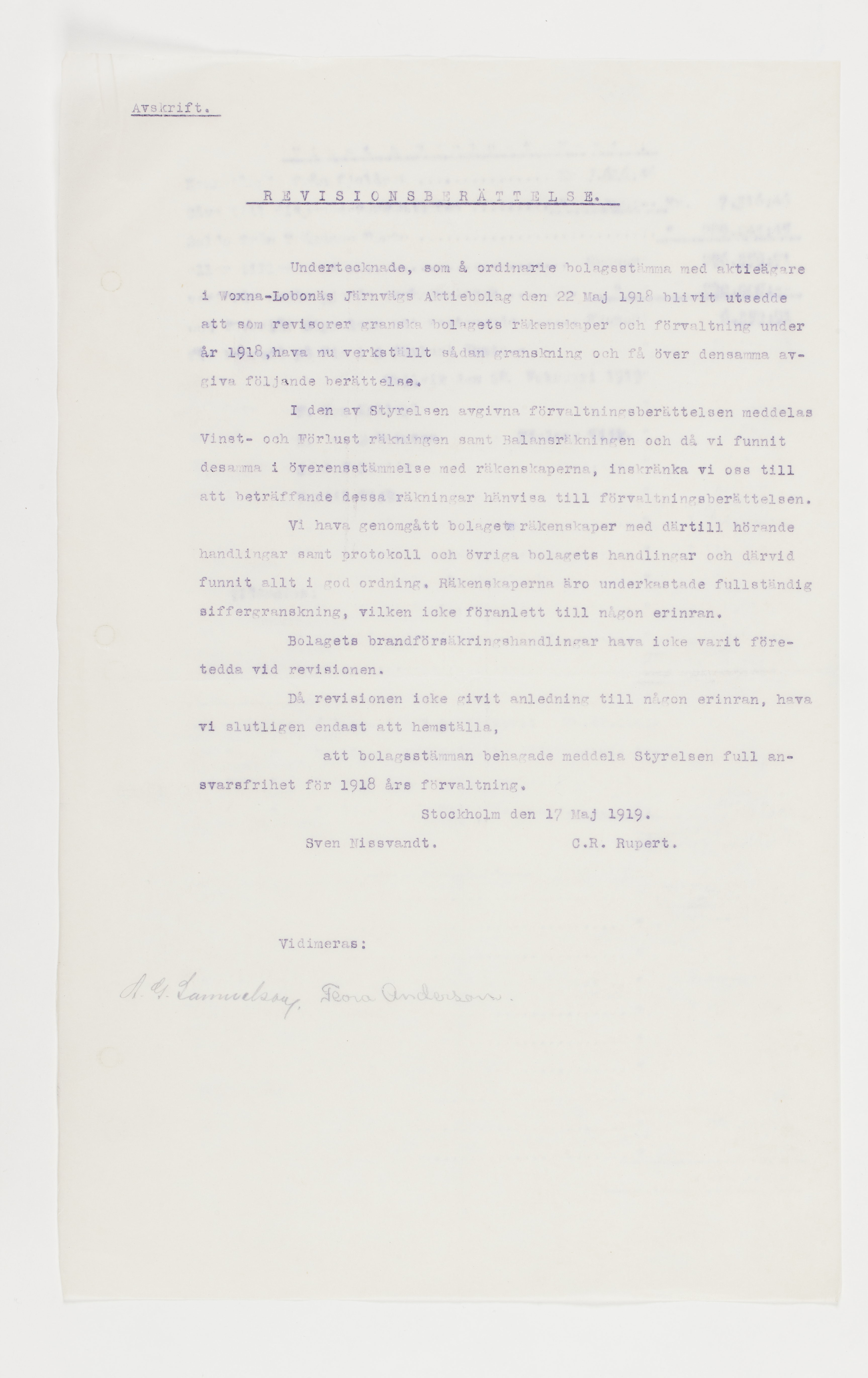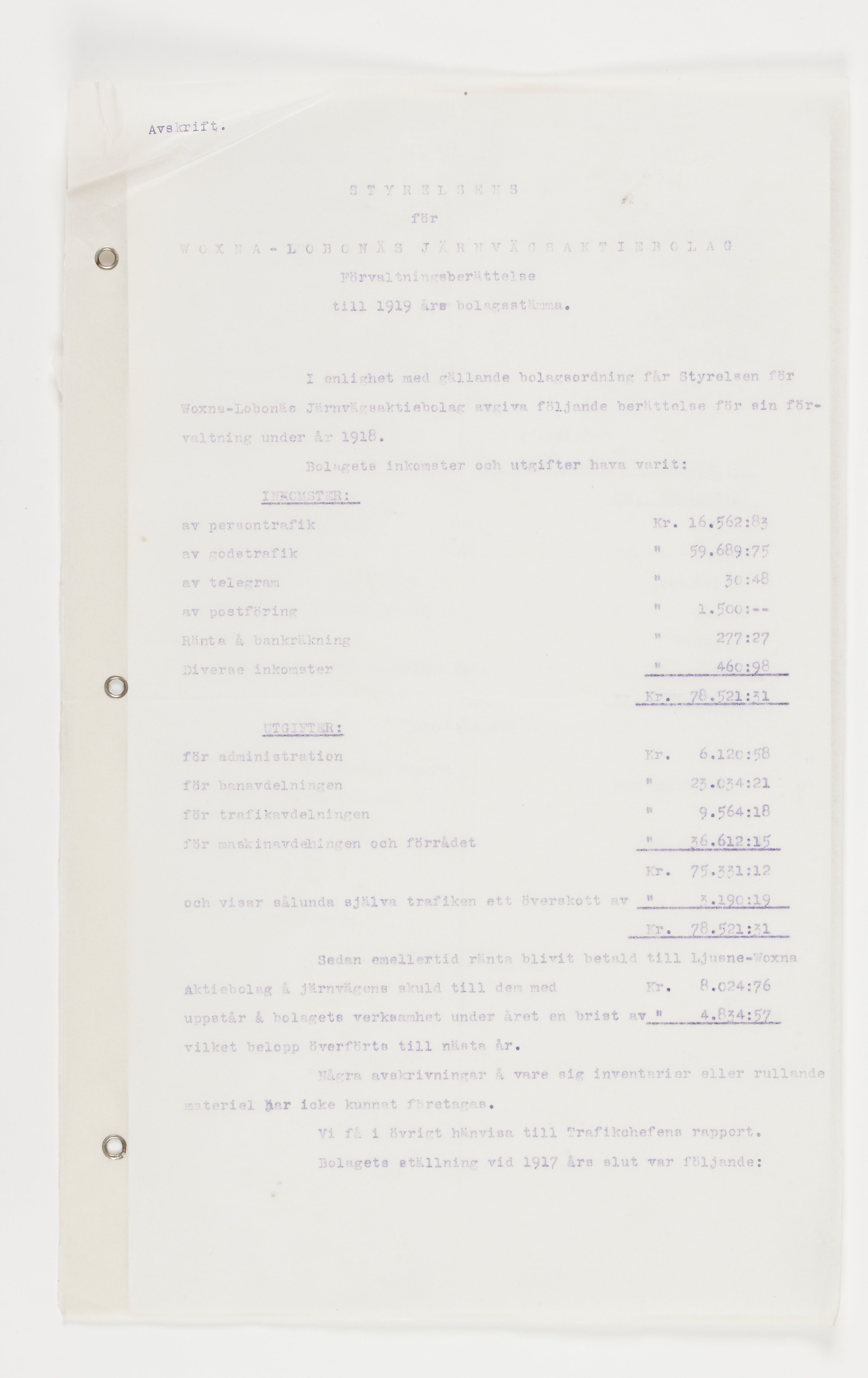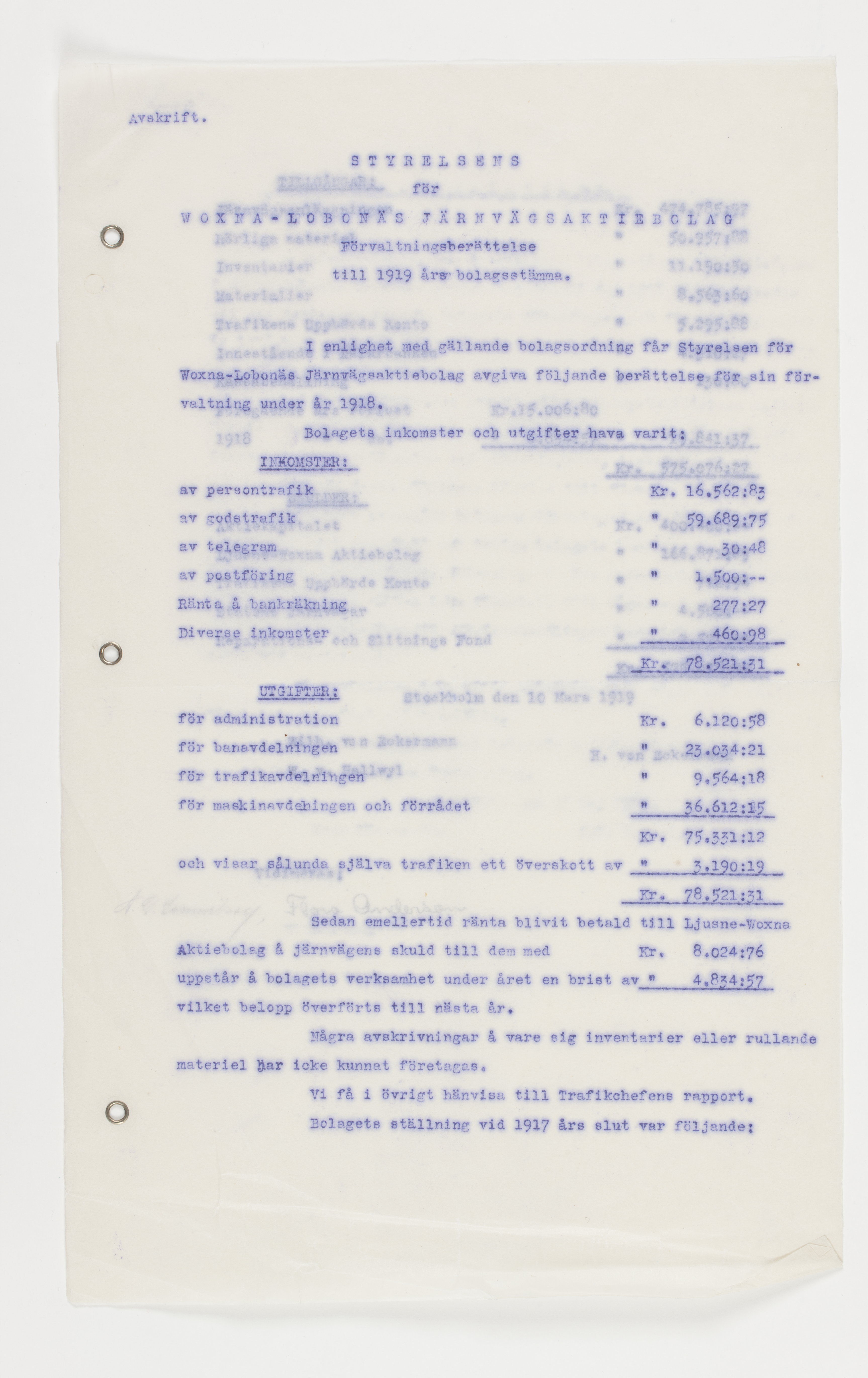 Föredragningslista vid ord. bolagsstämma med Ljusne-Woxna AB. 6 juni 1919, styrelseberättelse till aktieägarna i Sulfitaktiebolaget Ljusnan för år 1918, revisionsberättelse för Woxna-Labonäs Järnvägs aktiebolag, 17 maj 1919, samt styrelsens berättelse för det sistnämnda AB. Alla dessa avskrifter finnas i 2 ex.