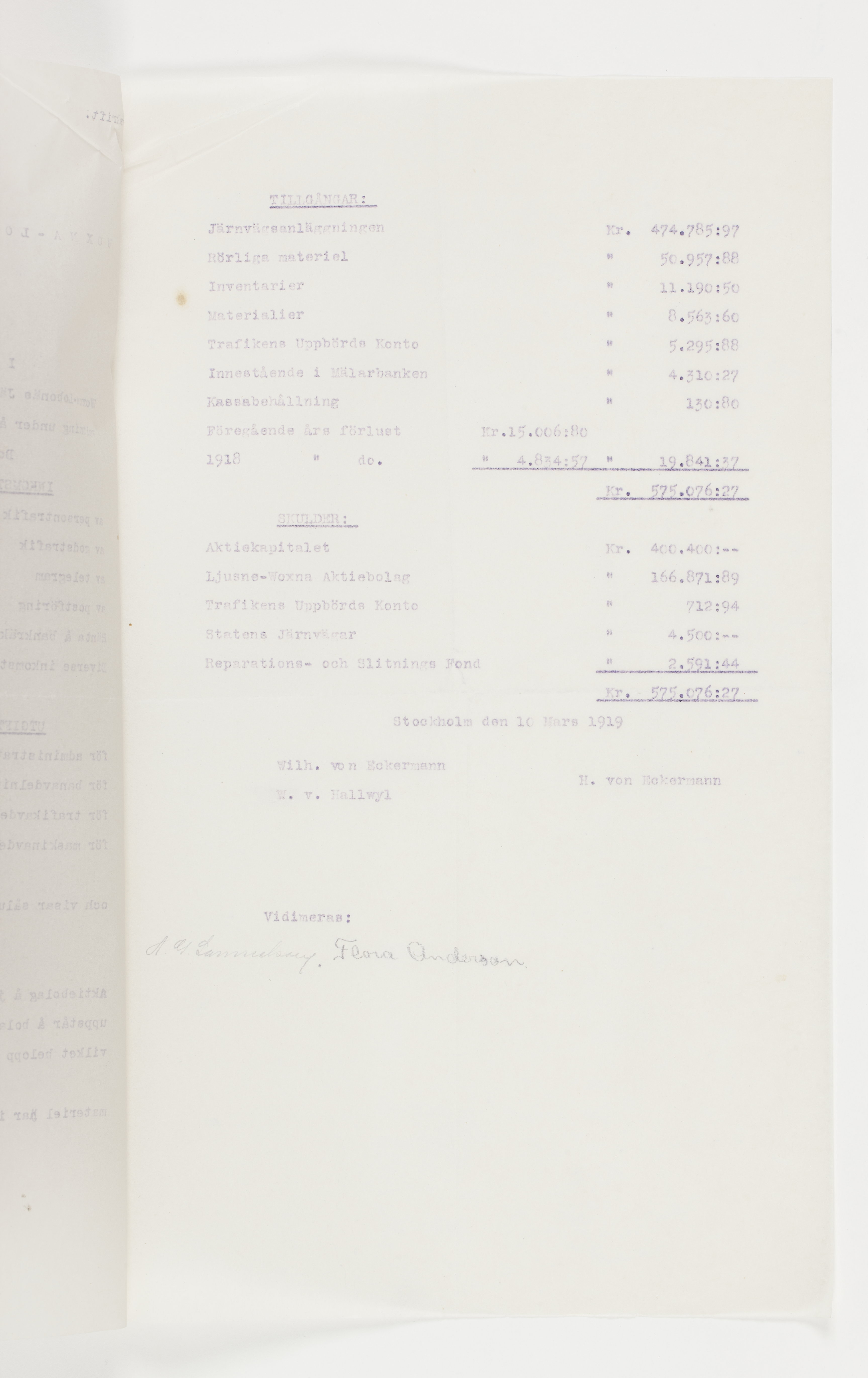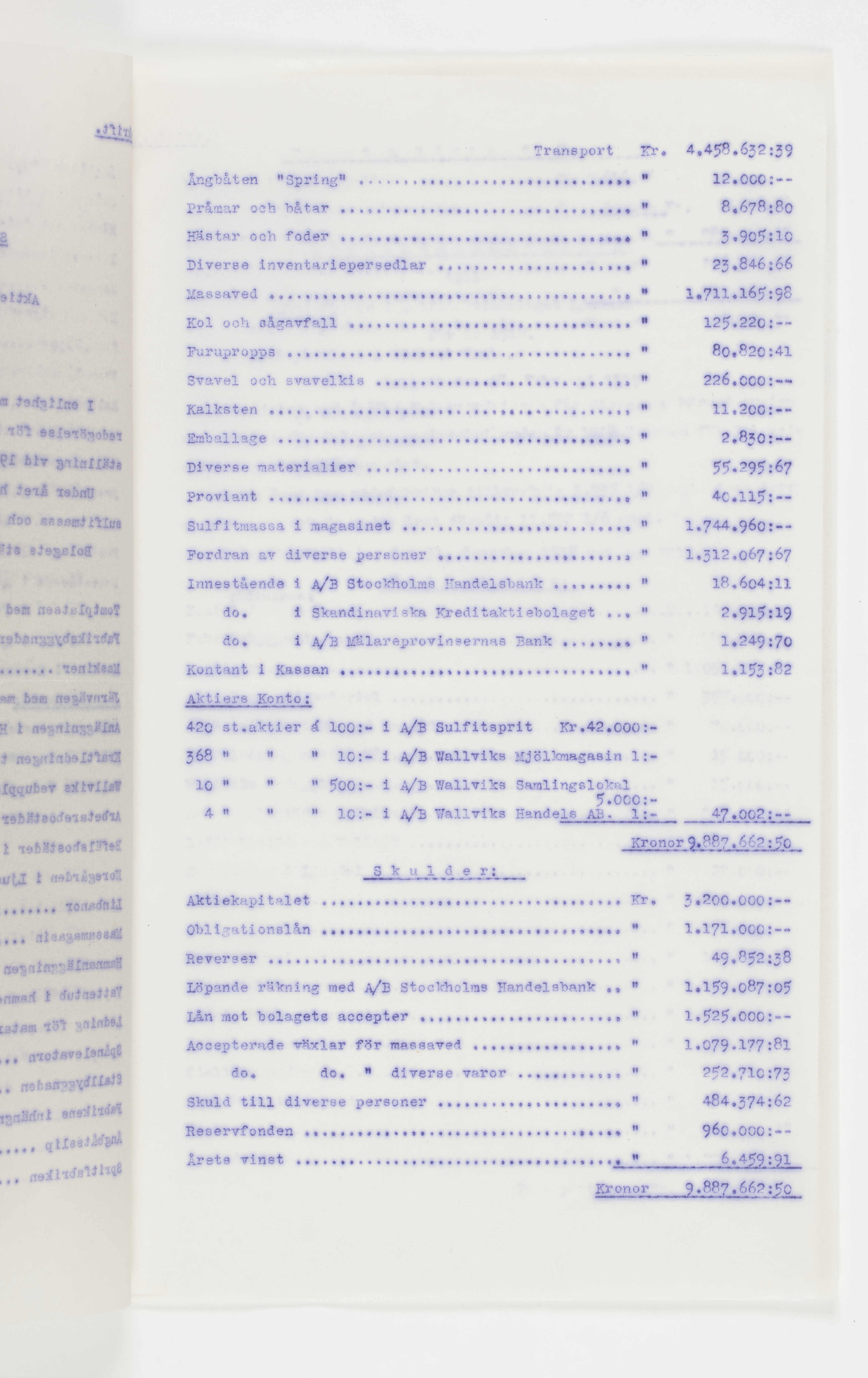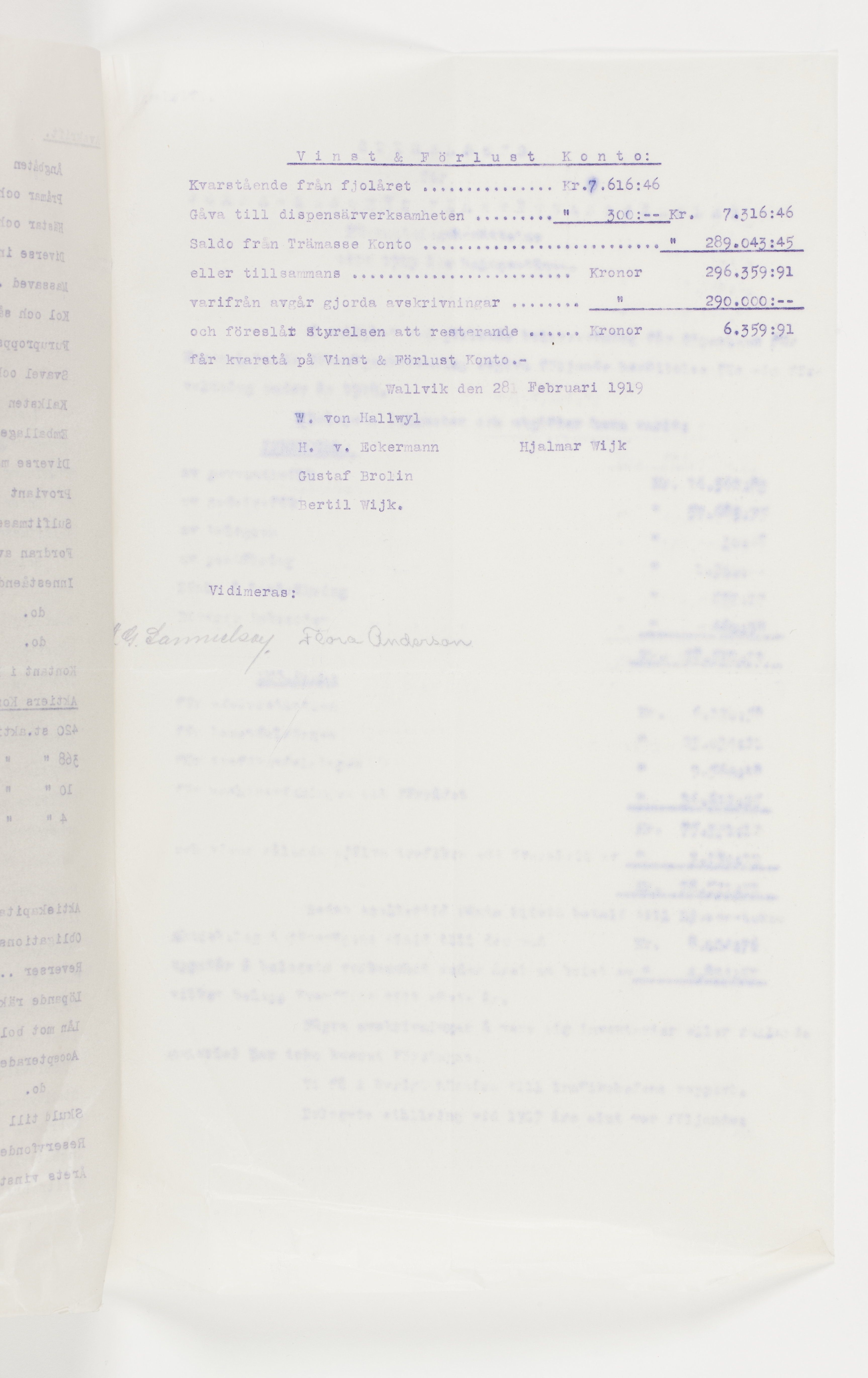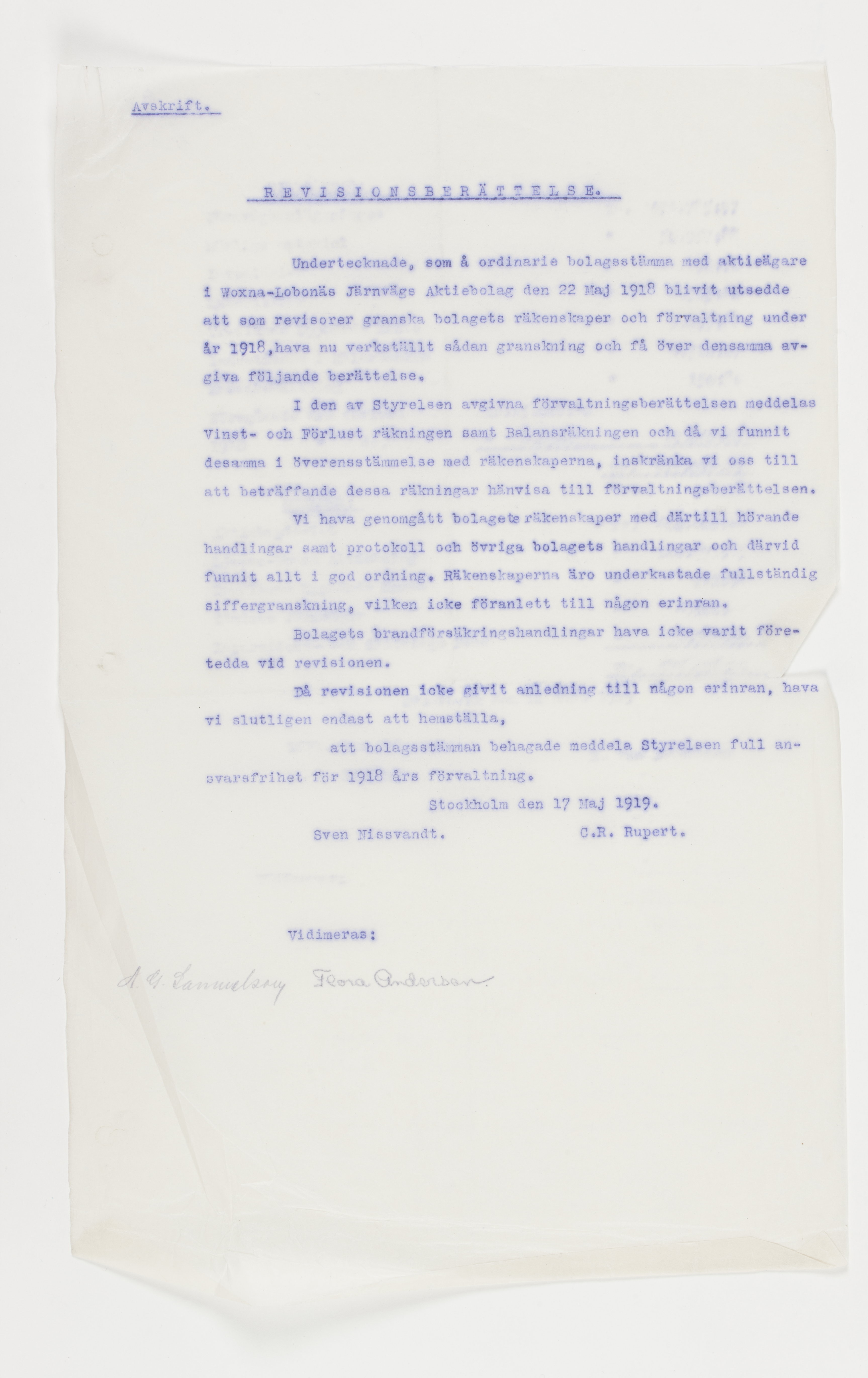 Föredragningslista vid ord. bolagsstämma med Ljusne-Woxna AB. 6 juni 1919, styrelseberättelse till aktieägarna i Sulfitaktiebolaget Ljusnan för år 1918, revisionsberättelse för Woxna-Labonäs Järnvägs aktiebolag, 17 maj 1919, samt styrelsens berättelse för det sistnämnda AB. Alla dessa avskrifter finnas i 2 ex.