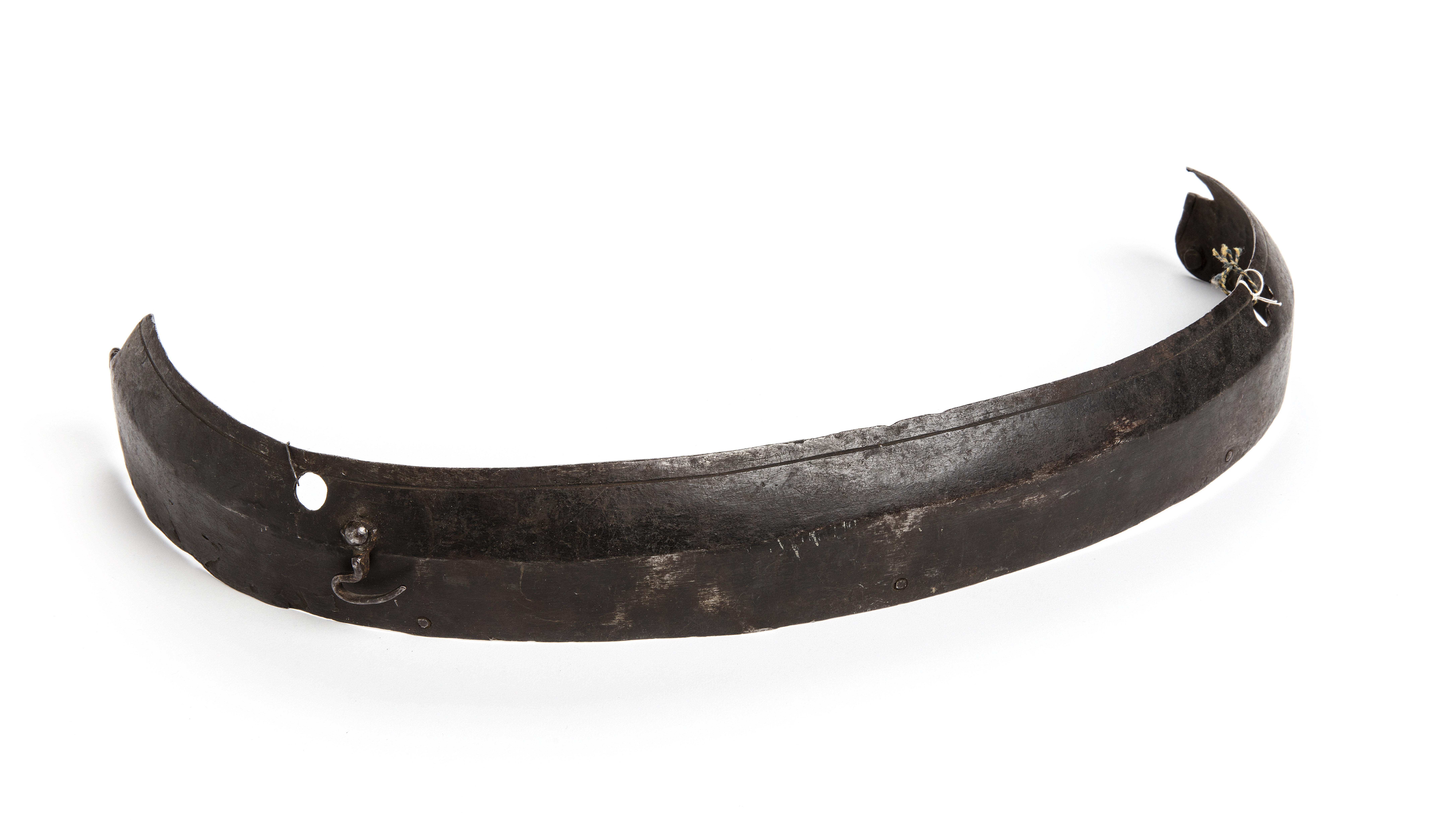 Mörk yta med filmärken. Filat spår i överkanten. Svagt uppsmidd horisontal ås längs skenan. Klackformat urtag i sidorma där nederdelens kant är vikt inåt med filat spår innanför. På höger sida är ett nyckelhålsformat horisontalt hål för harneskets fästsprint, och på vänster sidan är ett cirkulärt hål med en fastnitad smidd "hasp"-krok för harneskets hålsprint. I nederkanten på höger sida är en grov utsmidd nit. På insidan syns nitar och läderfragment.