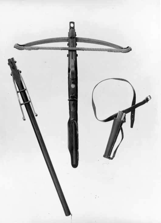 Båge av svärtat stål, fäst i häl i stocken med bult, inskruvad framifrån, platt, rektangulärt huvud med ovalt huvud. Sträng av hampa. Lås med nöt av stål, ciselerad med prickmönster. Dubbla avtryckare med justerskruv. Pilhållare av svärtat stål. Utvändig säkring. Kraftig stock av brunt trä (valnöt?) med kindstöd och engelsk kolv med nätskuren hals. På kolvens högra sida snidat en springande hjort, omgiven av ek- och lagerblad i relief mot nedsänkt botten. På stockens sidor snidade eklöv och ekollon. På stockens ovansida en pilränna av svärtat stål med pilläge likaså av svärtat stål. Bakom nöten fortsätter pilrännan i en stålskena. Framför pilläget stämplat: "FERD. GAREISSEN 11 MÜNCHEN". Bakom nöten är infällt en rund silverplatta, graverad med svenska riksvapnet. Därbakom ett fällbart, inställbart dioptersikte av svärtat stål med skålformig, rund skiva av bakelit(?). Stockens framände är beslagen med svärtat stål, hålet där bågen är fäst är skott med graverade plattor av samma material. Varbygel av svärtat stål.