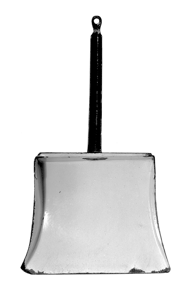 SOPSKYFFEL Av emaljerad stålplåt; emaljen utanpå gråspräcklig, inuti vit. Blad fyrsidigt, något nedsvängt, med rak fram- och bakkant samt insvängda sidokanter, längs dessa och bakkanten en snett uppstående uppvikt sarg, denna längs bakkanten med utvikt överkant. Skaft blåemaljerat, rännformigt, med kälformig över- och stavformig undersida, på ytteränden en platt ögla, vari ett runt hål; skaftet fäst vid bakkanten medelst en från skaftet nedvikt tunga, fäst med tre nitar. Längd: 52 cm. Blad, bredd: 30 cm. Skaft, längd: 28cm