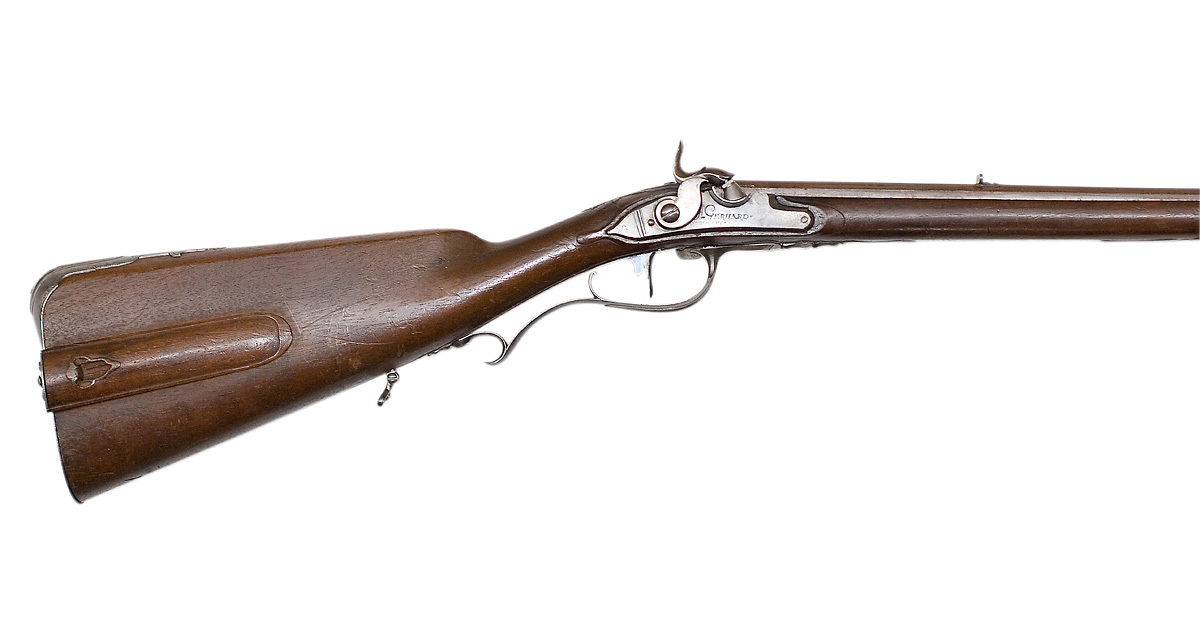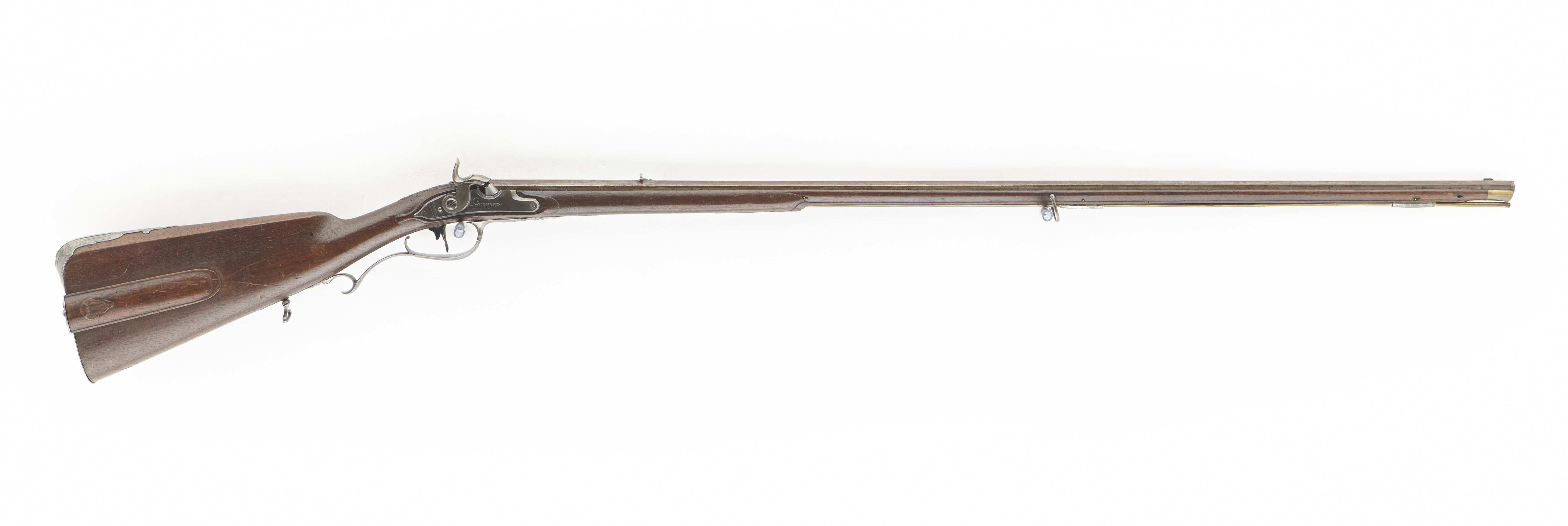 Åttsidig, brunerad, räfflad pipa, åtta räfflor, svansskruvblad med rundad spets, siktskåra över pipbasen. På kammarens h. sida fäst konisk snäcka med tändhattsnippel. På kammarens undersida stämpel: M C. Riktmedel: Inlaxade siktmedel, ståndsikte av stål, stolpkorn av silver. Fästning: Tre häften. Pipan fäst med krysskruv, två pipstift samt däremellan främre rembygelns skruv. Slaglås ändrat från flintlås. Plant låsbleck med fasade kanter, försänkt bakspets, enkel, graverad dekor, blad på spetsen. Framför hanen graverad signatur: "A. GERHARD // STOCKHOLM". S-formigt svängd hane med platt kropp, fasade kanter. Slaghuvud med mun med sidoslitsar, slätt fingergrepp. Blånerad hanskruv. Fals till fängpanna. Nöt med yttre springkil. Fästning: Två låsskruvar. Blånerad avtryckare. Helstock av valnöt (?), kolv av fransk typ med kindstöd och kolvlåda. Snidad dekor, bladrankor vid kindstödets båda ändar samt svansskruvbladet, snidat fingergrepp på kolvlådelocket. Snidade lister med konturerade spetsar runt varbygel och ladd- stocksränna. Beslag av stål. Bakplåt med list över hälen, flik på kolvryggen avslutad med bardisanliknande spets, graverad kantdekor, två skruvar. Sidbleck med ovalt mittfält, vid främre skruven odjurshuvud, vid bakre genombrutet rankverk. Två kantiga rörkor. Näsband av ljust horn. Blånerat avtryckarbleck. Varbygel med platt, åtta- formig främre arm, brett fasade kanter, urneformig spets, bygel med profilerad mittlist övergående i fri bakre arm med omvänt c-formig stolpe. Bakom varbygeln en rembygel, den andra bakom bakre rörkan. Tillbehör: laddstock av mässing, L: 829 mm, i bakänden fäst ett invändigt gängat rör, L: 103 mm.