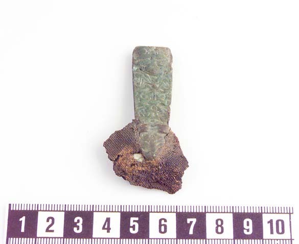 Remändebeslag i Borre-stil med fastkorroderade rester av remsölja och linnetyg samt rester av bältesremmen.