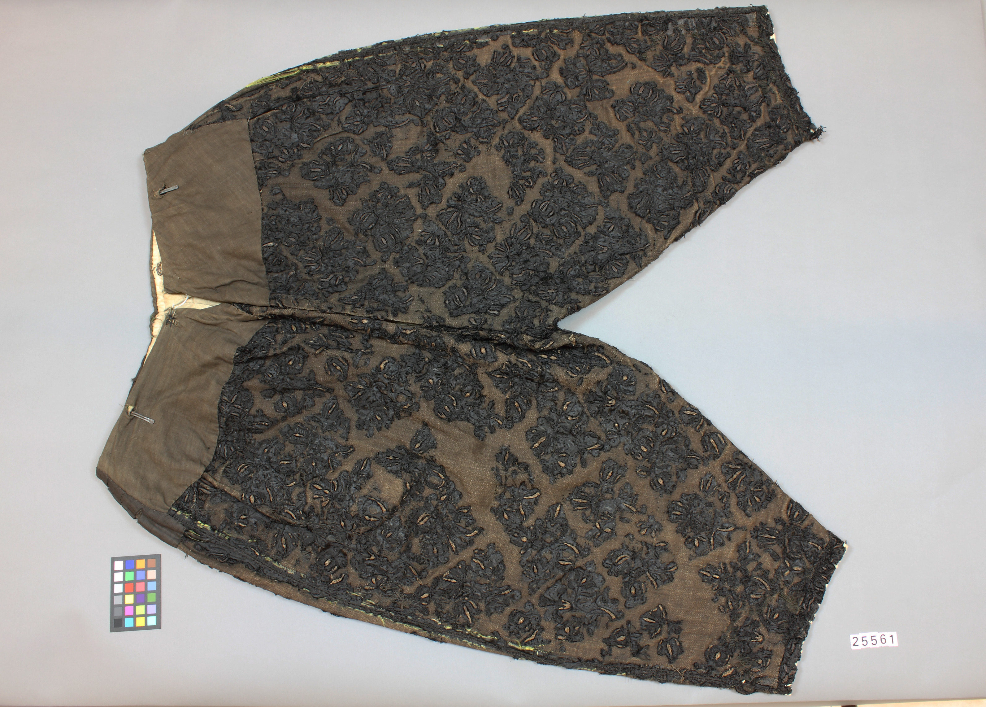 I gula liggaren kallad Burgundisk dräkt samt felaktig attribution till Gustav I. Enligt gula liggaren gåva av Gustav III. Se vidare angående historien kring detta enligt litteraturförteckning nedan. Knäbyxor av smal modell, av svart siden med delvis bortnött broderi i svart silke samt brun lintråd. Uppfäst på brunt linne, troligen senare. Knäppning fram med hake och hyska. Öppen gylf, längd: 320 mm. Linning av brunt linneband, som fortsätter ner på sidorna, 145 mm brett mitt fram. Sex järnhakar runt om, för fäste i tröja, längd: 35 mm. Foder har enligt Lena Rangström varit av vit taft, nu av vitt linne. Veckat i linningen. Samhör med tröja nnr 25560.