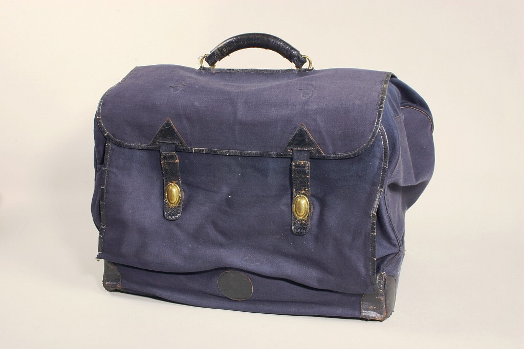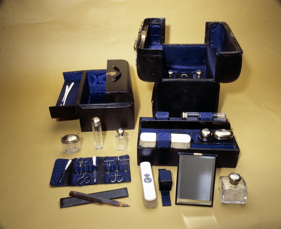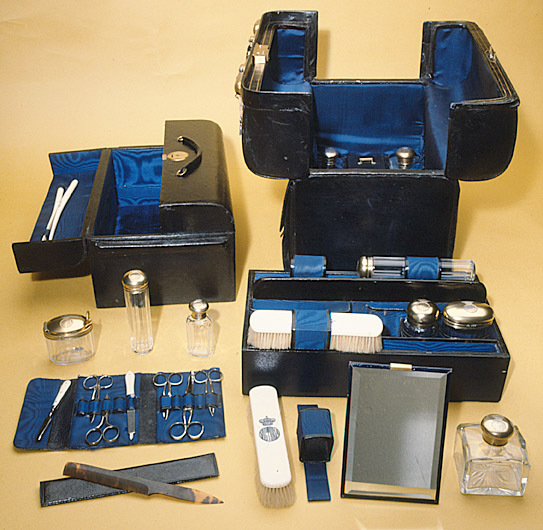 Formsytt fodral av blå bomullssatäng med flossad insida. Kortsidorna och hörnen förstärkta med blått läder. I botten en tygklädd pappskiva med mässingsnit i mitten, av samma slag som de fyra hörnnitarna med välvda huvuden. I sömmarna läderpasspoaler.Under locket blå skinnfodring. Fodralet stänges genom att kortsidorna böjs upp och spänns fast med två resårband som krokas fastmed mässingskrokar. Sedan viks ena långsidan över och bildar lock, fästes på två mässingshakar med två läderstroppar, förlängda med resårband, . På lockets ovansida ovalt skinnskott hål för handtag. Hålet förslutes med halvovalt lock. På locketsömmar efter bortsprättat handtag.