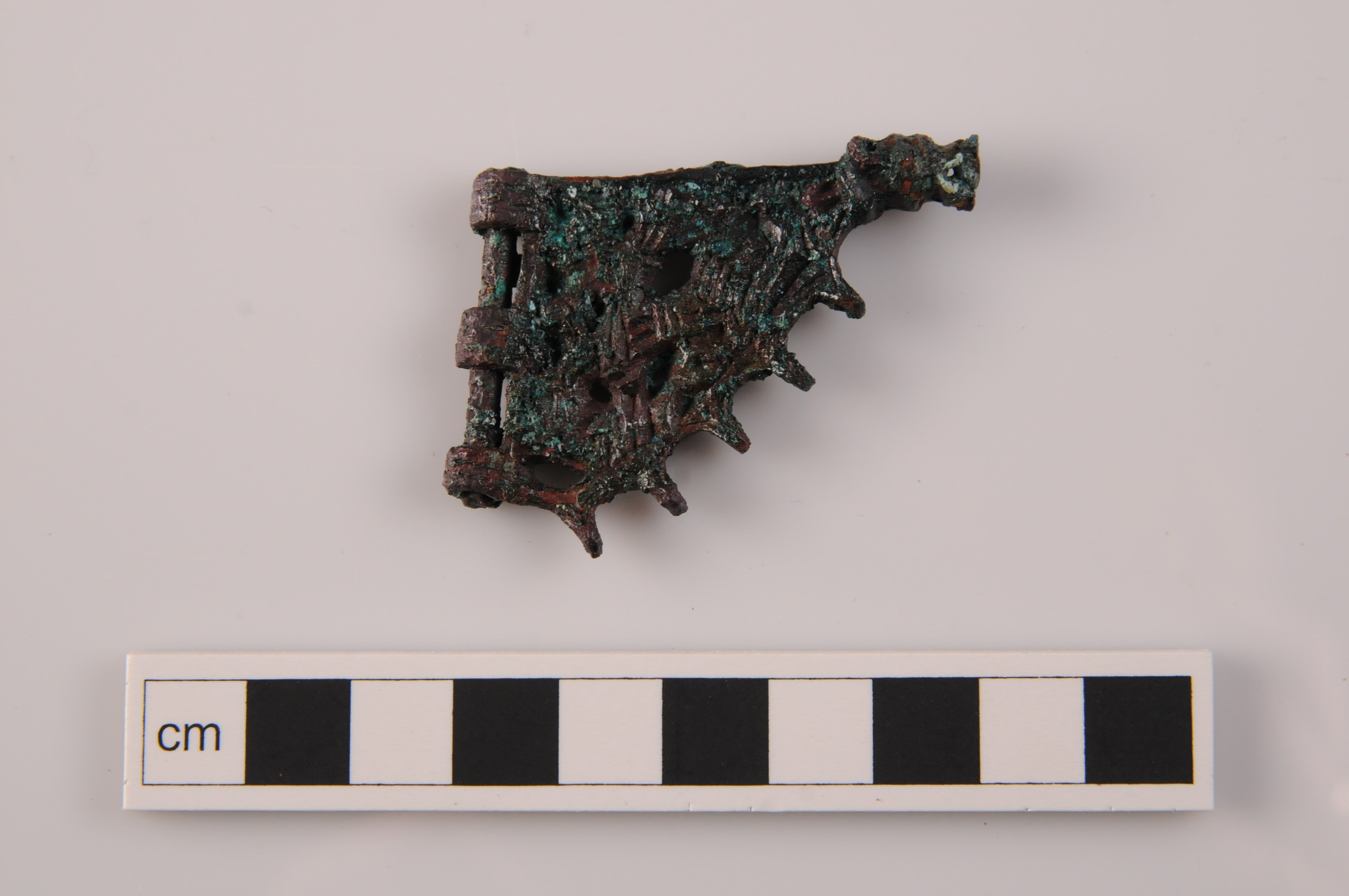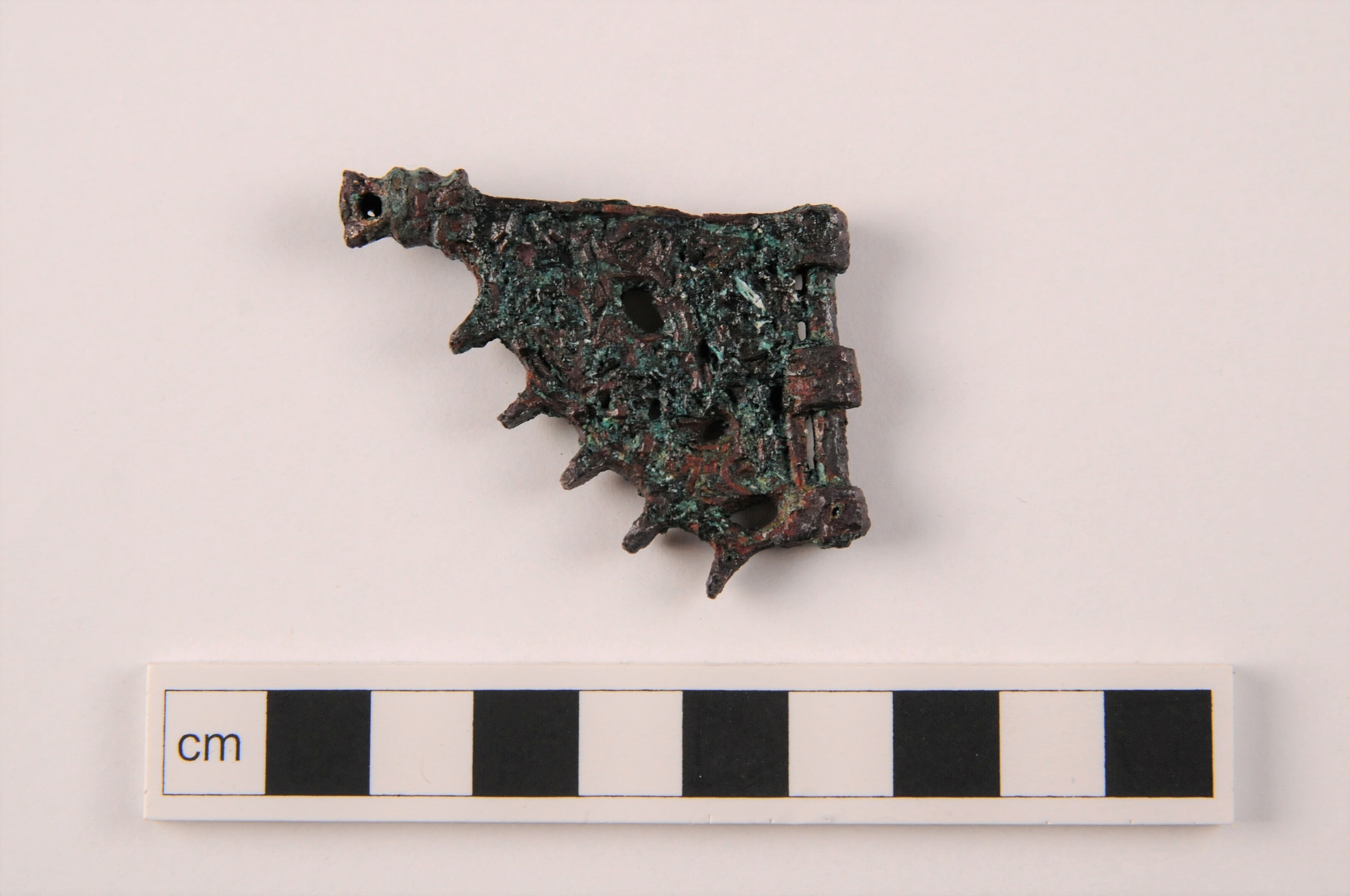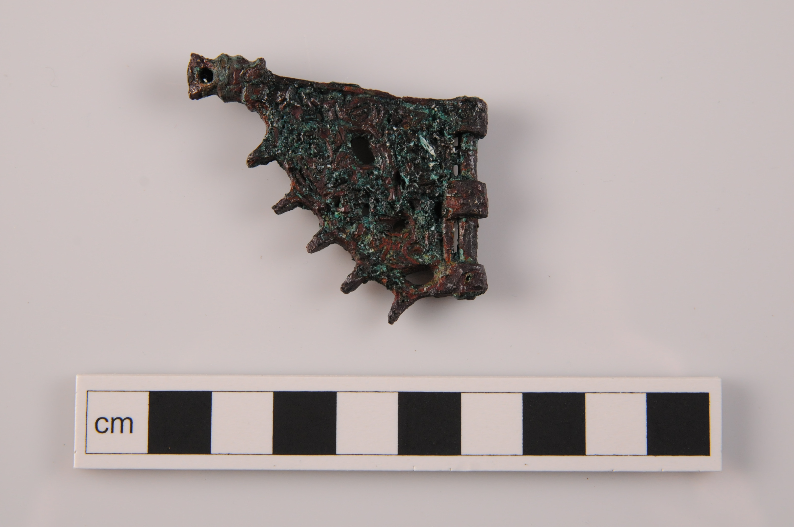 Miniatyrflöjel av brons, med gripdjursornamentik och gångjärn. Ornamentiken är i Borrestil, Gravfynd från Söderby, Lovö socken, Uppland.