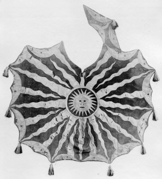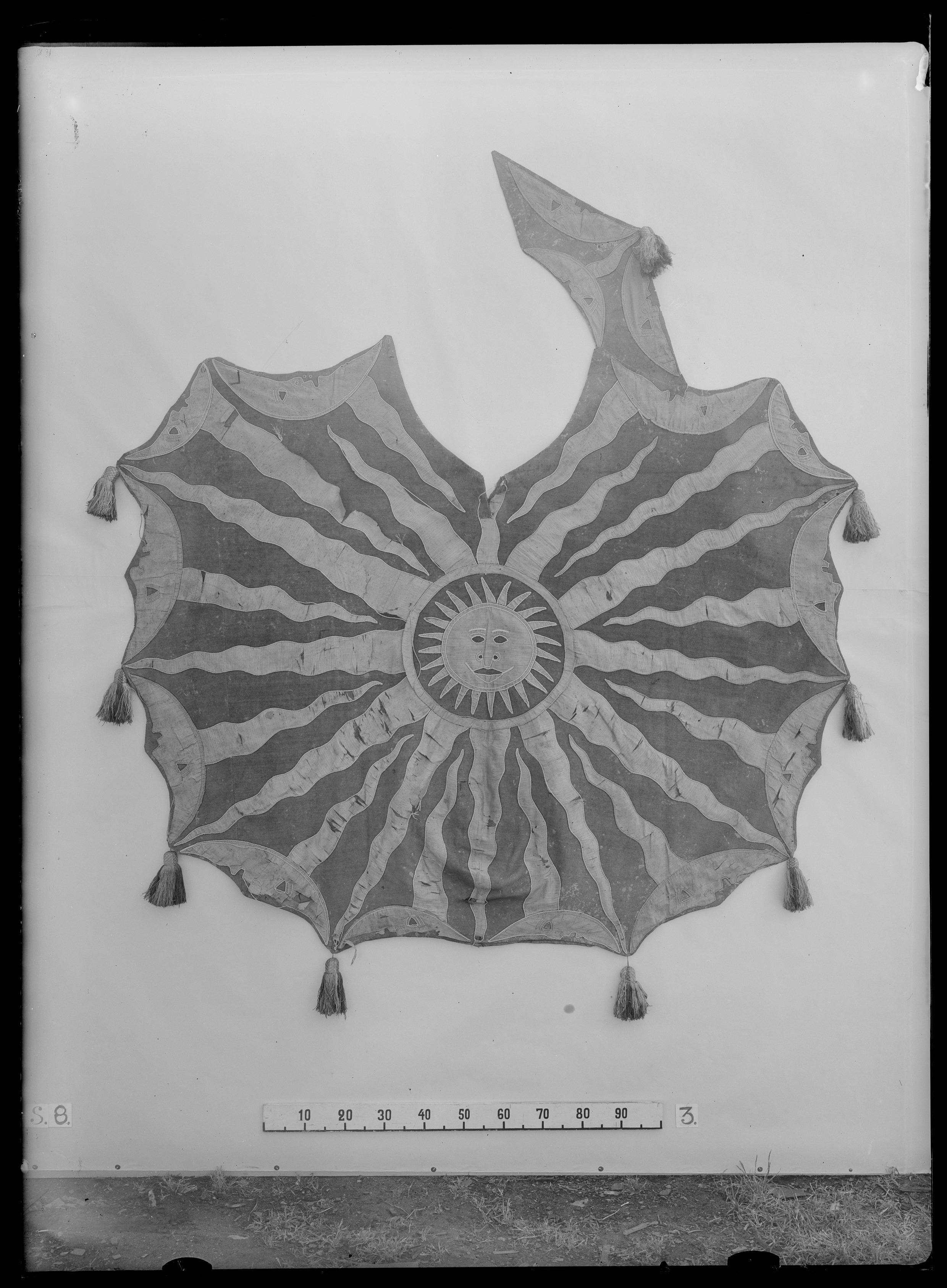 Bottentyg av rött kläde med applikationer av ljusblått taft med ljusa 2 mm bredasilkessnoddar i kanterna, även som konturer av ansiktsdetaljer. Centrerad bildad sol med en diameter på ca 400 mm med tolv utgående vågformadestrålar som är bredare vid basen och spetsiga mot täcktets ytterkanter. Längsytterkanterna tolv bildade månar, åtta större och fyra mindre, och tre stycken påbogstycket, medansikten vända utåt. Från varje månrygg utgår en stråle som spetsigtavslutas mot solringen. Varannan stråle går mot solen och varannan ifrån. Bogstyckethar en liten stråle. Vid den strålens spets en tofs och i täckets sidor avslutasvarje stråle från solen med en tofs, 150 mm lång med snodd, av silke i brunt, beigeoch blått, de övre 35 mm har ett sammanhållande nätverk. Fyra tofsari var sida. Entofs även med rött silke. Längs bogstyckets ytterkant och i ytterkanten längs förstavänstra månasiktet genom bottentyget och fodret sex parvis sittande hål kantade medkaststygn, ca 4 mm i diameter. I slutet av bakre kantens mittstråle två likadanahål. Diagonaler, bogstycke 790 mm. Foder av blått linne i tuskaft, vådbredd 800 mm.