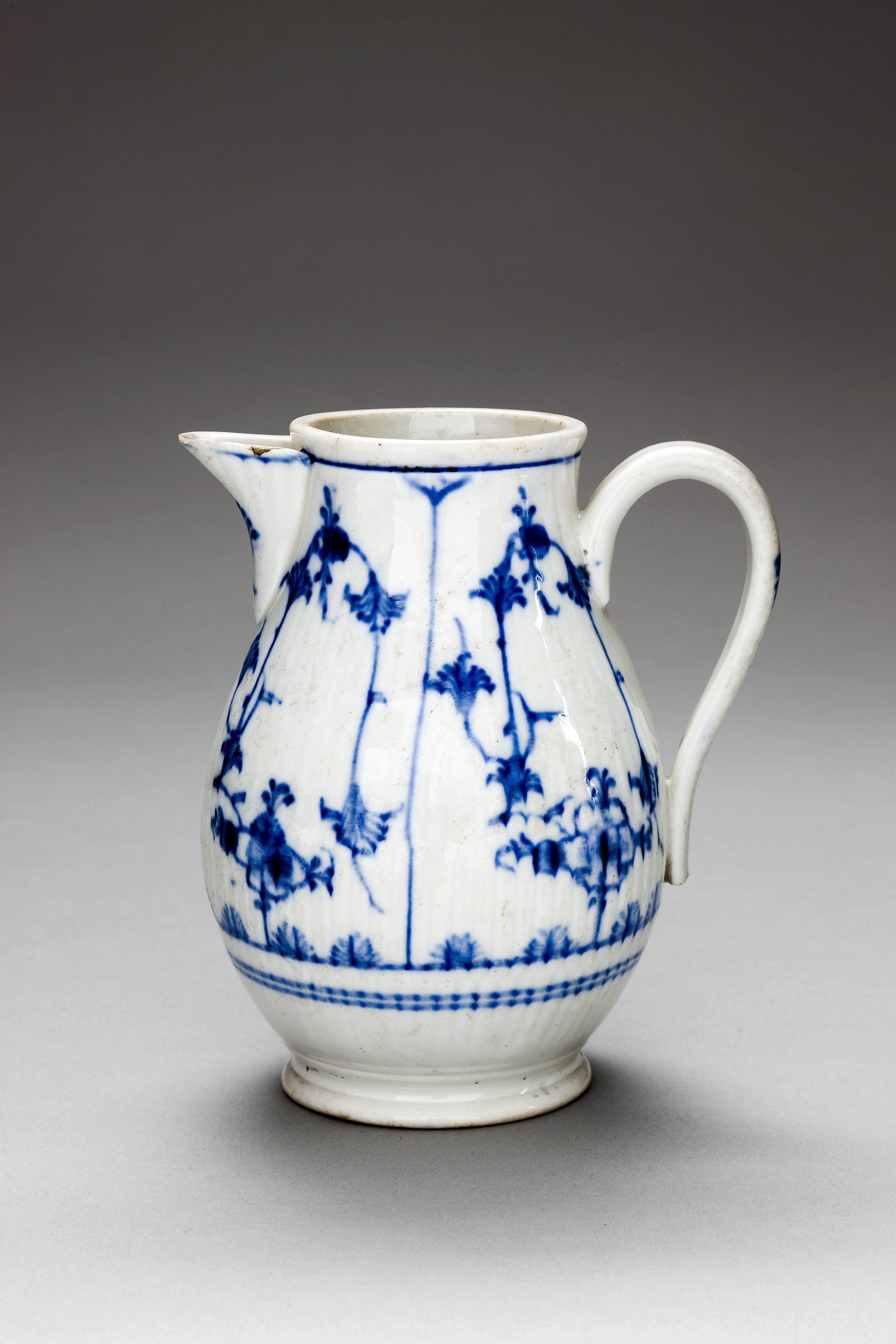 - Päronformig, med svagt utsvängd mynning samt å stafformig fotkant. Pip insvängd. Henkel flackstafvig, af långsträckt öronform. Å utsidan fyra öfver hvarandra ställda hvarf af vertikala flacka stafvar; å pipens öfre del dylik reliefdekor. (Lock saknas.) Dekor: I blått under glasyren. Rundt mynningen samt pipens öfverkant en rand, rundt kannan under henkelns nedre fäste tre dylika, de två nedre tillsammans, den öfre med uppåtriktade palmetter. Mellan den sistnämnda randen och mynningsranden växtdekor, å hvarje sida i två fält, delade af en upptill tvådelad längdgående rand. Växtdekoren i hvarje falt bestående af en i hög båge böjd stjälk med solfjäderformiga blad; nedtill mellan stjälkens ändar en blomma med fyra ståndare. Å pipen ett palmettliknande ornament; å henkeln ett något mera långsträckt, nedåtvändt dylikt. Å bottnens utsida i blått under glasyren fabriksmärke: dessutom ristadt: ^ Höjd: 13.3 cm.; diameter: 9.2 cm. Anm. En bit af henkeln afslagen nedanför nedre fastet. Å pipens öfverkant flisor urslagna. Å kannans insida till höger om henkeln en nästan rund oglaserad yta. Från slutet af 1700-talet. — Fabriken grundlagd omkring 1778 af majoren Anton Friedrich Wilhelm Ernst von Hopfgarten. Inköpt af Wilhelmina von Hallwyl, f. Kempe, 27 Maj 1896 hos antikvitetshandlaren Ed. Kahlert, Karlstrasse 14, Eisenach, Tyskland, (se räkning 8 Juni 1896) vid hennes vistelse i nämnda stad tillsammans med sin make, WalthEr von Hallwyl, 26—28 Maj 1^96 under deras resa genom Grekland, Macédonien och Serbien samt åter öfver Schweiz tillsammans med fröken Ida Uhse 15 Mars—6 Juni 1896. Förestående uppgifter lämnade med ledning af fröken IDA Uhses Reseanteckningar. Ankom ij Juni 1896. Betald samma dag, se Rescontra (Walther von Hallwyl). Pris: Mk 5, se räkning. bok_47_2|1931|XLVII:XII:J.a.01|BONDFOLK (Verliebtes Bauernpaar).|Stående, mannen med kvinnan vid sin högra sida samt hållande högra armen om hennes hals; bakom mannen en till sätet nående trädstubbe, bakom kvinnan en kal trädstam, båda som stöd. Å fotplatta. Färgerna på glasyren. Mannen med hufvudet vridet åt högra sidan, vänstra armen framför lifvet, i handen rest af ett afbrutet föremål, möjligen en bukett, vänstra benet något böjdt och framför det högra; mörkbruna ögon, grått hår, nedfallande på skuldrorna; svart hatt med bredt brätte, uppviket fram- och baktill, kort hvit rock med gula knappar och knapphål, hvit skjorta, svart halsduk, svarta knäbyxor samt hvita strumpor och svarta skor. Kvinnan med hufvudet vridet åt vänstra sidan, högra armen utåtförd, handen hållande om kanten på en korg, stödd mot högra höften, vänstra armen böjd framför lifvet, i handen ett päron, vänstra benet framför det högra; mörkbruna ögon, grått hår, till största delen doldt under en hvit hätta; åtsittande urringadt lif i hvitt med vertikala ränder i gult och brunrödt samt utan ärmar, därunder ett linne med halflånga ärmar, brun kjortel med gul nederkant samt hvitt förkläde, hvita strumpor och svarta skor, öfver axlarna en liten svart schal; korgen ljusgul med brun kant, af oval form samt fylld med päron i gult och rödgredelint. Å fotplattan tre strödda blommor i hvitt, rödgredelint och gult, vid mannens vänstra fot ett päron som de i korgen. Trädstammen hvit med rester af grenar i grönt. Fotplattans undersida oglaserad. Å plattans undersida instämpladt: IPlrn? Höjd: 24.2 cm. Fotplatta, längd: 15.8 cm.; bredd: 10.5 cm. Anm. Trädstammen afslagen och hopsatt. Från 1750-talets förra hälft, modellen sannolikt af Simon Feylner (Feilner). — Fabriken grundlagd 1746 af Adam Friedrich von Löwenfink, Johann Christoph Gölz och Johann Felician Clarus. Inköpt af Wilhelmina von Hallwyl, f. Kempe, från antikvitetshandlaren Ed. Kahlert, n. d. kaiserl. Post, Eisenach, Tyskland, se räkning 25 November 1890. Ankom 27 November 1890, se Rescontra (Walther von Hallwyl). Betald 24 December 1890, se Rescontra (Walther von Hallwyl). Pris: Mk 75, se räkning.