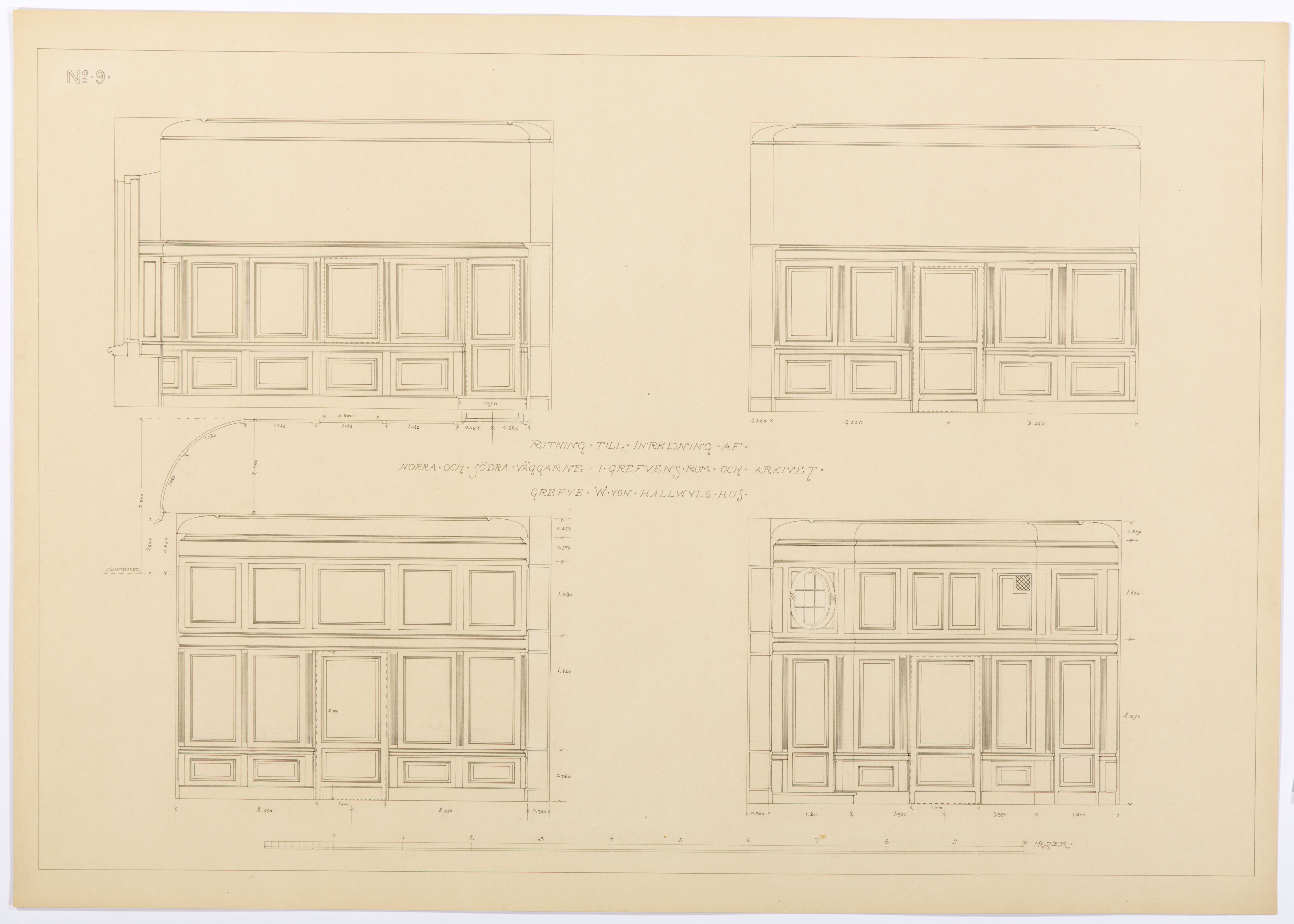 Nr 9. Ritning till inredninga af norra och södra väggarne i grefvens rum och arkivet. Huvudritningar