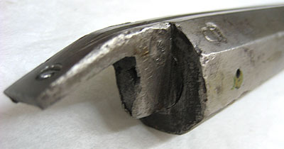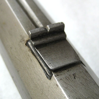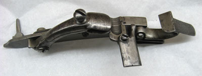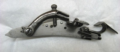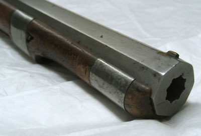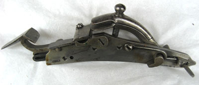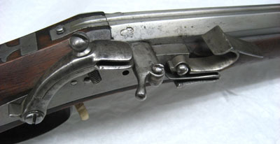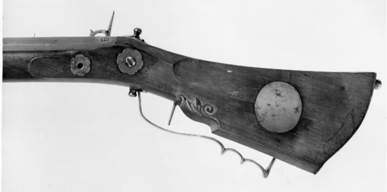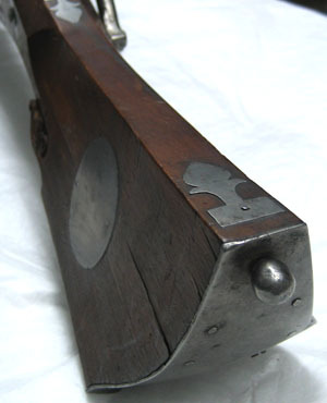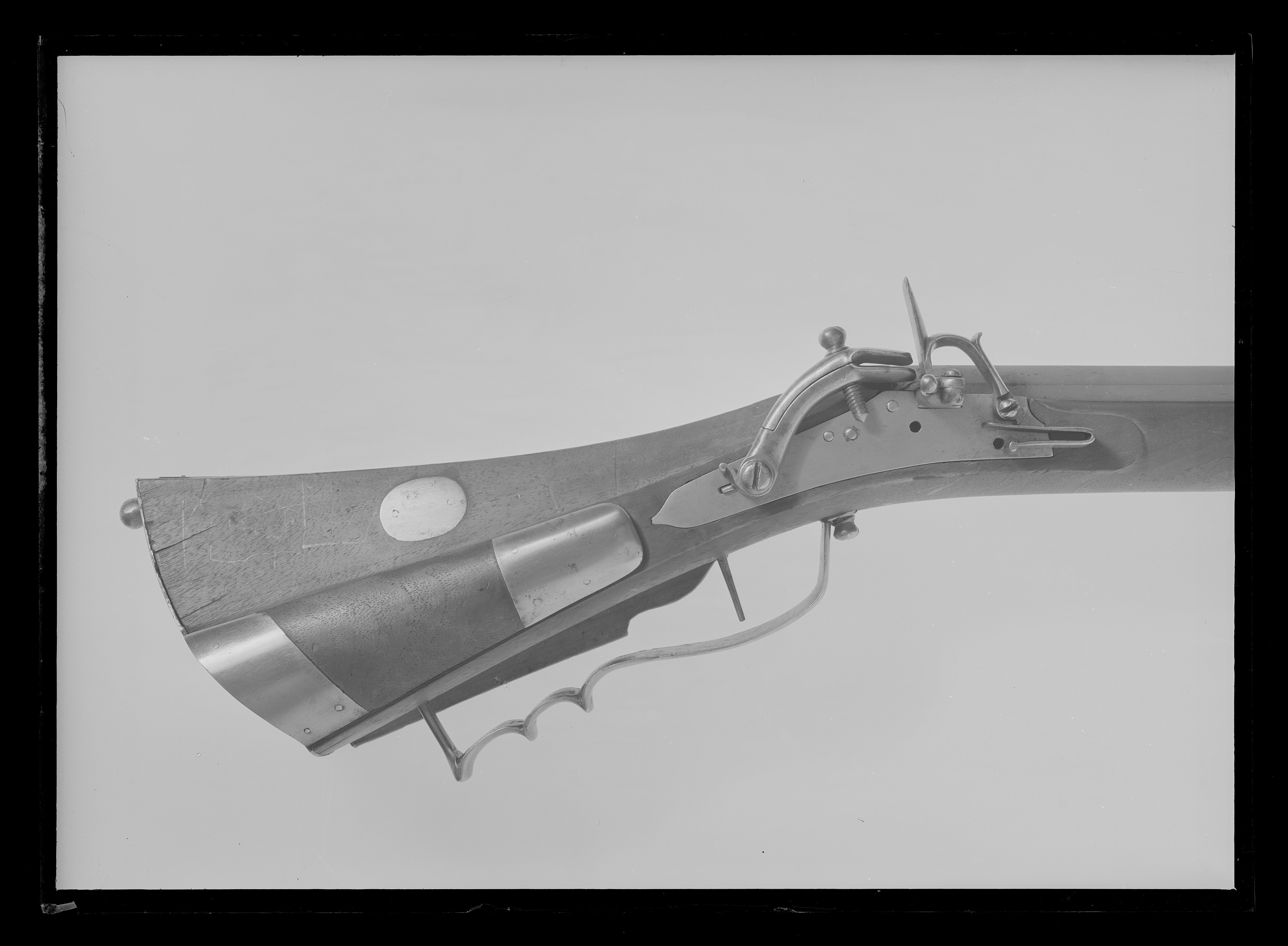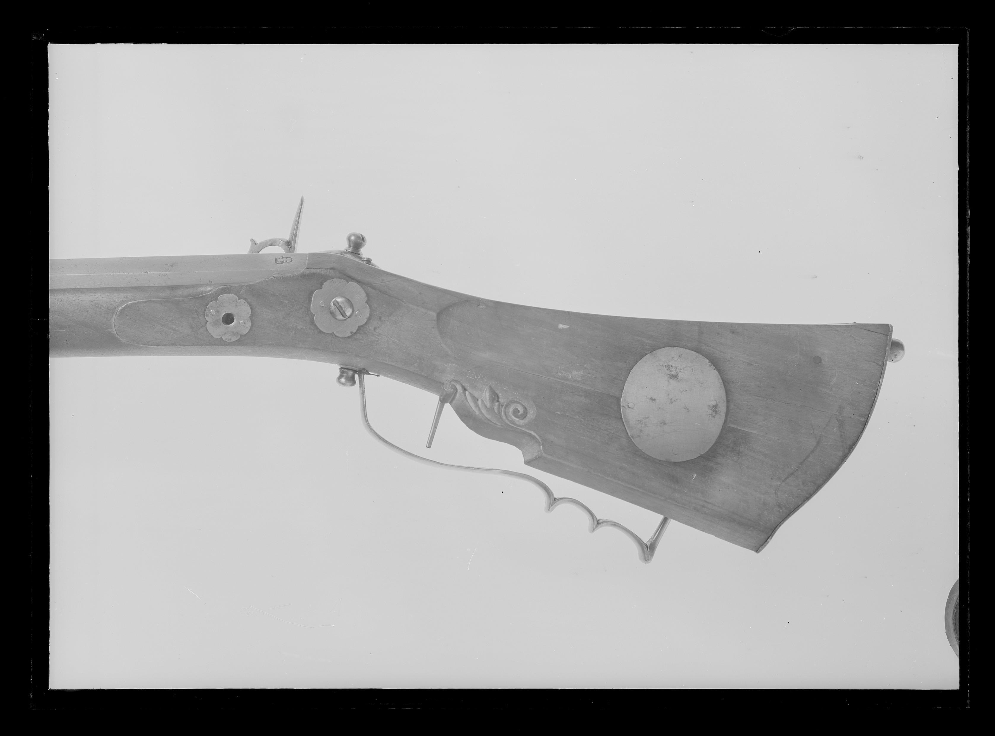 Pipa, åttkantig med svag trumf och åtta räfflor. Siktskåra från svansskruvbladet fram till siktet. På var sida kammaren inslagen stämpel: HHS över korsglob, riksäpple (liknar Stöckelnr 2901). Den på högersidan mycket otydlig. Pipans ovansida blankpolerad och undersidan mörkare och grov med tydliga filspår. Riktmedel: Enkelt sikte av stål och korn av mässing. Fästning: Tre pipstift av stål. Krysskruv från undersidan genom varbygeln. Låsblecket slätt och platt med något högre och kantigt mittparti. Bakre änden rundad med liten spets. Hanen svängd framåt i jämn båge, kropp och käkar släta. Häl formad som som liten volut. Skruvskallen päronformig med lätt fasade kanter. J-formigt eldstål med med trangulär fot och liten utåt svängd vinge på ryggen. Fjädern enkel med lätt rundade kanter. Rektangulär fängpanna och lock med i ena kanten utdraget fingergrepp med cirkulärt tvärsnitt och avslutat med liten kula. Inre delarna släta och enkla. Nöten platt utåt, rund ovansida med en klack åt ett håll. Avtryckarbleck saknas. Avtryckaren rak och slät med cirkulärt tvärsnitt och svagt avsmalnande nedåt. Fästning: En låsskruv, ursprungligen två. Helstock av triangulär typ tillverkad av mörkbrunt betsat trä, möjligen valnöt. Slät framstock med kanal för laddstock och rörka skuren ur stocken. Näsband och rörka av släta stålband. Kolvlåda i samma träslag med skoning i bägge ändar av slät stålplåt. Triangulär kolv svängd nedåt, sidorna svagt välvda, mot anslagssidan vinge med framtill skuren volut. Stockdekor av inlagd blank och slät stålplåt. På kolvens sidor en oval, den på anslagssidan större, l 52 mm. På kolvryggen ett ornament i var ände. Ornamentet liknar stiliserad lilja med vingförsedd hals och rektangulär liggande bas. Blomformiga låsskruvsbrickor. Slät bakplåt med stödkula. Varbygeln av slätt blankt stål. Svagt kantig övergång till främre bygeln. Två och en halv fingerlägen. Bakre stolpen rak med cirkulärt tvärsnitt och inslagen i kolven. Främre fästet inte mycket större än den timglasformiga skruvskallen.