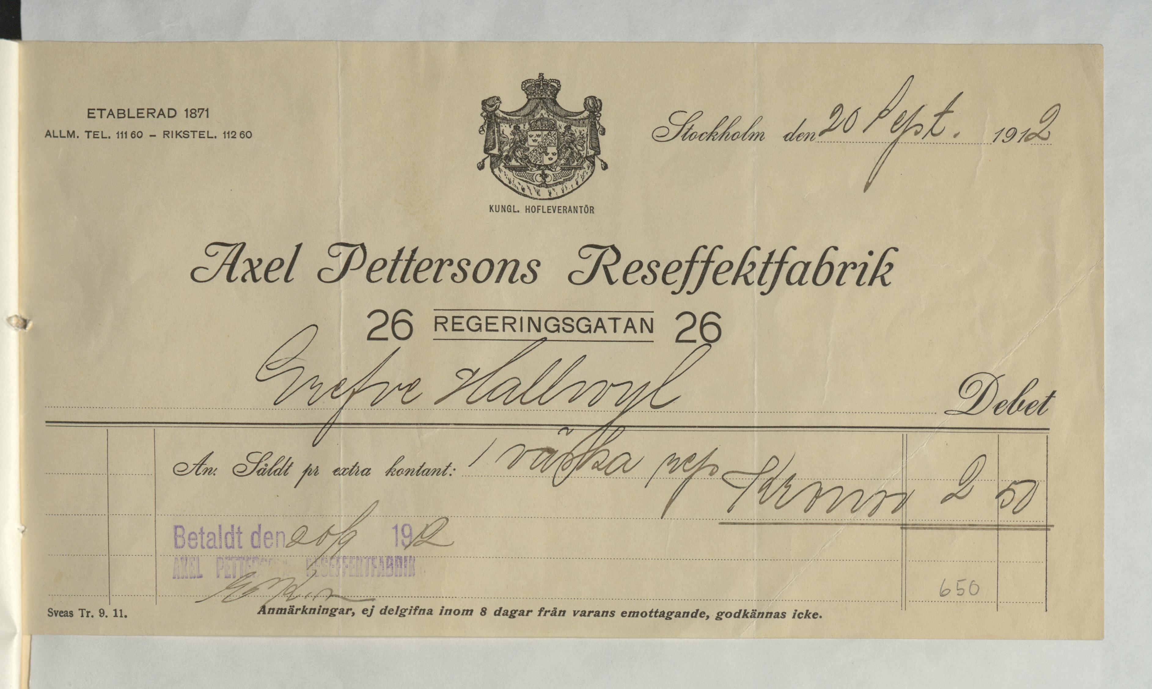 Kvitto från Axel Petterssons Reseffektfabrik, på 2:50Kr till Greve Hallwyl. Stockholm 20 september 1912.